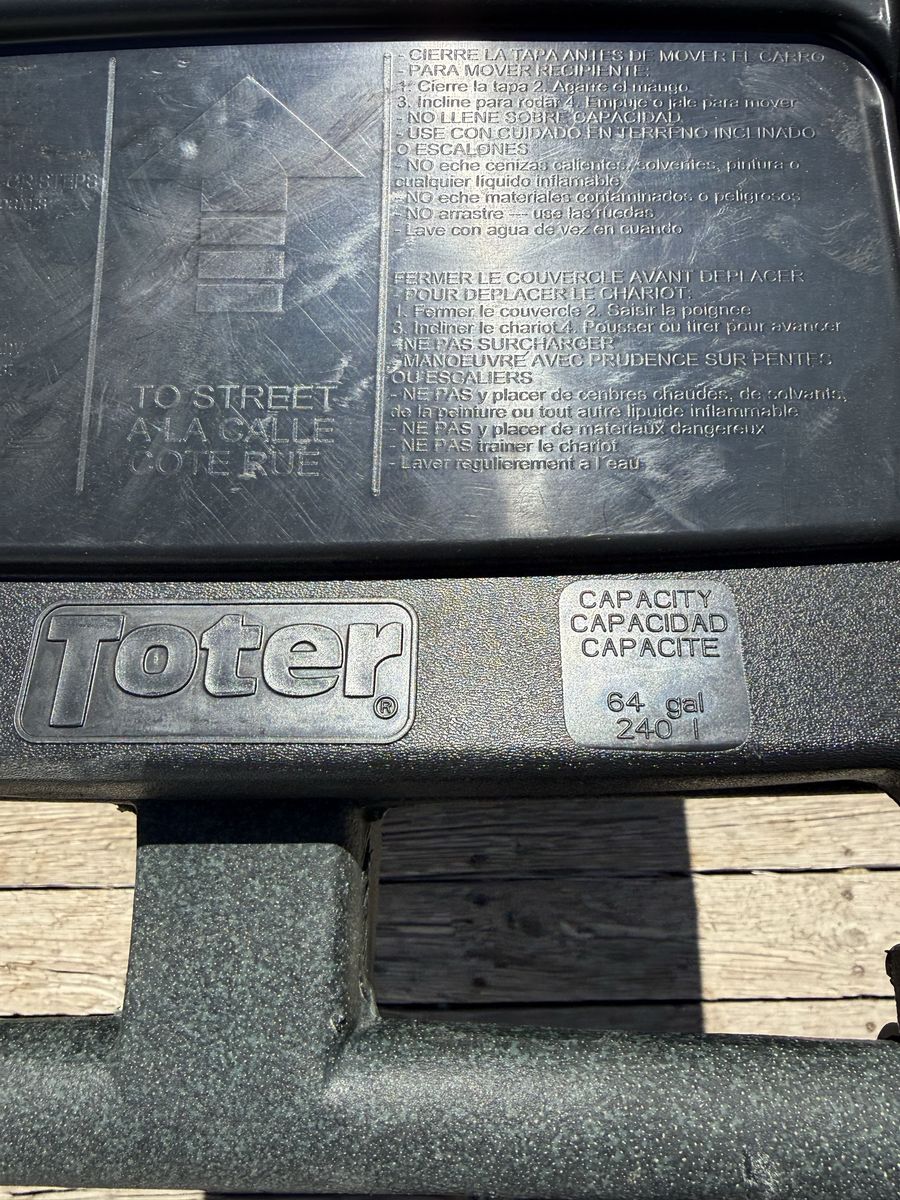 • Made with Advanced Rotational Molding, Toter cans are built for toughness and maximum impact resistance • Toter cans are flexible with a 360 degree rotating steel stop bar to bounce back from trash day, every day • Rugged Rim technology and reinforced material in critical wear areas adds rigidity and extends service life