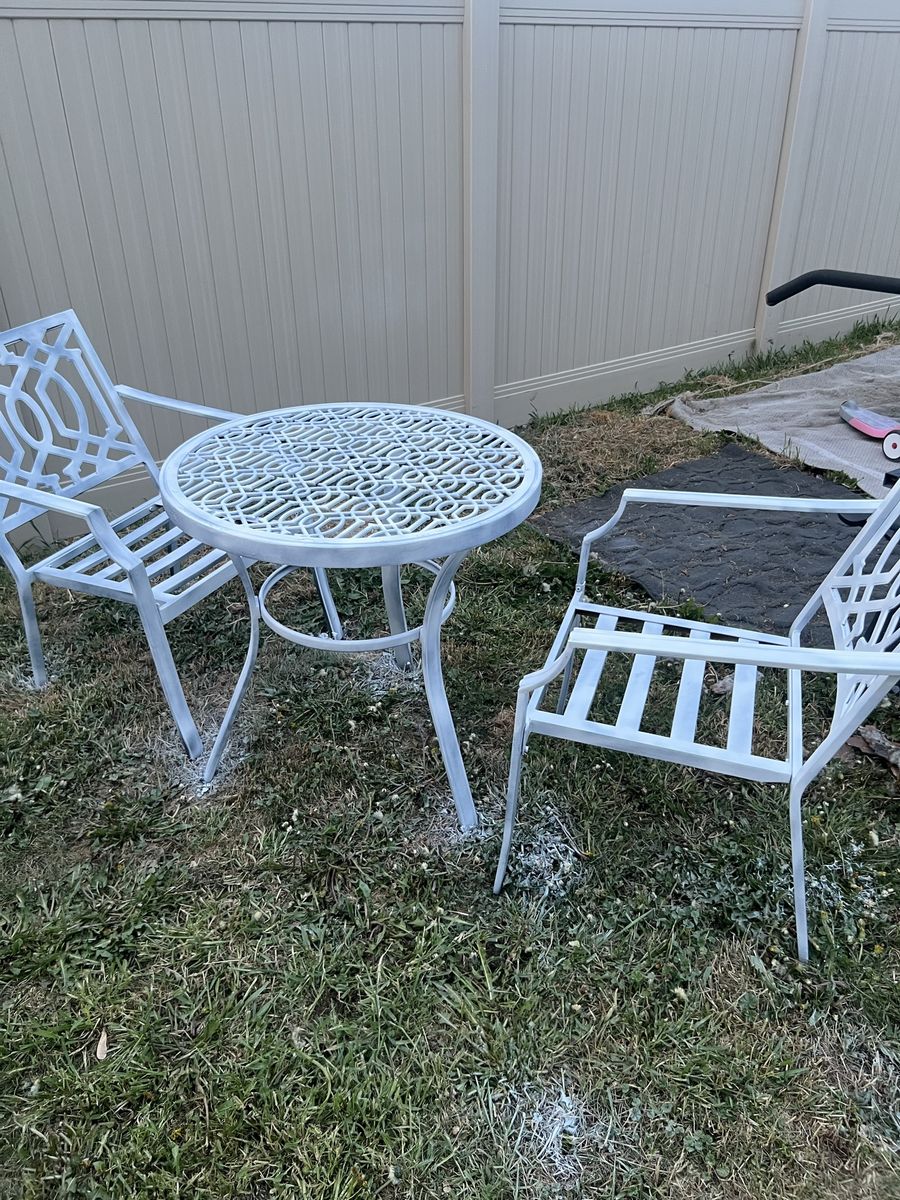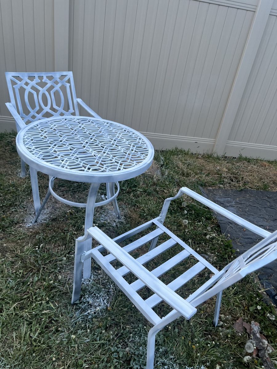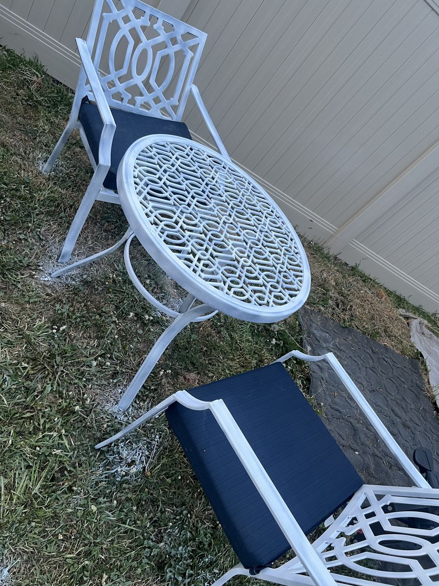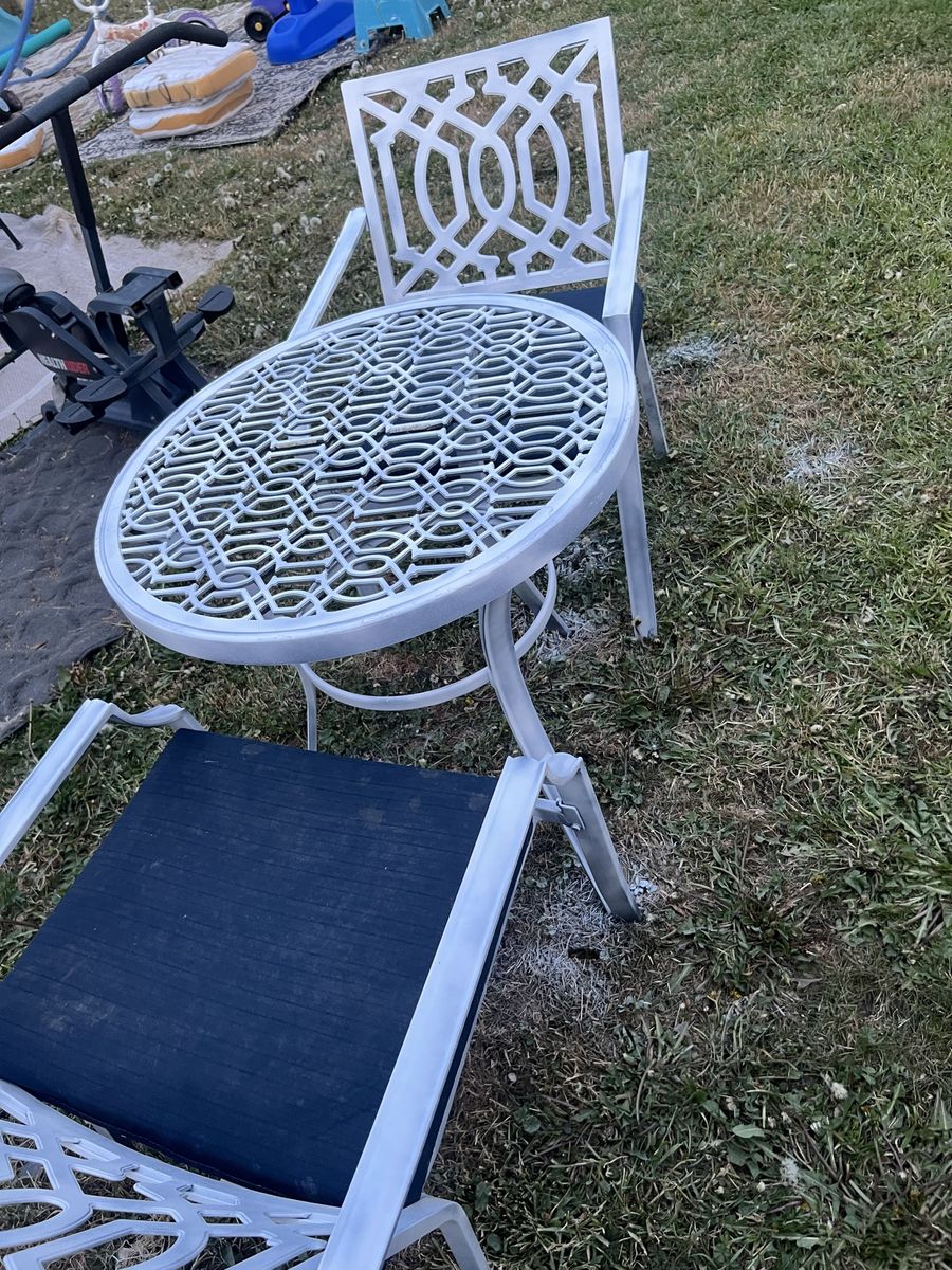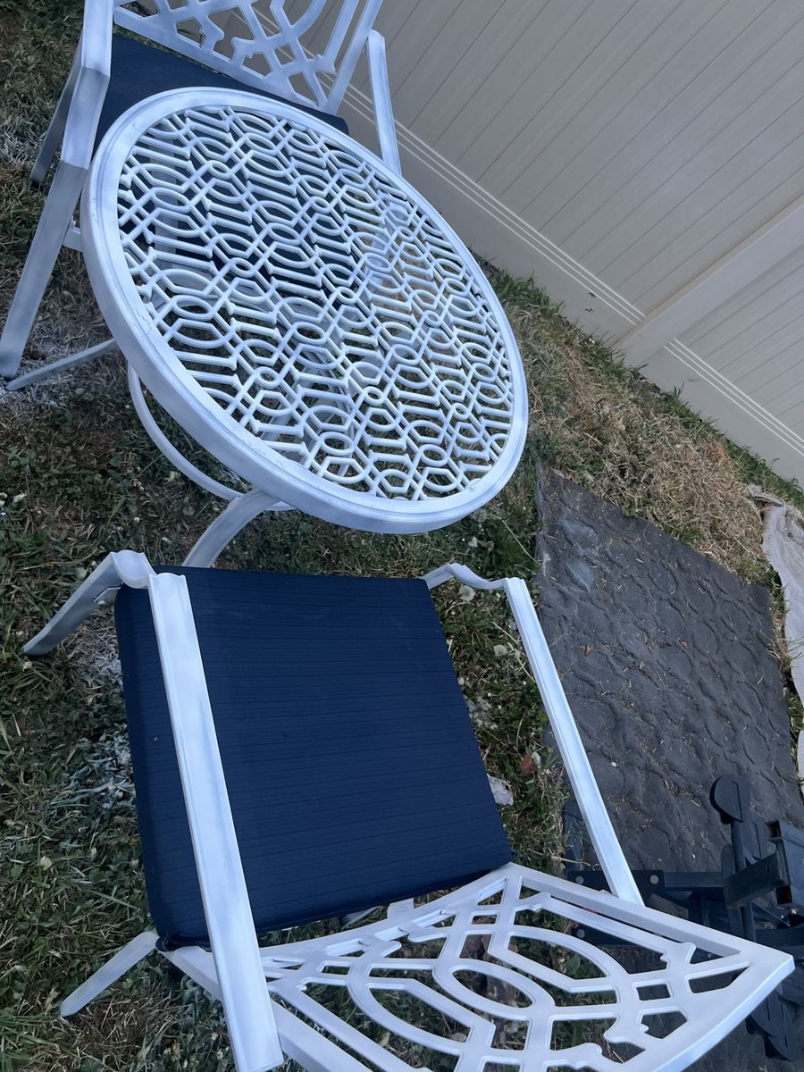 Zelle1 table and 2 pcs of chairs, table and chairs are all metal. And removable cushions