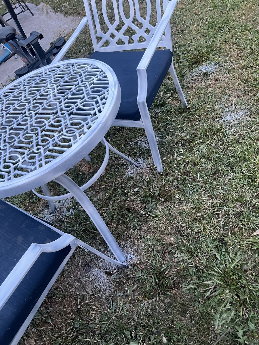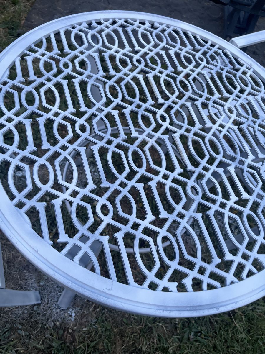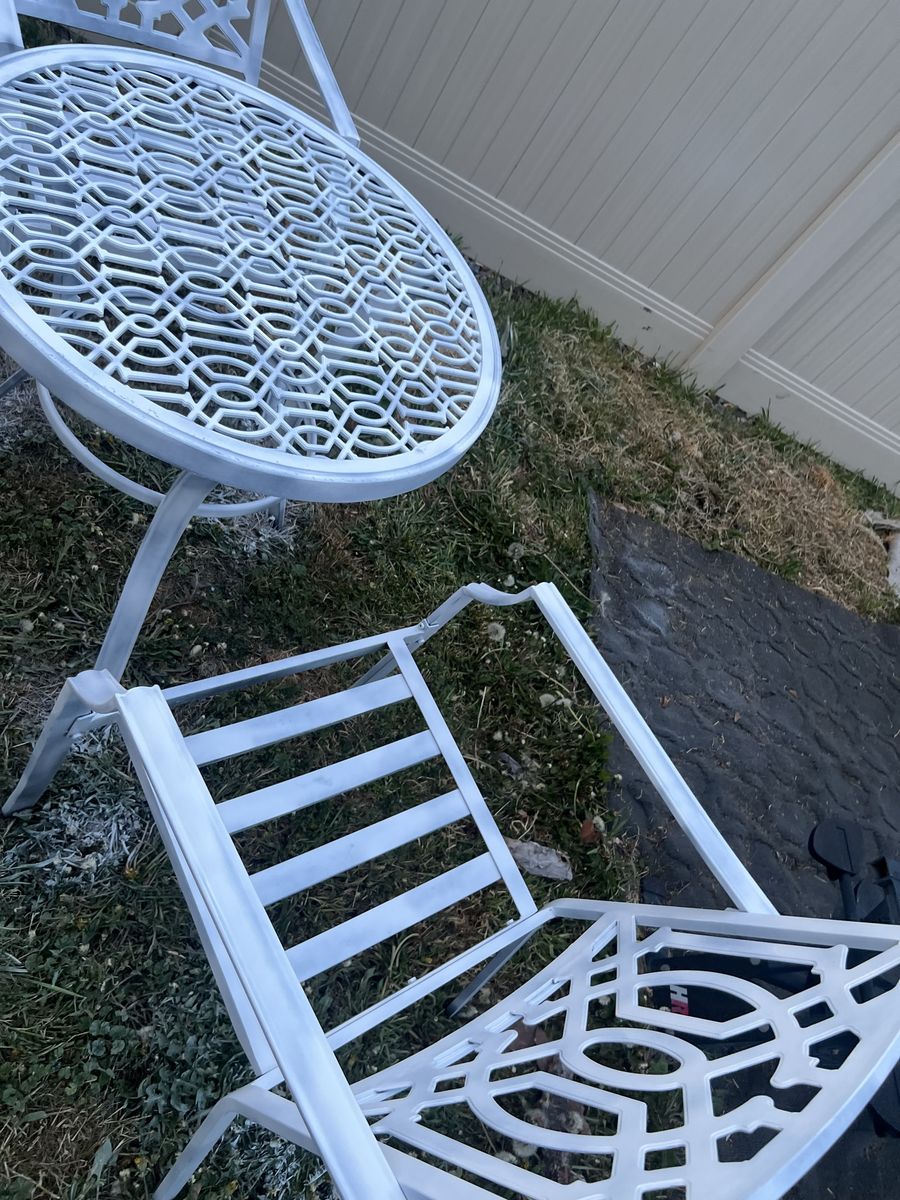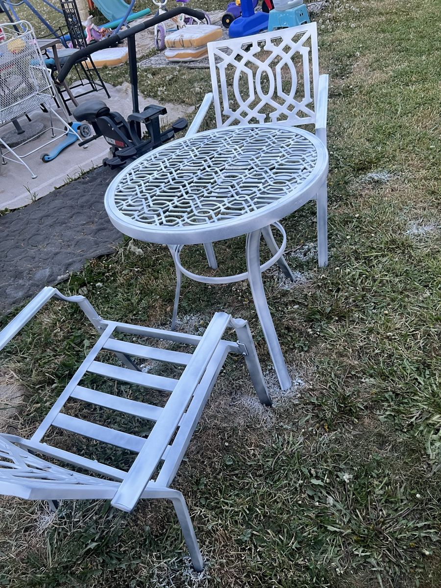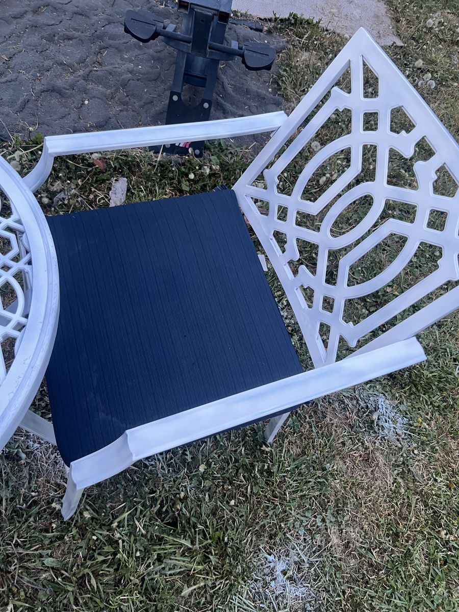 Zelle1 table and 2 pcs of chairs, table and chairs are all metal. And removable cushions