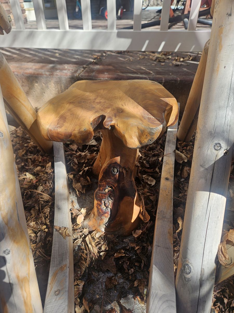 The table/stool is 14" and in great shape. It's made out of Cedar wood which is very durable in all weathers.