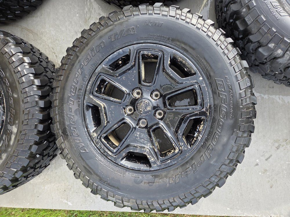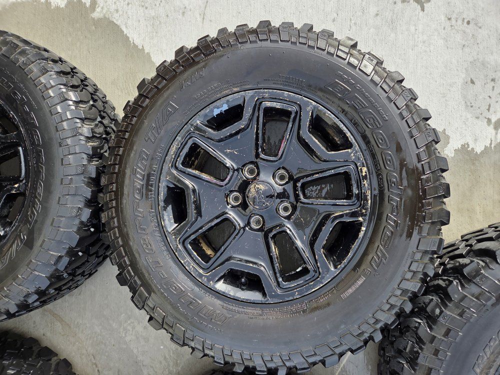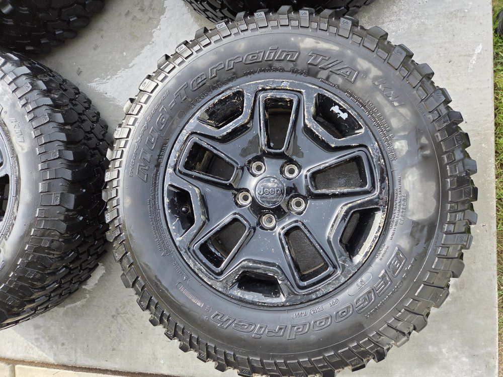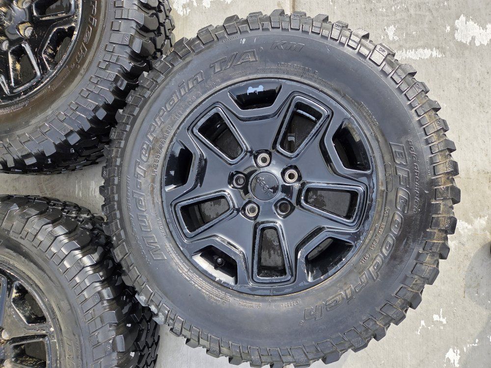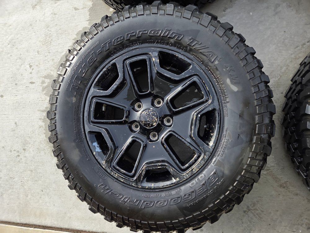 Selling a set of 5 OEM Jeep wheels wrapped in BF Goodrich Mud-Terrain T/A KM tires. Tires have decent tread. Rims are in fair condition: some curb rash, scuffing, and some tan plastidip residue remaining. Good pressure washer and some patience would get the remaining residue off. 17x7.5. Located in Tooele. Asking $500 OBO.