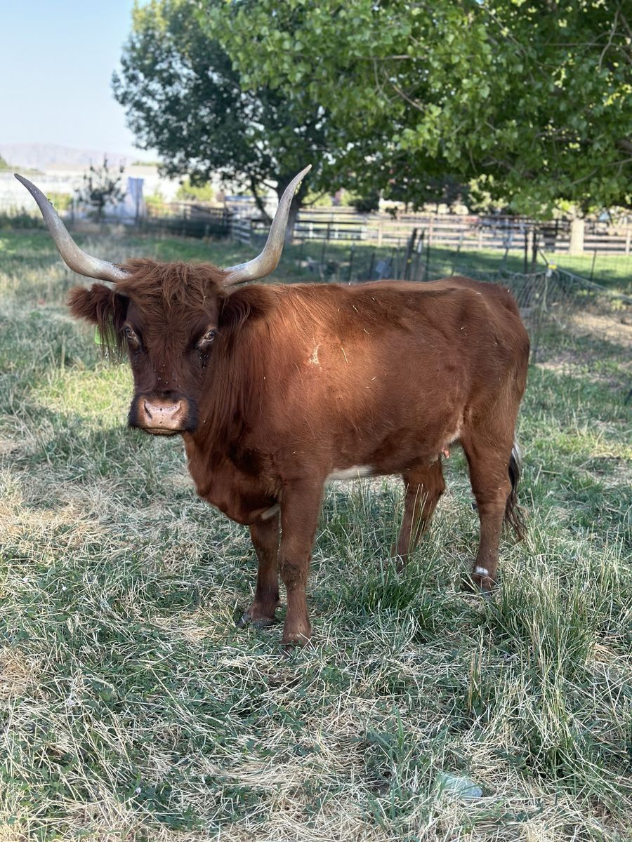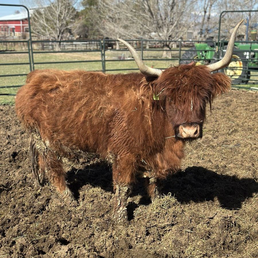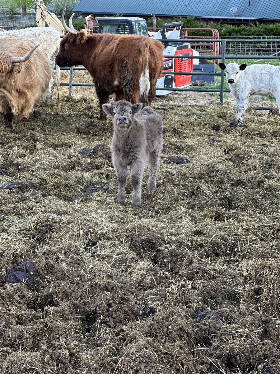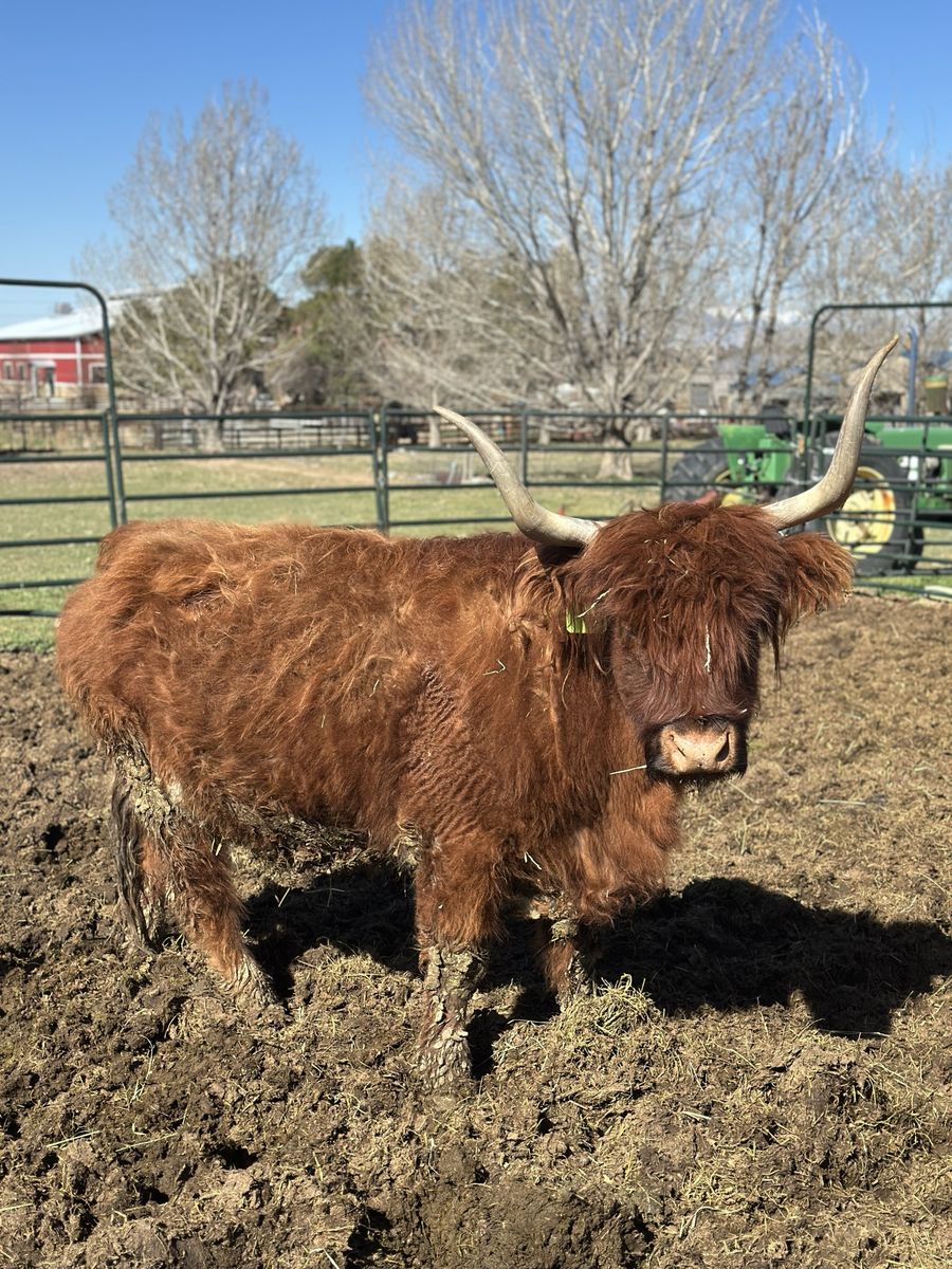 3 in 1! Red Scottish Highland Cow. She is 5 years old and has had 3 calves for us. Her current calf is a silver bull! Tempted to keep him but we love his dad. She is bred back to our Dun Bull and I’ll attach photos of him. She is a great mom and calves easily.