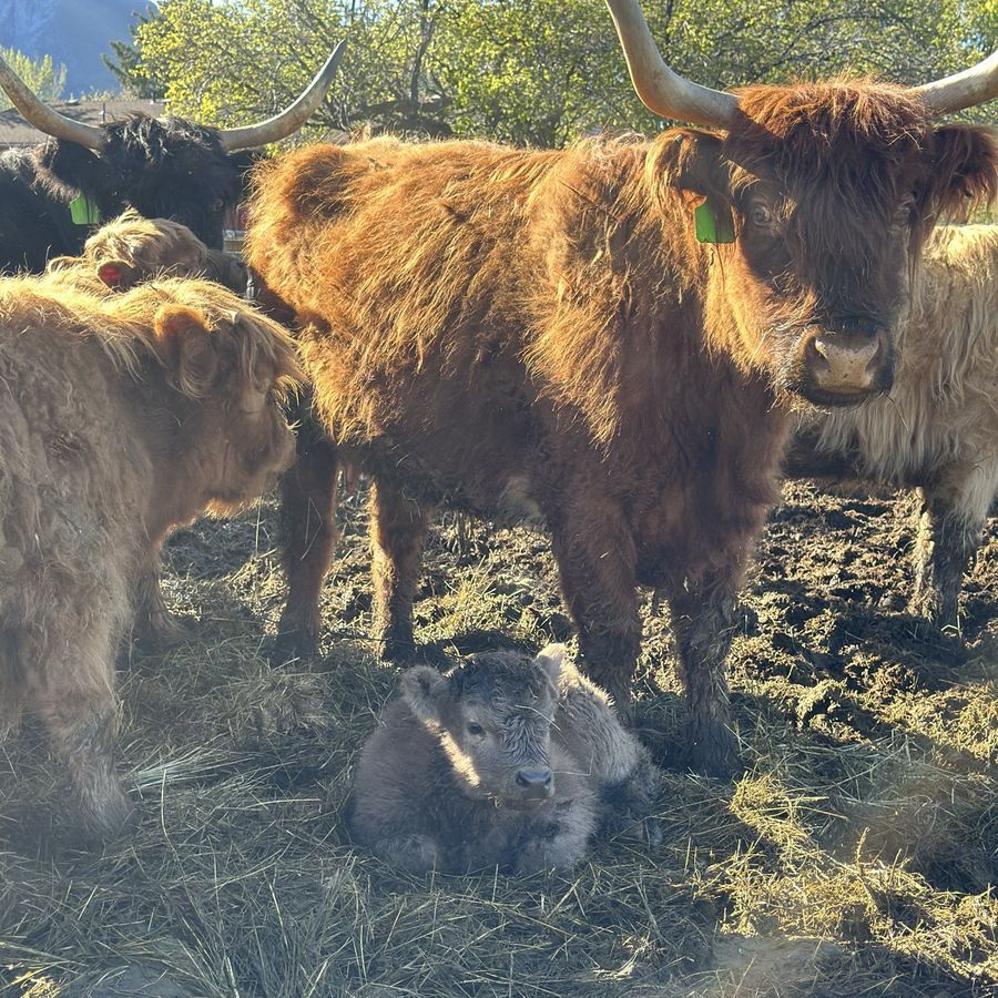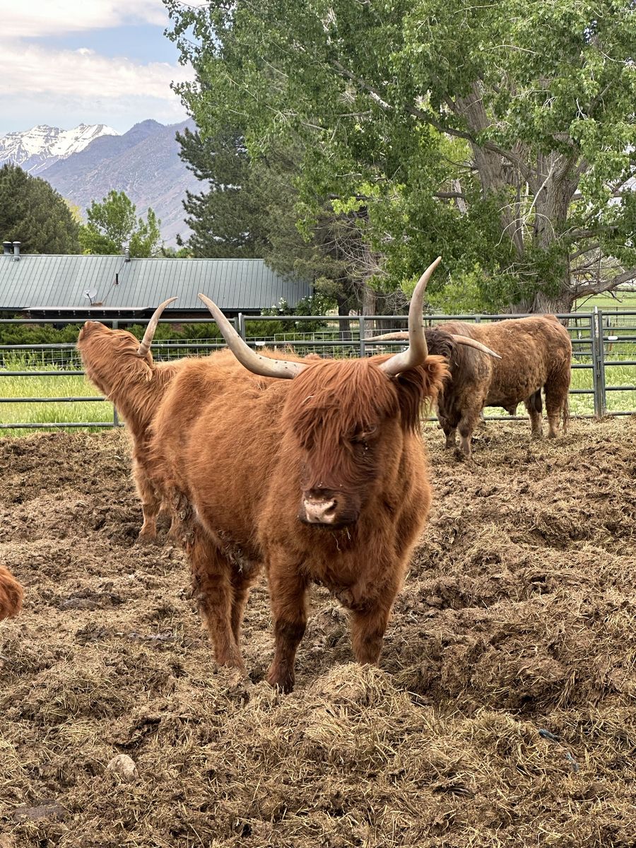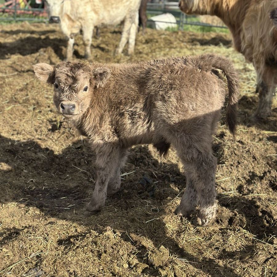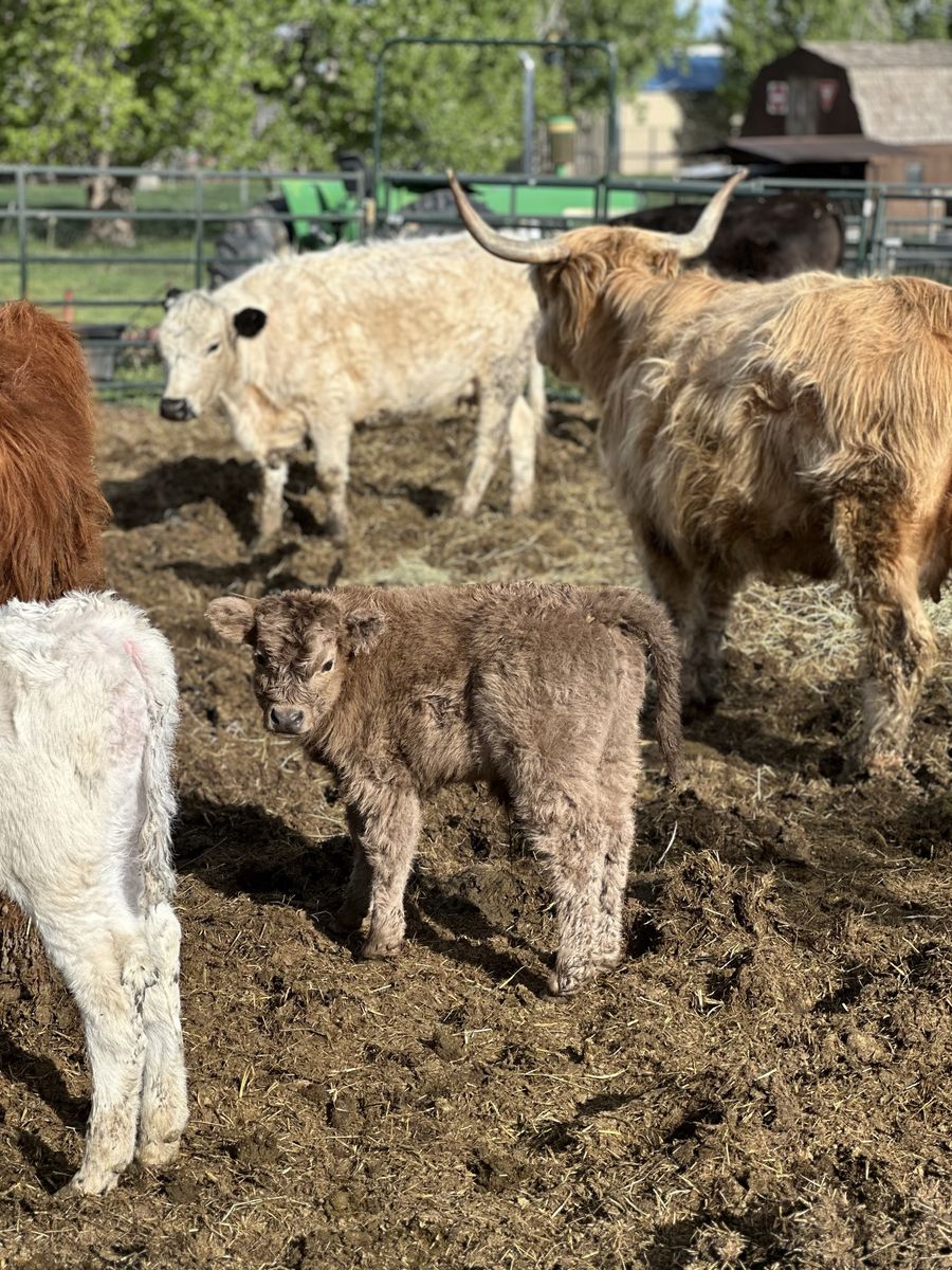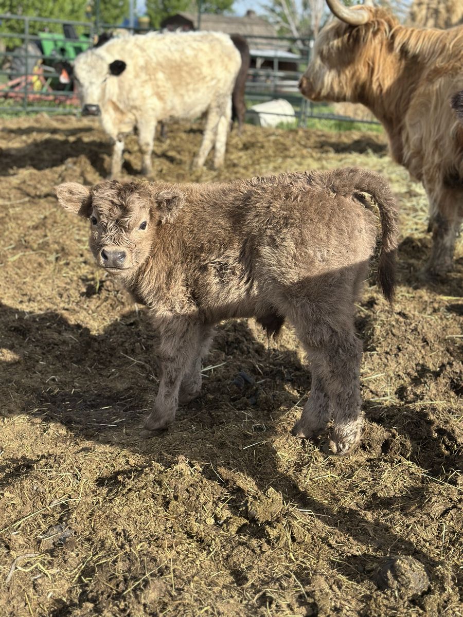 3 in 1! Red Scottish Highland Cow. She is 5 years old and has had 3 calves for us. Her current calf is a silver bull! Tempted to keep him but we love his dad. She is bred back to our Dun Bull and I’ll attach photos of him. She is a great mom and calves easily.