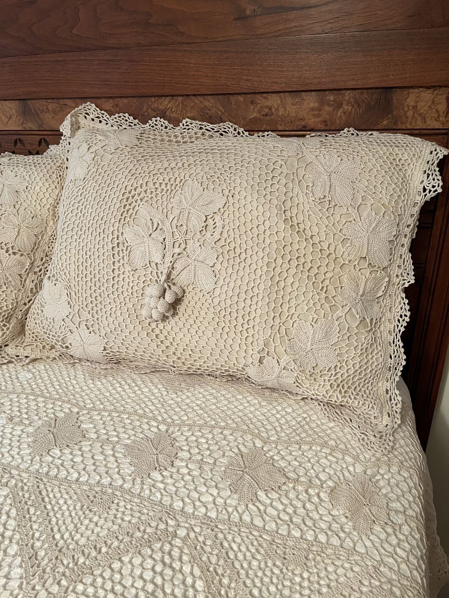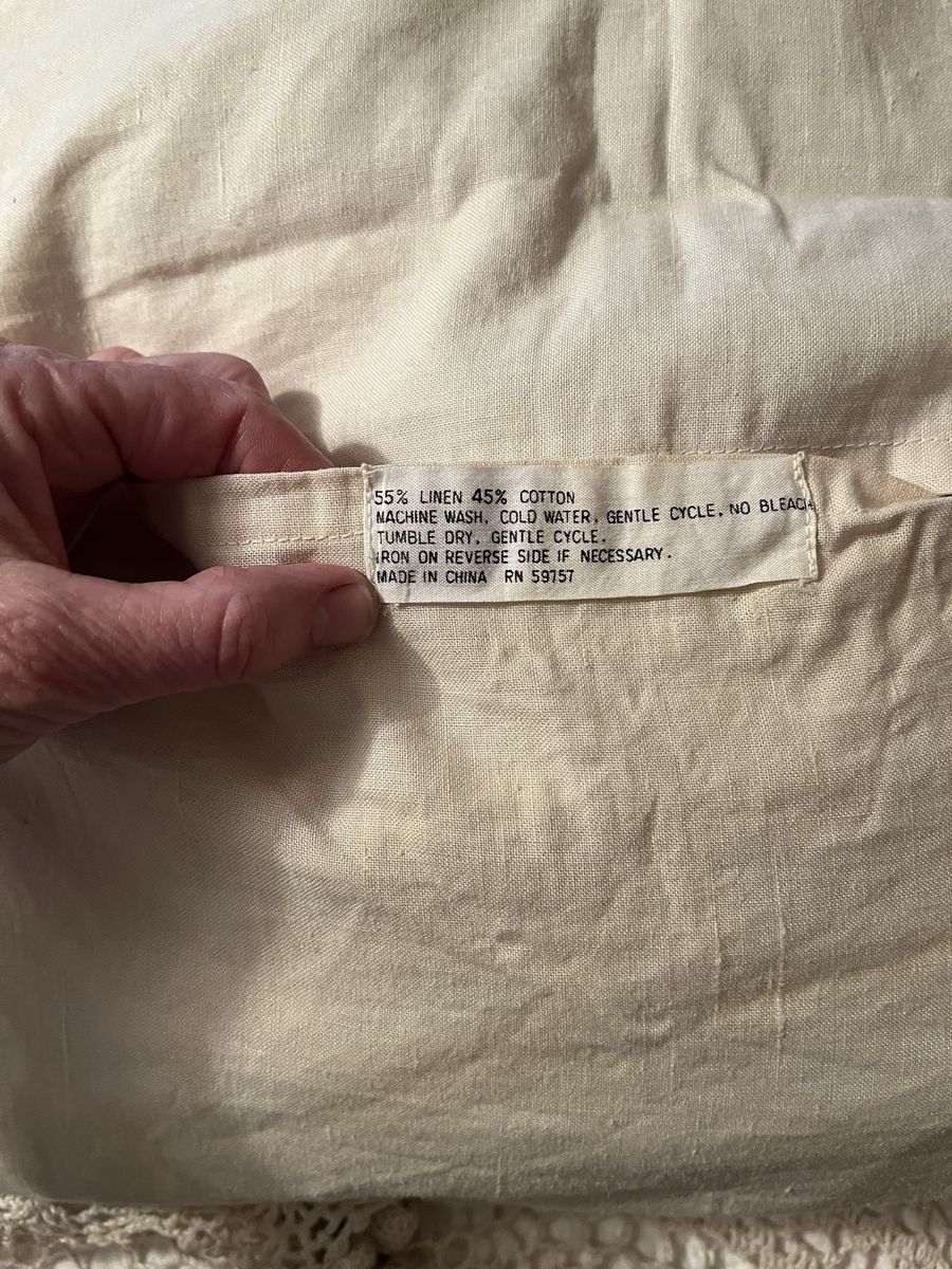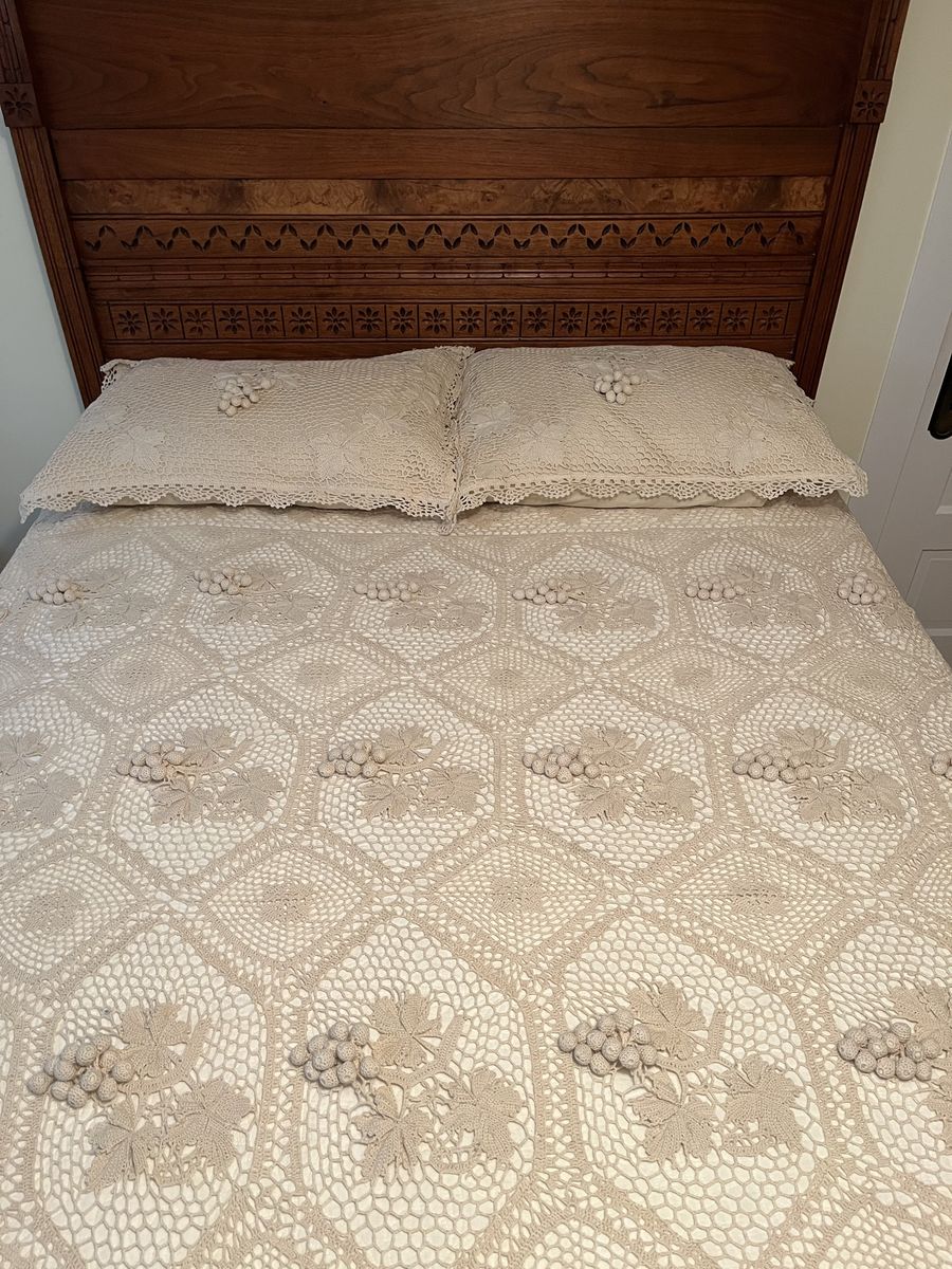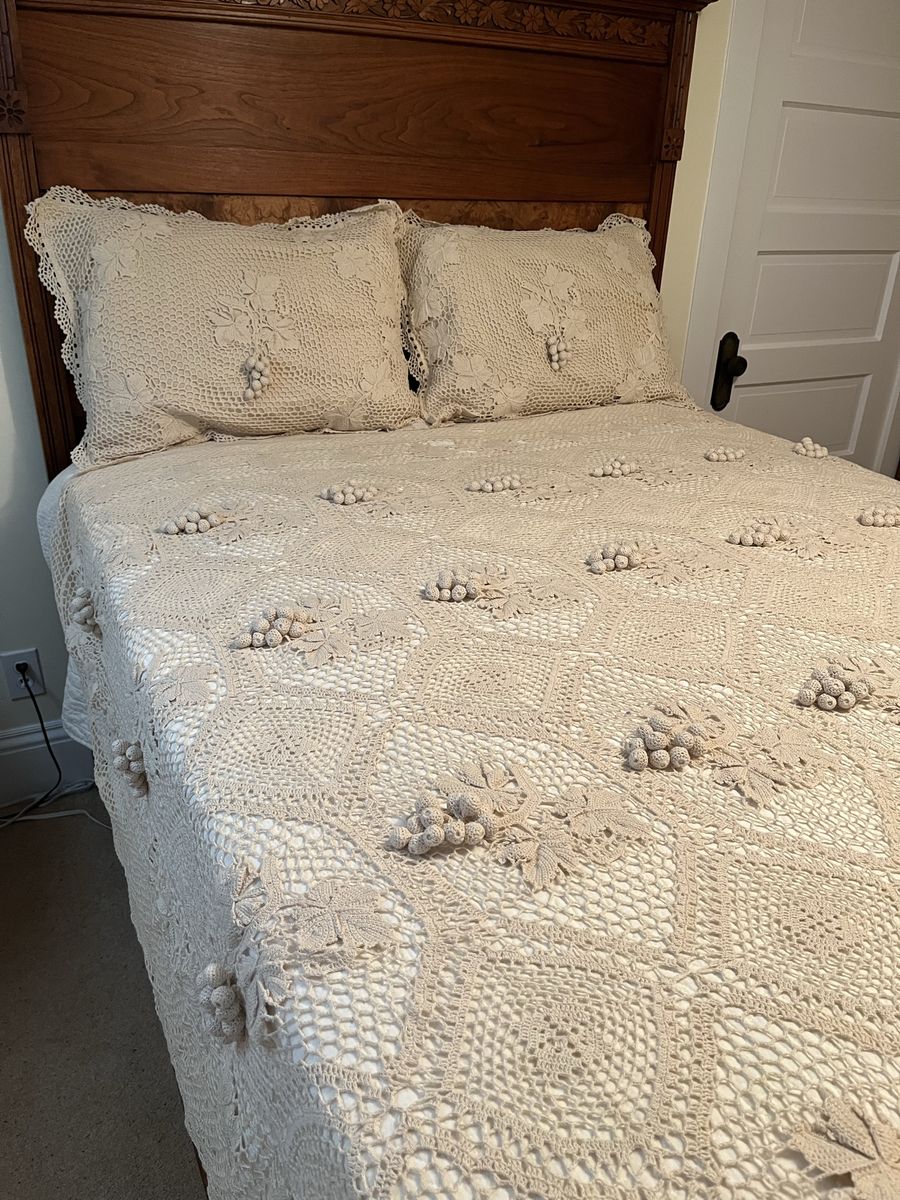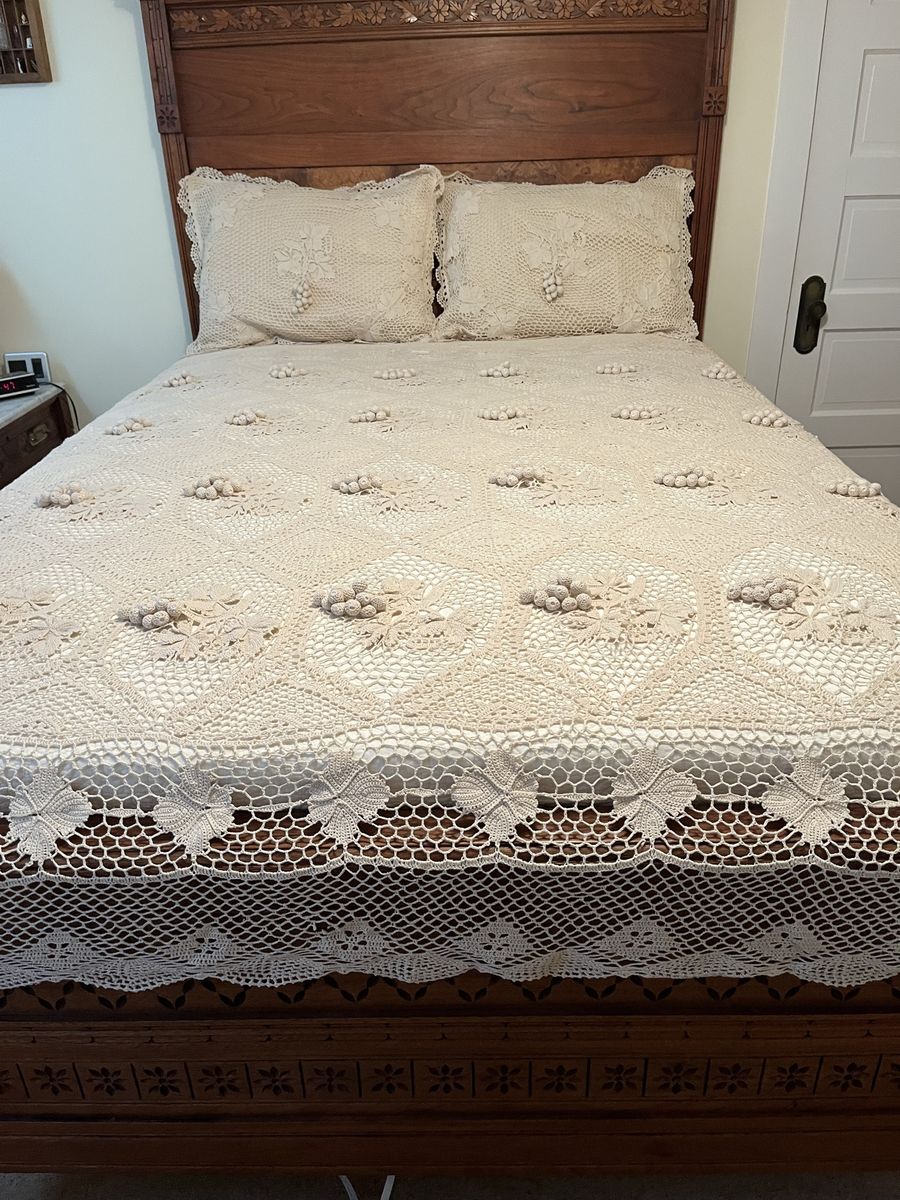 VenmoI layed this bedspread out on my queen size bed to show all the beautiful detail it has. It is an off white, ecru color. Pillow cases measure 23 inches x 28 inches. This bedspread is 82 inches x 84 inches. It is 55 % Linen and 45 % cotton. Everything is in excellent condition except one pillow sham on the Back. I found a small stain and a small tear mark. As shown in the photos. Otherwise in excellent condition. This set is vintage. It was made to look antique. I have included a picture of the tag. A very pretty must see set. The bed frame is not for sale. Price is firm.
