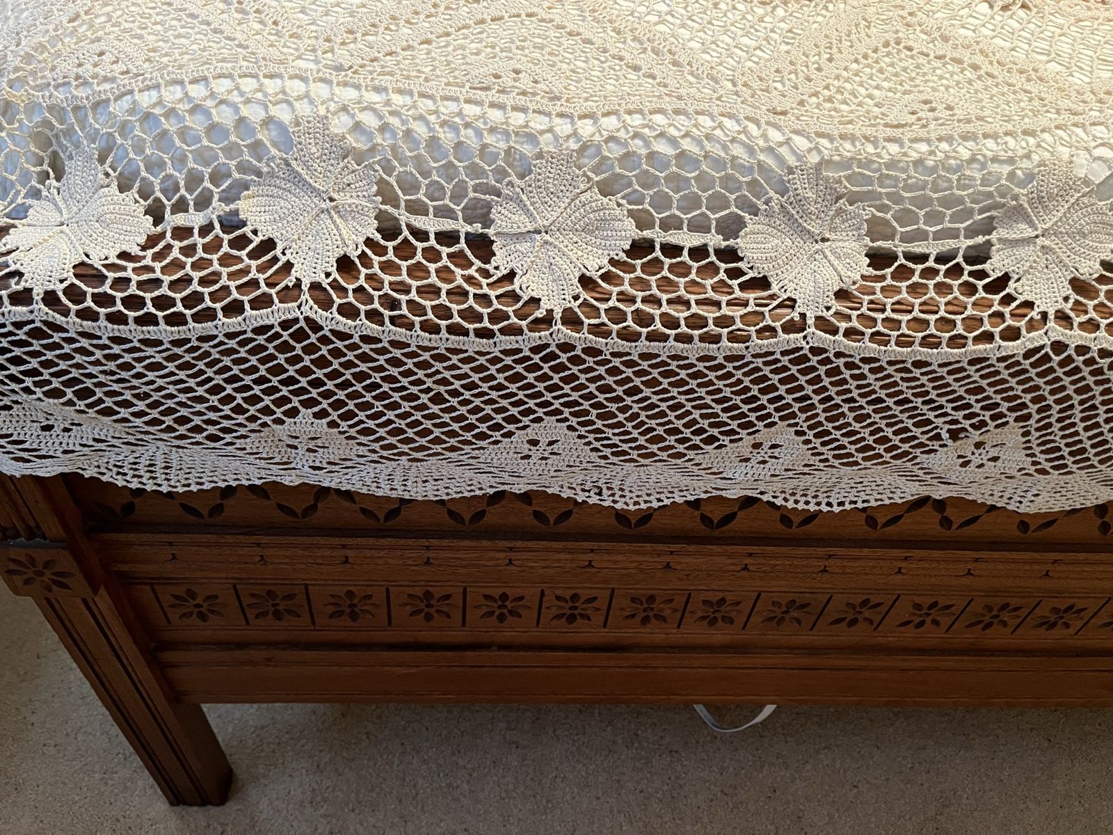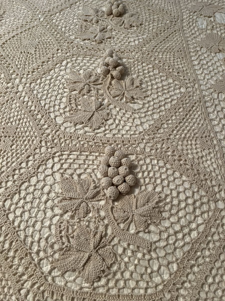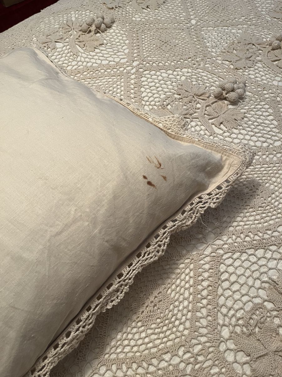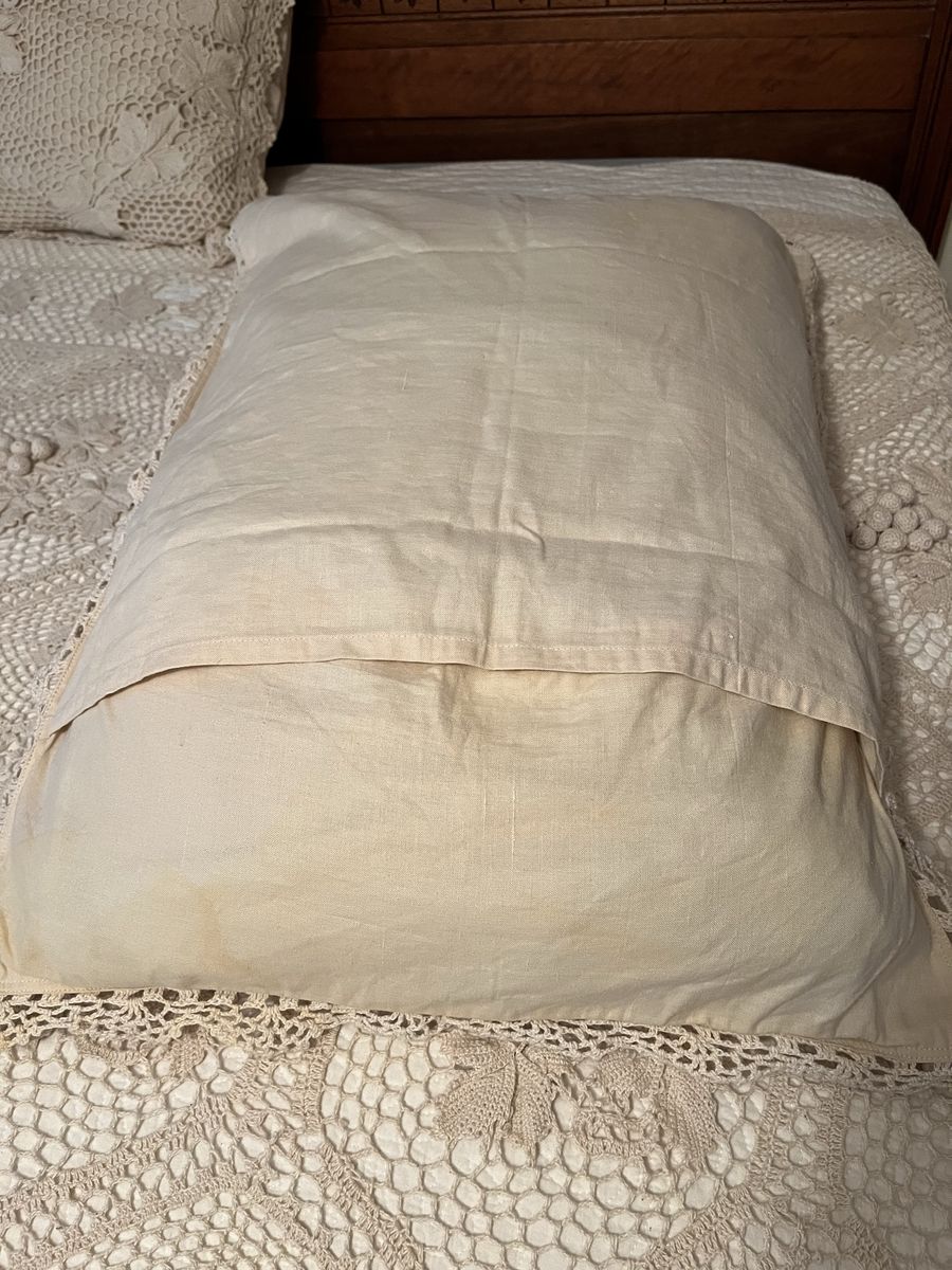 VenmoI layed this bedspread out on my queen size bed to show all the beautiful detail it has. It is an off white, ecru color. Pillow cases measure 23 inches x 28 inches. This bedspread is 82 inches x 84 inches. It is 55 % Linen and 45 % cotton. Everything is in excellent condition except one pillow sham on the Back. I found a small stain and a small tear mark. As shown in the photos. Otherwise in excellent condition. This set is vintage. It was made to look antique. I have included a picture of the tag. A very pretty must see set. The bed frame is not for sale. Price is firm.
