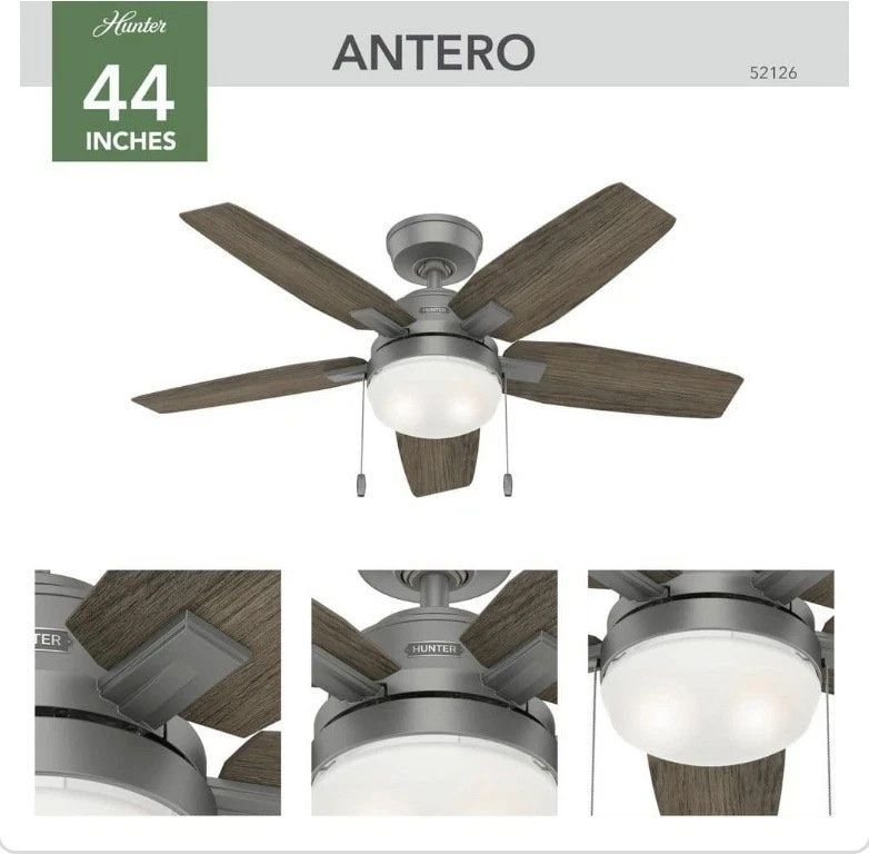 Details: Hrand: Hunter Fan Company Model: Antero Size: 44 inches (ideal for small to medium rooms) Condition: New, unopened box
