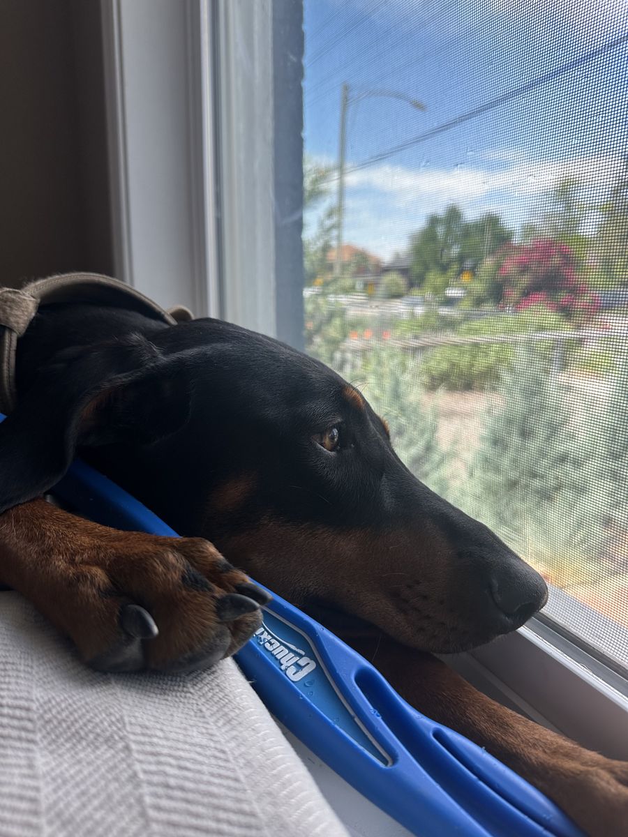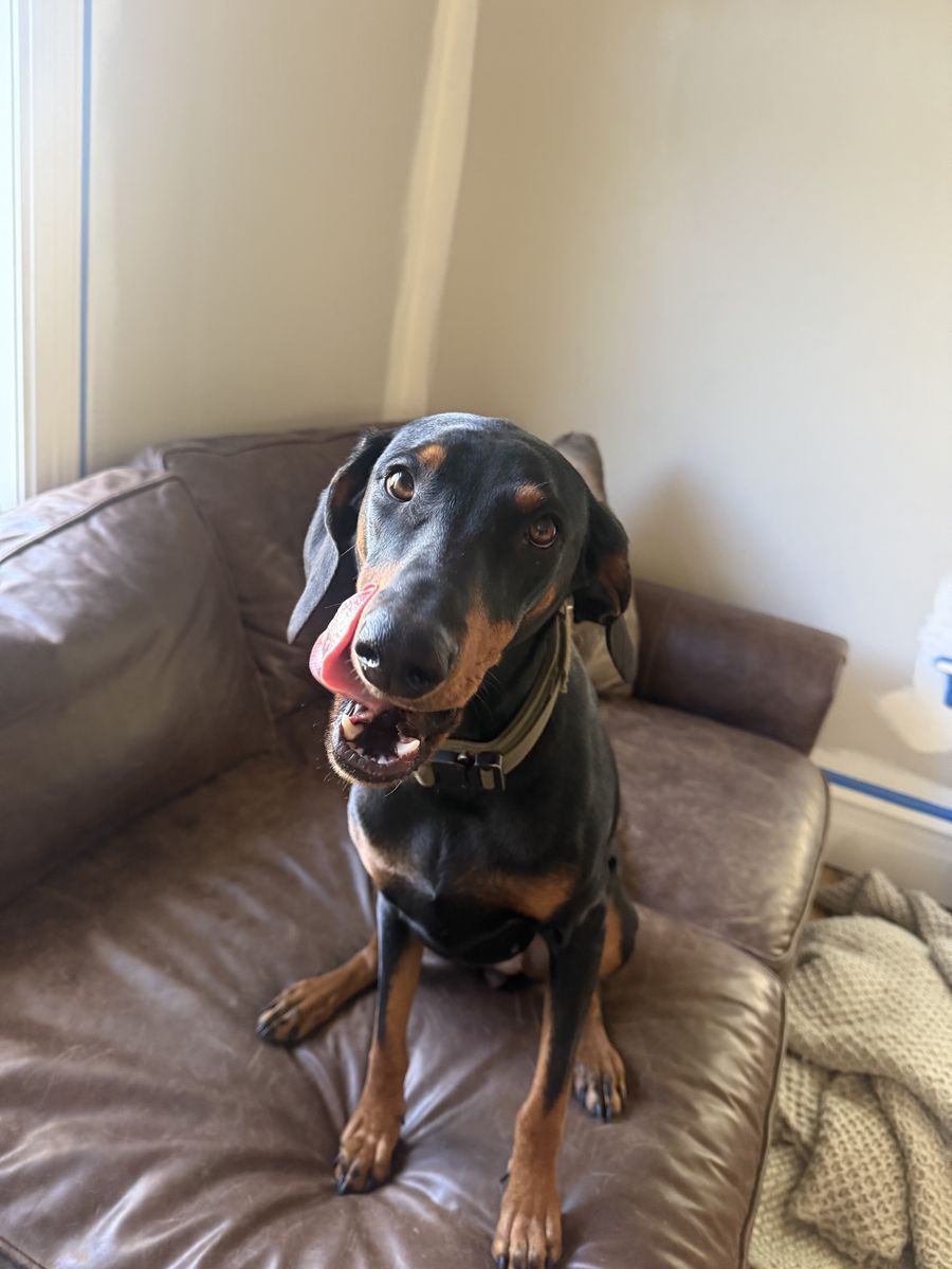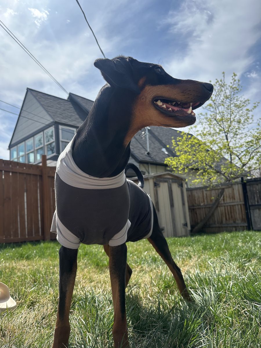 She is spayed and completely healthy. She seems to be an American Doberman through and through, although her ears are uncut and her tail is not docked.