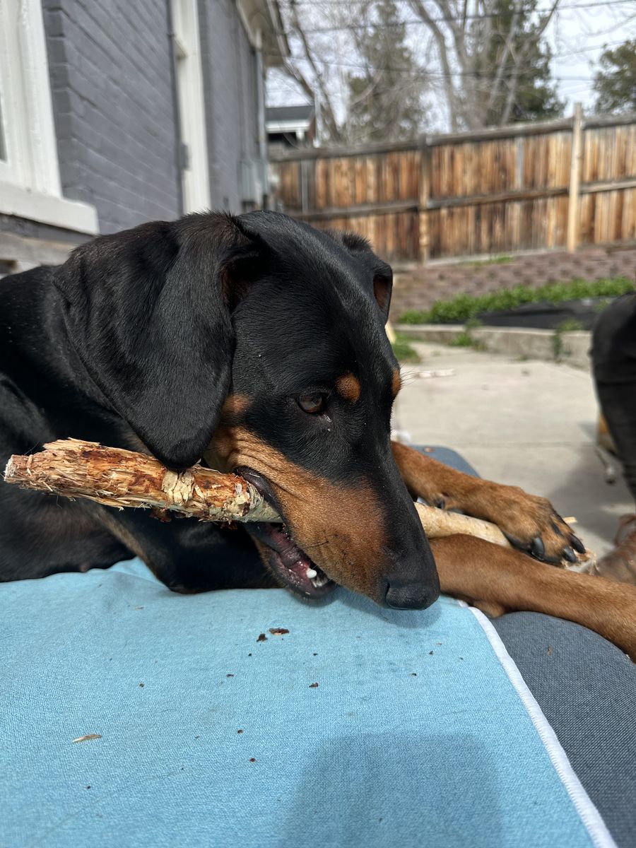 She LOVES to chase a ball, and knows to “drop” the ball as well. She knows several commands and is house trained. She’s good with other dogs, but her play style is pretty rough. She would do great with a runner or someone who can get her some good mileage every day. If she doesn’t get at least a couple miles worth of exercise each day, she can become very rambunctious. Her happy place is just following you around 24/7. She loves snuggles and being squeezed and will take every moment of attention she can get.