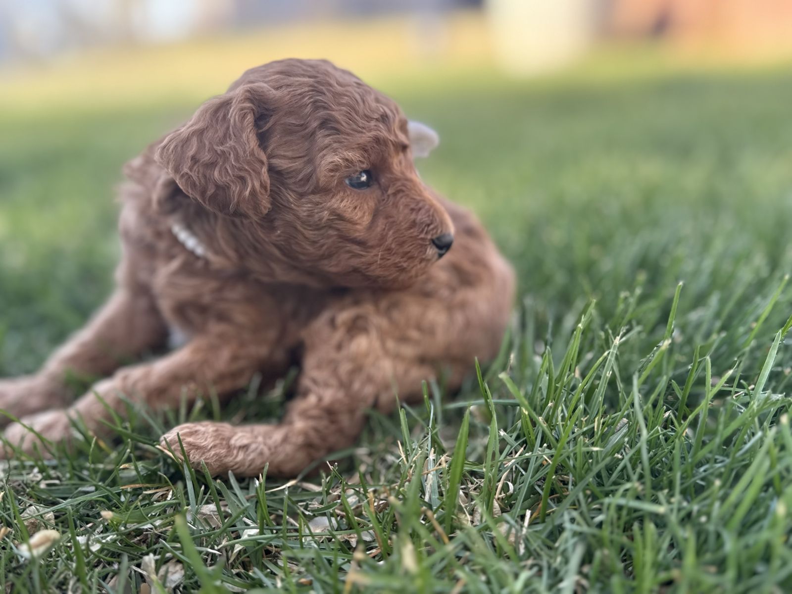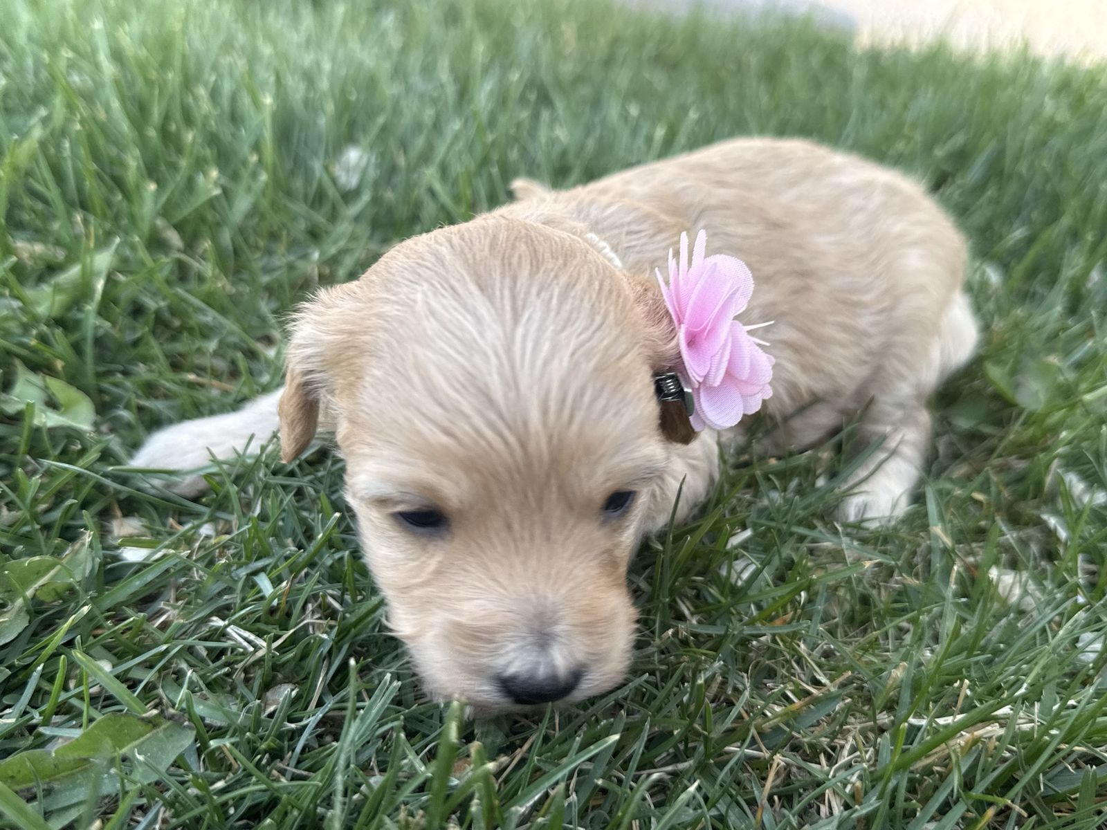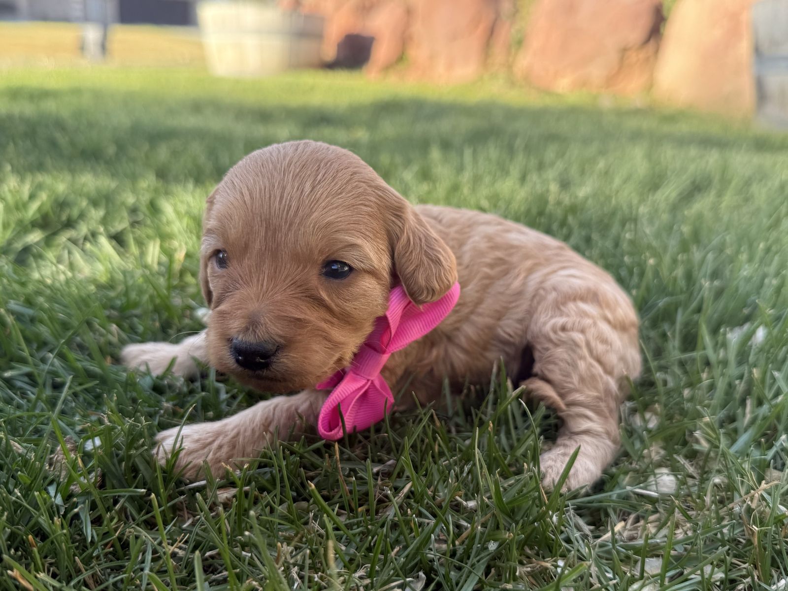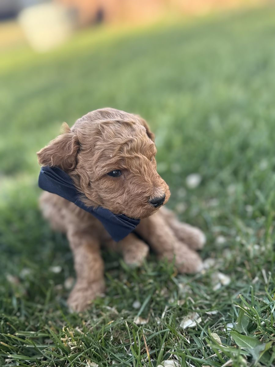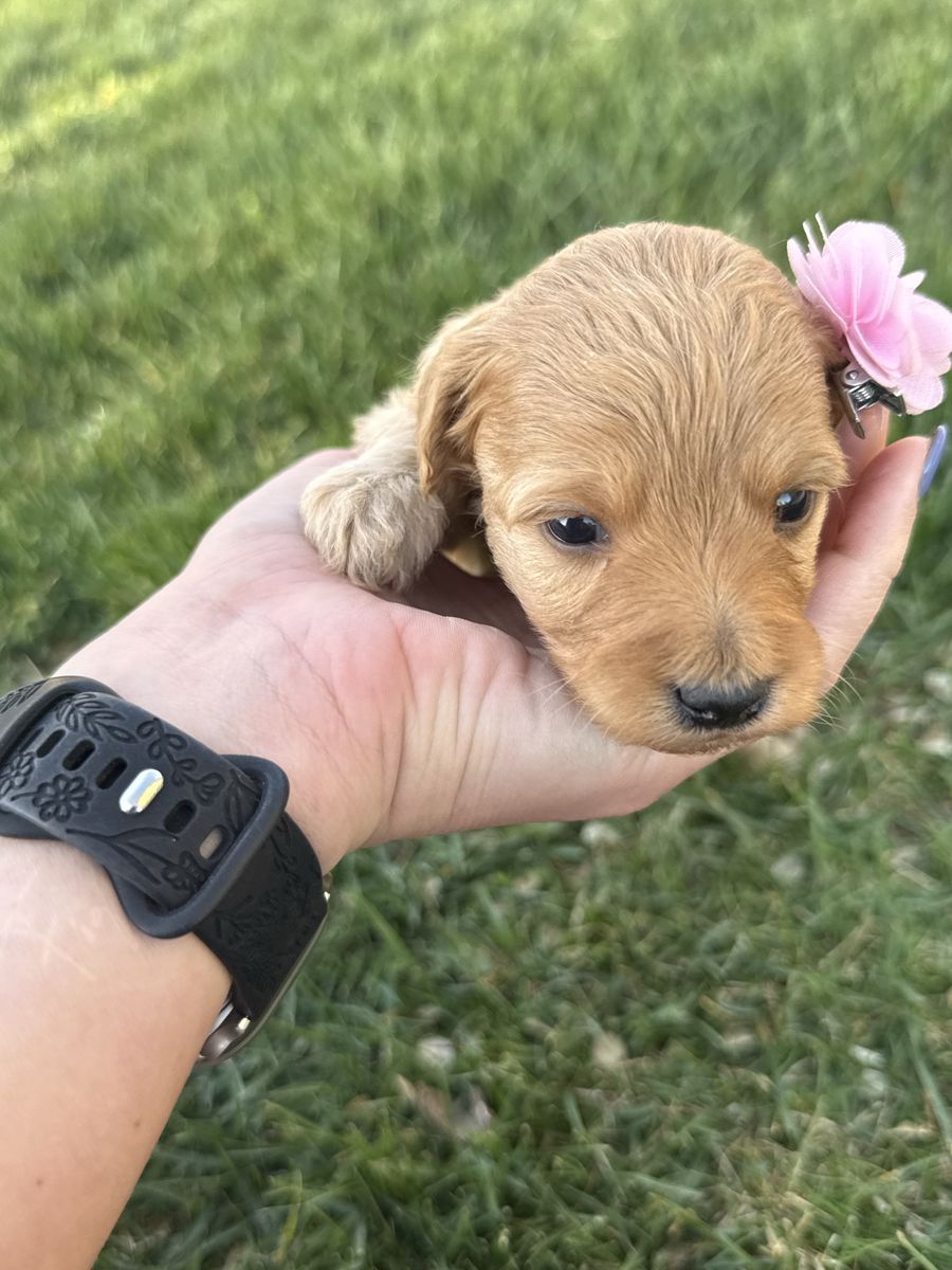 ApplePayPuppies were born March 29 and will be ready to go May 24. They will have the first two rounds of vaccines. Mom is a 15 pound multi generational Aussiedoodle and dad is a 25 pound golden doodle. We have four females and one male. One female and the male are very curly and have the white tuxedo chest.