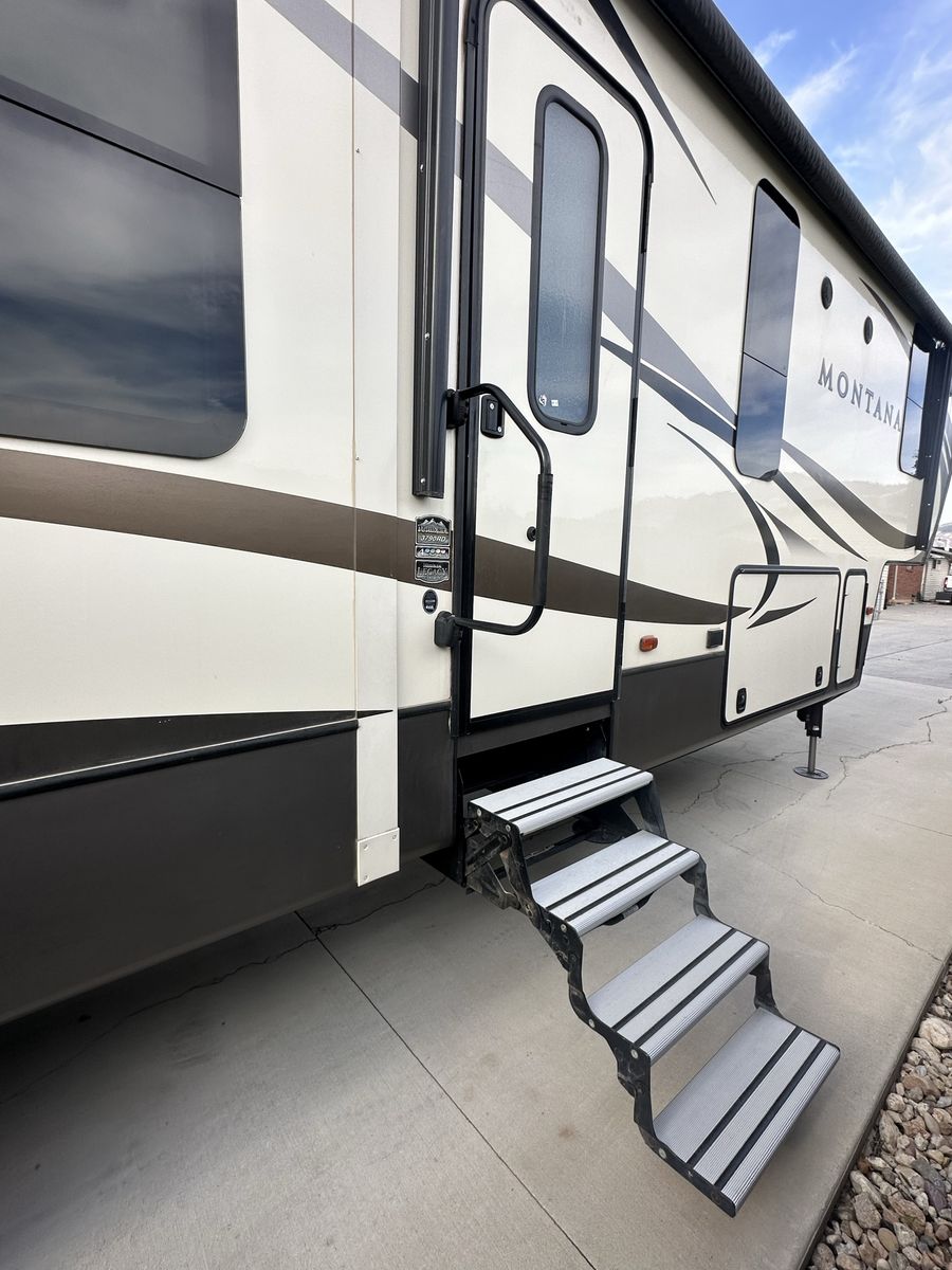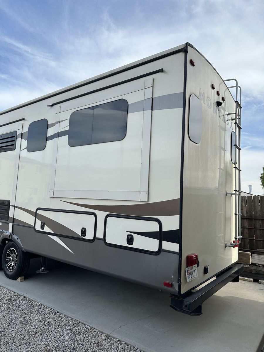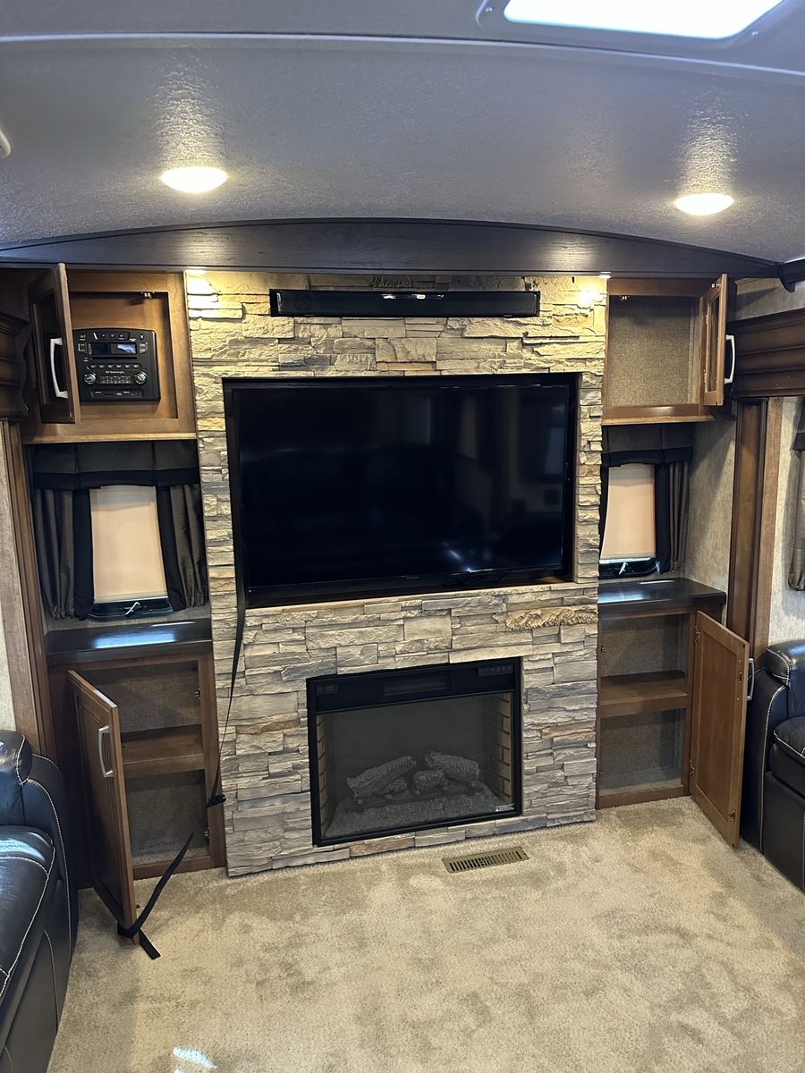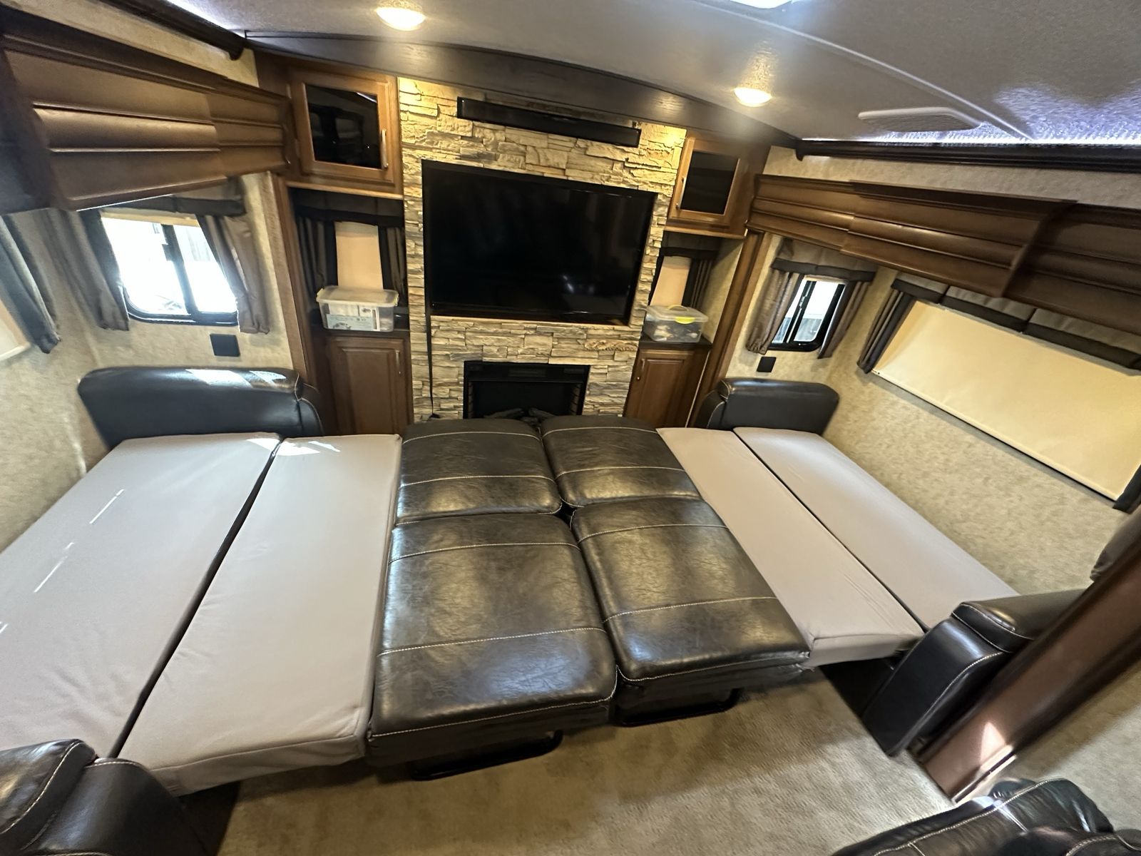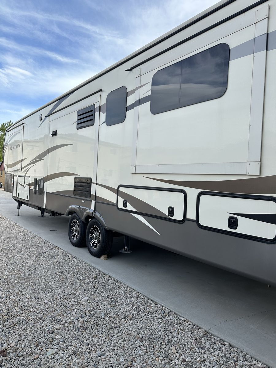 Features: •Air conditioning and heating- 15,000 BTU Central/Ducted, furnace heating •Appliances- Intervac central vacuum system with attachments included, refrigerator 4dr, microwave(convection)/hood combo, water heater 10gal gas/elec, washer and dryer hookups. •Entertainment- 2 flat screen TV’s with travel straps, Radio/CD/DVD player, Dish satellite, satellite with auto seek, exterior stereo speakers, in underbelly compartments there are outlets to plug in for TV or other equipment, satelite and cable hookups in underbelly compartment. •Jacks and leveling system- hydraulic leveling jacks. •Misc. Equipment- Fireplace, ceiling fan, flood light, LED ceiling lighting, backup camera, 1 skylight, 2 power roof vent with rain and wind sensors, 1 manual roof vent, spare tire and carrier, slide out tray full pass through, glass shower enclosure, 2 couch bed pullouts, 2 under bed storage (queen size bed), newly replaced fire alarm, touch screen control panel, incommand control systems, all window blinds come with shade and black out curtains, exterior lighting in front, tires in great condition, mirrored sliding barn doors in bedroom for closet, heated flooring in bathroom, pull down stainless steal kitchen faucet, CO2 detector. •10-11.5' awning •Cabinet upgrade DELUXE •Aluminum wheels •Solar panel •Power slide outs- 1 bedroom, 2 kitchen, 2 living room. Newly replaced slide out gear box for living room. •Also included- fifth wheel hitch attachment, dining table covers, couch covers, spice rack installed on wall in kitchen, 4 dining chairs (2 are collapsable), expandable dining table, water hose, power adapter, two large propane tanks, sewer hose, all manuals and remotes, cup holders on walls next to couches.