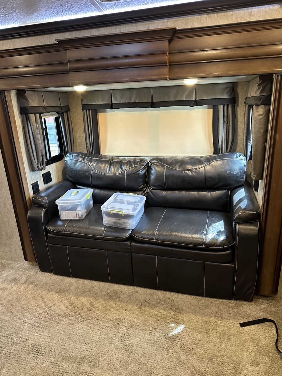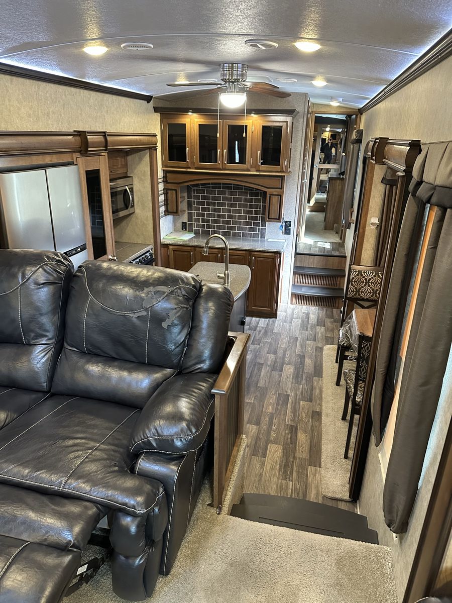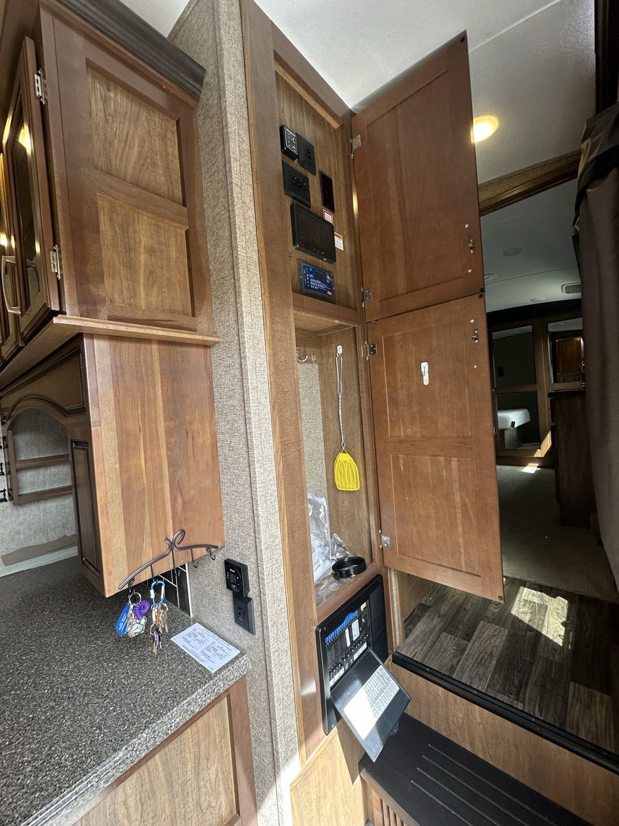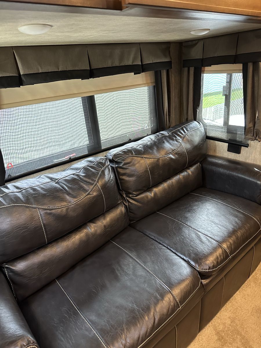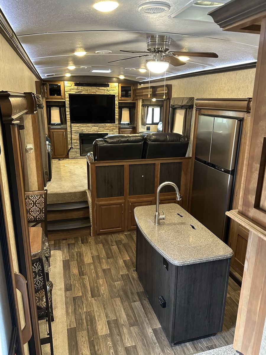 Features: •Air conditioning and heating- 15,000 BTU Central/Ducted, furnace heating •Appliances- Intervac central vacuum system with attachments included, refrigerator 4dr, microwave(convection)/hood combo, water heater 10gal gas/elec, washer and dryer hookups. •Entertainment- 2 flat screen TV’s with travel straps, Radio/CD/DVD player, Dish satellite, satellite with auto seek, exterior stereo speakers, in underbelly compartments there are outlets to plug in for TV or other equipment, satelite and cable hookups in underbelly compartment. •Jacks and leveling system- hydraulic leveling jacks. •Misc. Equipment- Fireplace, ceiling fan, flood light, LED ceiling lighting, backup camera, 1 skylight, 2 power roof vent with rain and wind sensors, 1 manual roof vent, spare tire and carrier, slide out tray full pass through, glass shower enclosure, 2 couch bed pullouts, 2 under bed storage (queen size bed), newly replaced fire alarm, touch screen control panel, incommand control systems, all window blinds come with shade and black out curtains, exterior lighting in front, tires in great condition, mirrored sliding barn doors in bedroom for closet, heated flooring in bathroom, pull down stainless steal kitchen faucet, CO2 detector. •10-11.5' awning •Cabinet upgrade DELUXE •Aluminum wheels •Solar panel •Power slide outs- 1 bedroom, 2 kitchen, 2 living room. Newly replaced slide out gear box for living room. •Also included- fifth wheel hitch attachment, dining table covers, couch covers, spice rack installed on wall in kitchen, 4 dining chairs (2 are collapsable), expandable dining table, water hose, power adapter, two large propane tanks, sewer hose, all manuals and remotes, cup holders on walls next to couches.