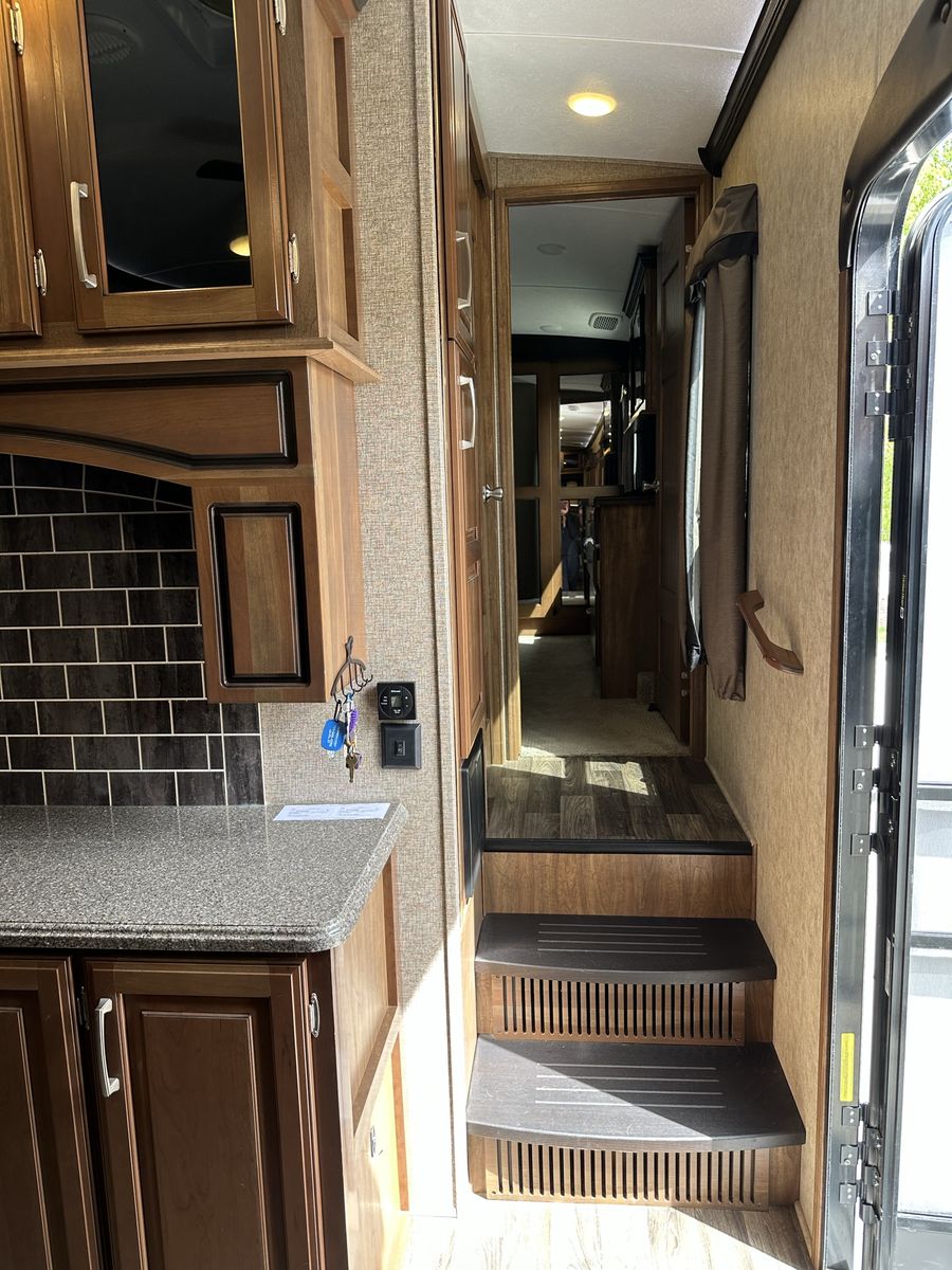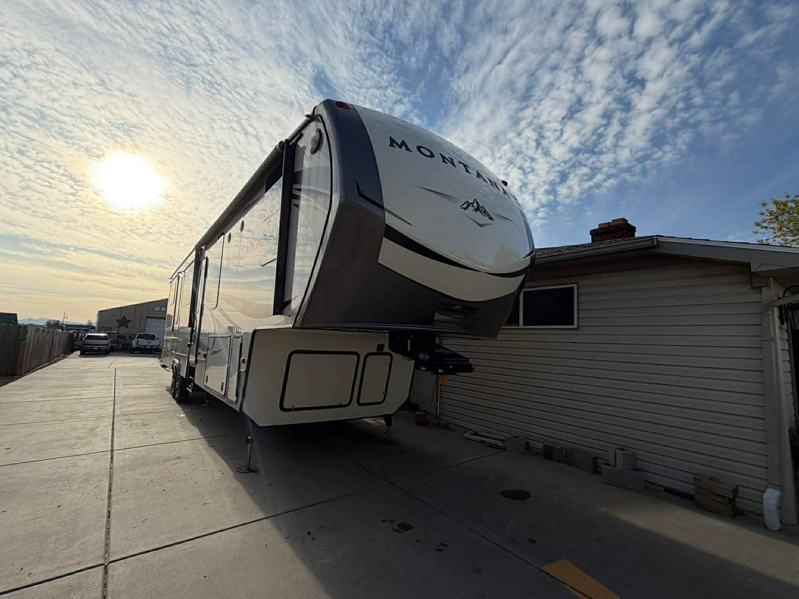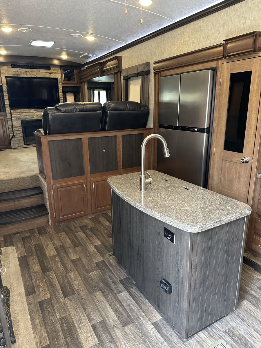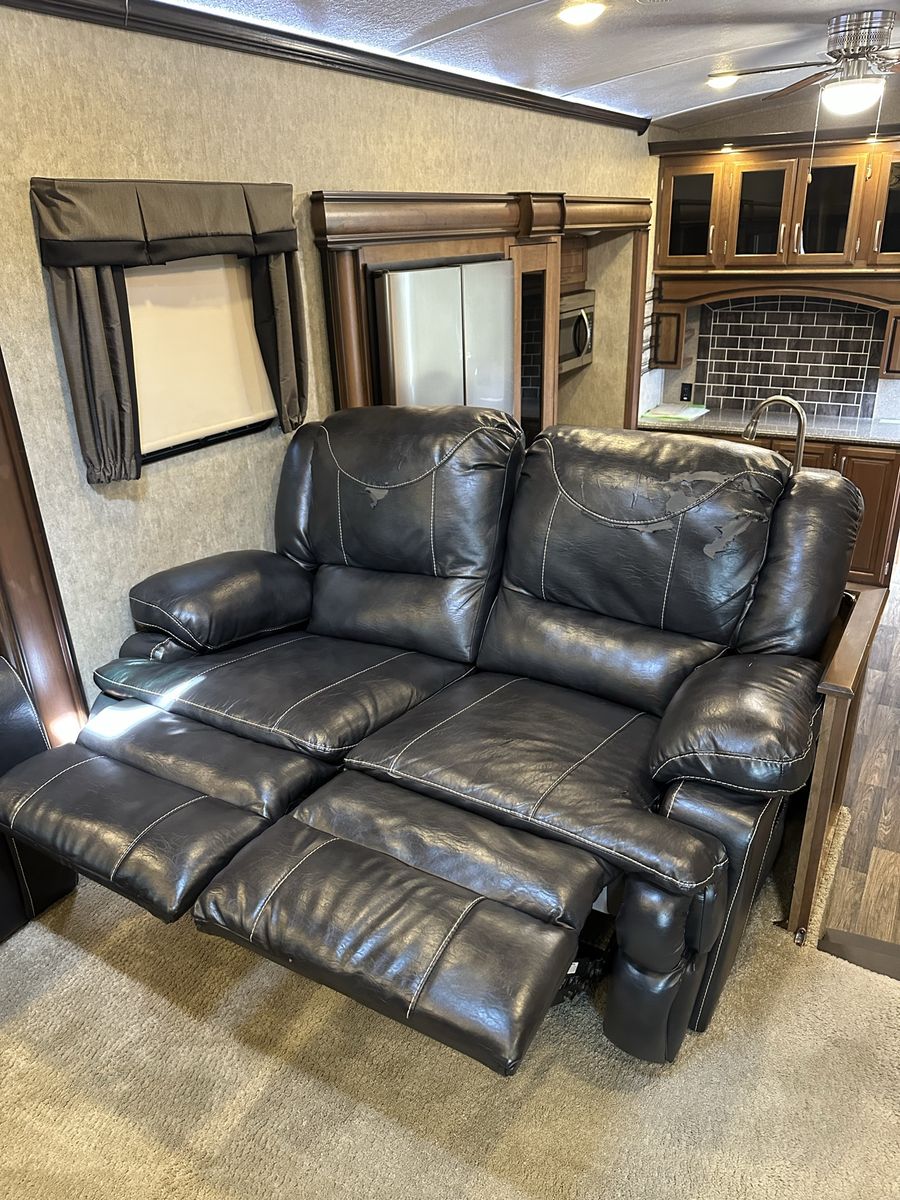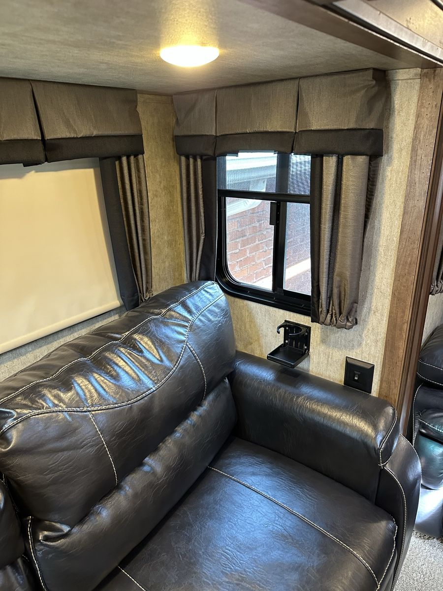 Features: •Air conditioning and heating- 15,000 BTU Central/Ducted, furnace heating •Appliances- Intervac central vacuum system with attachments included, refrigerator 4dr, microwave(convection)/hood combo, water heater 10gal gas/elec, washer and dryer hookups. •Entertainment- 2 flat screen TV’s with travel straps, Radio/CD/DVD player, Dish satellite, satellite with auto seek, exterior stereo speakers, in underbelly compartments there are outlets to plug in for TV or other equipment, satelite and cable hookups in underbelly compartment. •Jacks and leveling system- hydraulic leveling jacks. •Misc. Equipment- Fireplace, ceiling fan, flood light, LED ceiling lighting, backup camera, 1 skylight, 2 power roof vent with rain and wind sensors, 1 manual roof vent, spare tire and carrier, slide out tray full pass through, glass shower enclosure, 2 couch bed pullouts, 2 under bed storage (queen size bed), newly replaced fire alarm, touch screen control panel, incommand control systems, all window blinds come with shade and black out curtains, exterior lighting in front, tires in great condition, mirrored sliding barn doors in bedroom for closet, heated flooring in bathroom, pull down stainless steal kitchen faucet, CO2 detector. •10-11.5' awning •Cabinet upgrade DELUXE •Aluminum wheels •Solar panel •Power slide outs- 1 bedroom, 2 kitchen, 2 living room. Newly replaced slide out gear box for living room. •Also included- fifth wheel hitch attachment, dining table covers, couch covers, spice rack installed on wall in kitchen, 4 dining chairs (2 are collapsable), expandable dining table, water hose, power adapter, two large propane tanks, sewer hose, all manuals and remotes, cup holders on walls next to couches.