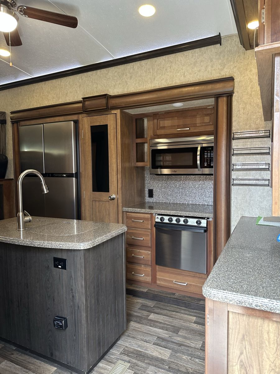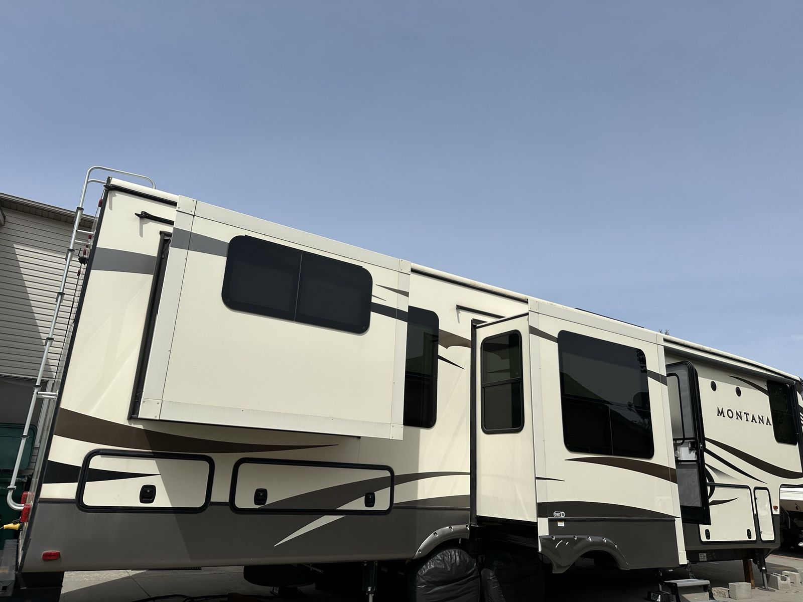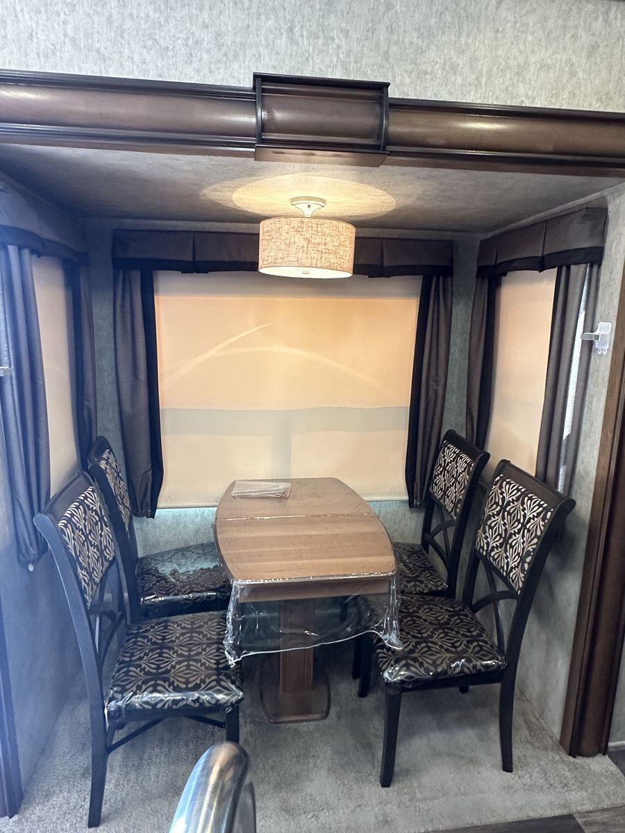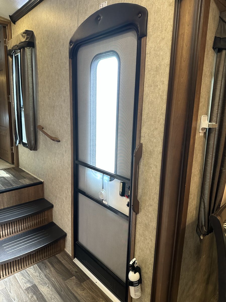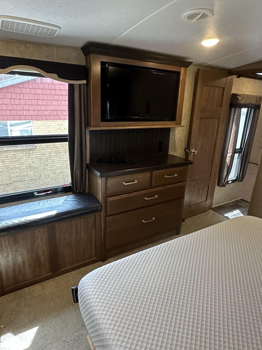 Features: •Air conditioning and heating- 15,000 BTU Central/Ducted, furnace heating •Appliances- Intervac central vacuum system with attachments included, refrigerator 4dr, microwave(convection)/hood combo, water heater 10gal gas/elec, washer and dryer hookups. •Entertainment- 2 flat screen TV’s with travel straps, Radio/CD/DVD player, Dish satellite, satellite with auto seek, exterior stereo speakers, in underbelly compartments there are outlets to plug in for TV or other equipment, satelite and cable hookups in underbelly compartment. •Jacks and leveling system- hydraulic leveling jacks. •Misc. Equipment- Fireplace, ceiling fan, flood light, LED ceiling lighting, backup camera, 1 skylight, 2 power roof vent with rain and wind sensors, 1 manual roof vent, spare tire and carrier, slide out tray full pass through, glass shower enclosure, 2 couch bed pullouts, 2 under bed storage (queen size bed), newly replaced fire alarm, touch screen control panel, incommand control systems, all window blinds come with shade and black out curtains, exterior lighting in front, tires in great condition, mirrored sliding barn doors in bedroom for closet, heated flooring in bathroom, pull down stainless steal kitchen faucet, CO2 detector. •10-11.5' awning •Cabinet upgrade DELUXE •Aluminum wheels •Solar panel •Power slide outs- 1 bedroom, 2 kitchen, 2 living room. Newly replaced slide out gear box for living room. •Also included- fifth wheel hitch attachment, dining table covers, couch covers, spice rack installed on wall in kitchen, 4 dining chairs (2 are collapsable), expandable dining table, water hose, power adapter, two large propane tanks, sewer hose, all manuals and remotes, cup holders on walls next to couches.