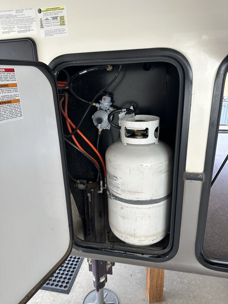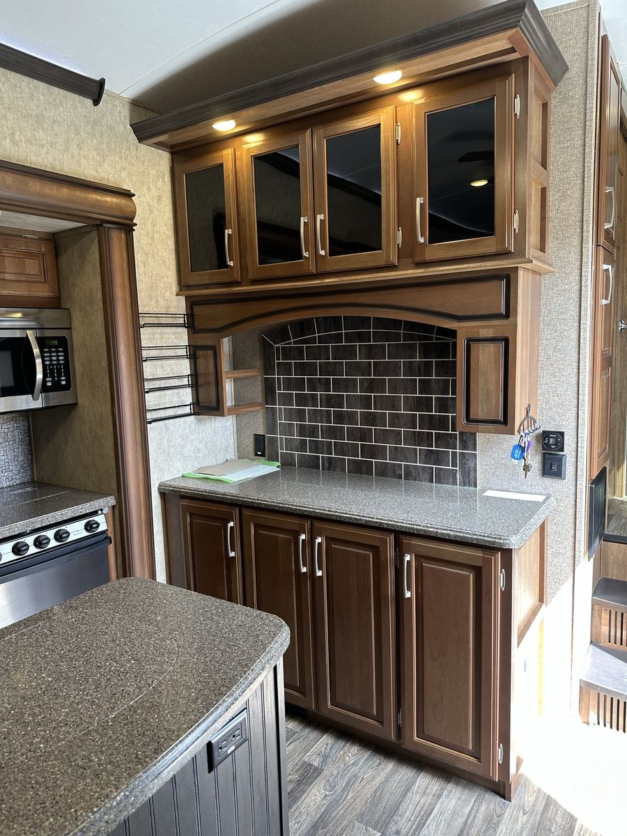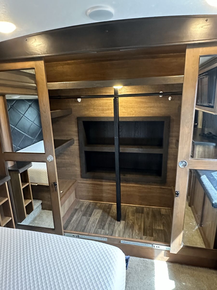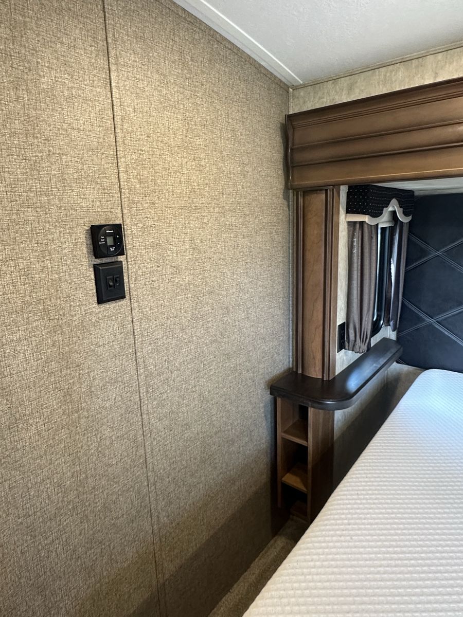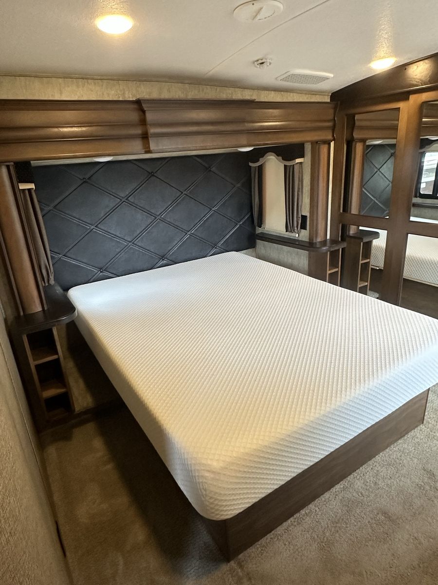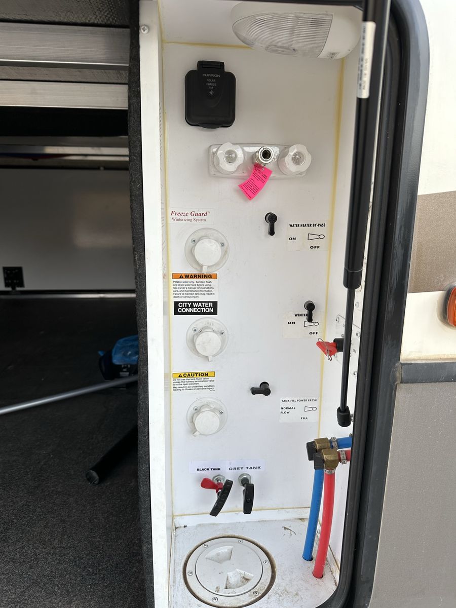 Features: •Air conditioning and heating- 15,000 BTU Central/Ducted, furnace heating •Appliances- Intervac central vacuum system with attachments included, refrigerator 4dr, microwave(convection)/hood combo, water heater 10gal gas/elec, washer and dryer hookups. •Entertainment- 2 flat screen TV’s with travel straps, Radio/CD/DVD player, Dish satellite, satellite with auto seek, exterior stereo speakers, in underbelly compartments there are outlets to plug in for TV or other equipment, satelite and cable hookups in underbelly compartment. •Jacks and leveling system- hydraulic leveling jacks. •Misc. Equipment- Fireplace, ceiling fan, flood light, LED ceiling lighting, backup camera, 1 skylight, 2 power roof vent with rain and wind sensors, 1 manual roof vent, spare tire and carrier, slide out tray full pass through, glass shower enclosure, 2 couch bed pullouts, 2 under bed storage (queen size bed), newly replaced fire alarm, touch screen control panel, incommand control systems, all window blinds come with shade and black out curtains, exterior lighting in front, tires in great condition, mirrored sliding barn doors in bedroom for closet, heated flooring in bathroom, pull down stainless steal kitchen faucet, CO2 detector. •10-11.5' awning •Cabinet upgrade DELUXE •Aluminum wheels •Solar panel •Power slide outs- 1 bedroom, 2 kitchen, 2 living room. Newly replaced slide out gear box for living room. •Also included- fifth wheel hitch attachment, dining table covers, couch covers, spice rack installed on wall in kitchen, 4 dining chairs (2 are collapsable), expandable dining table, water hose, power adapter, two large propane tanks, sewer hose, all manuals and remotes, cup holders on walls next to couches.