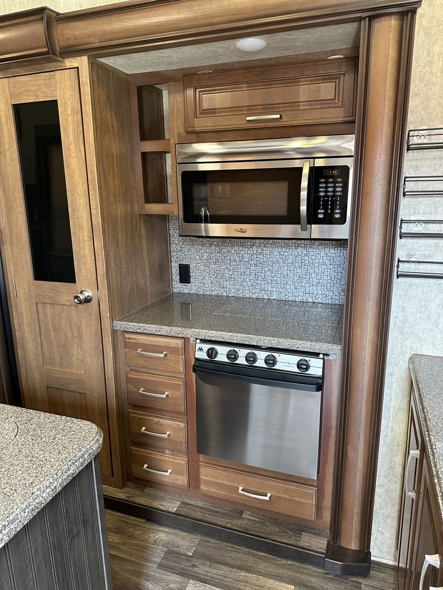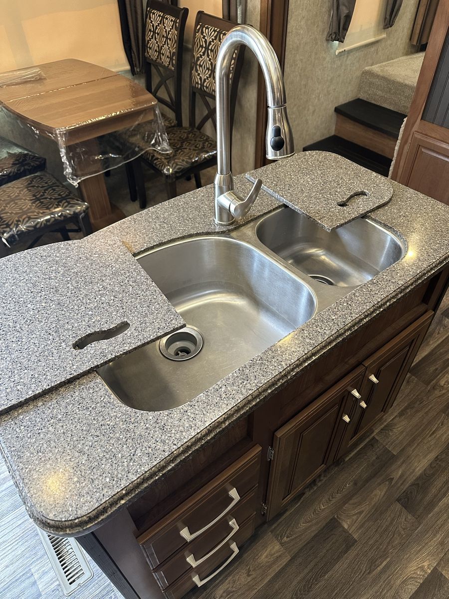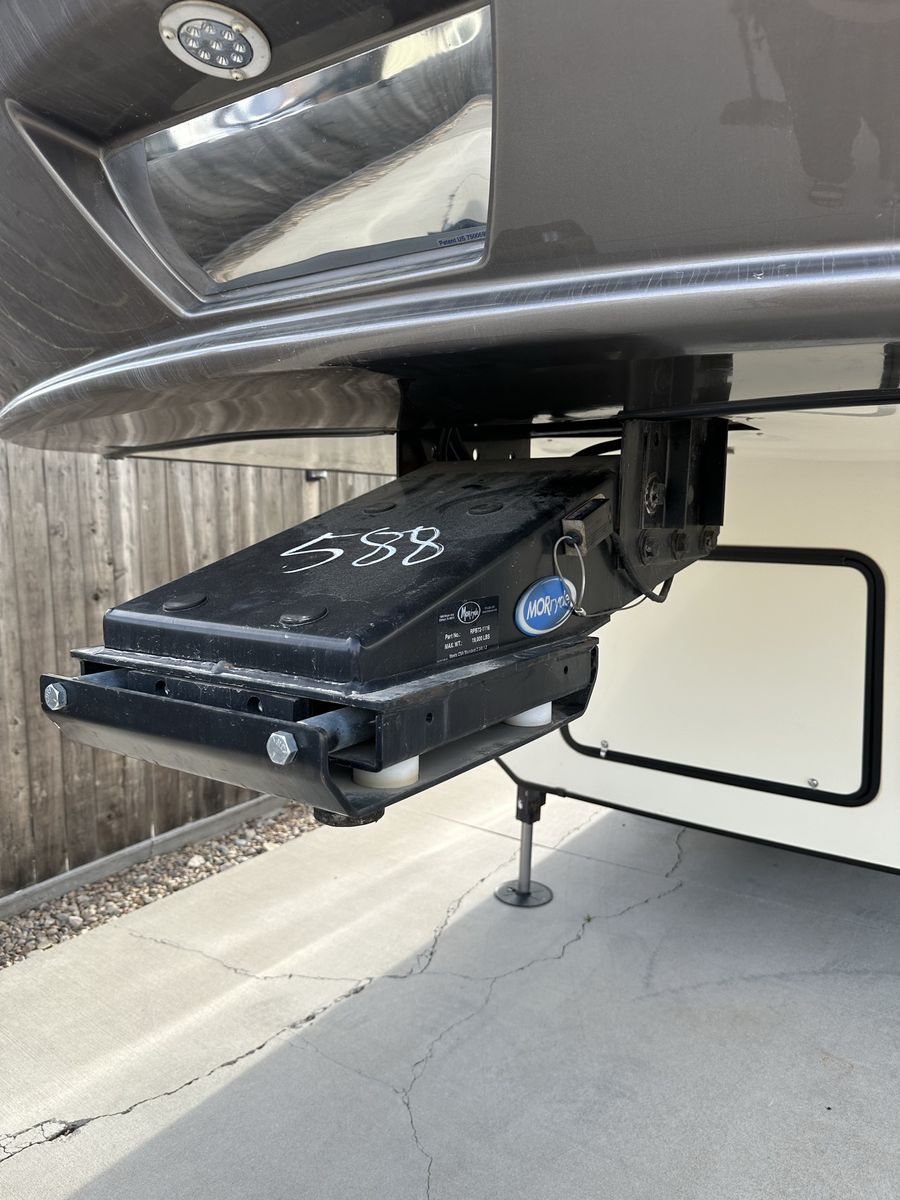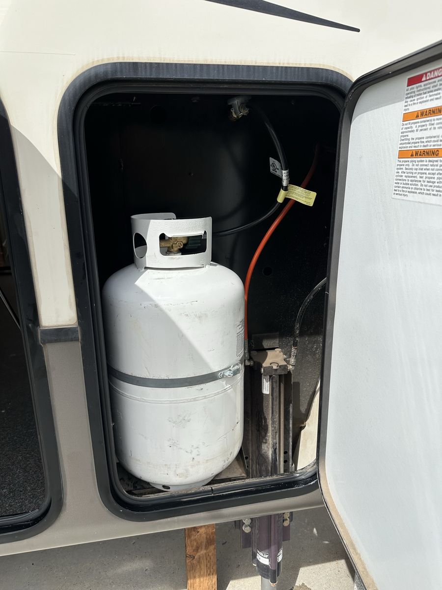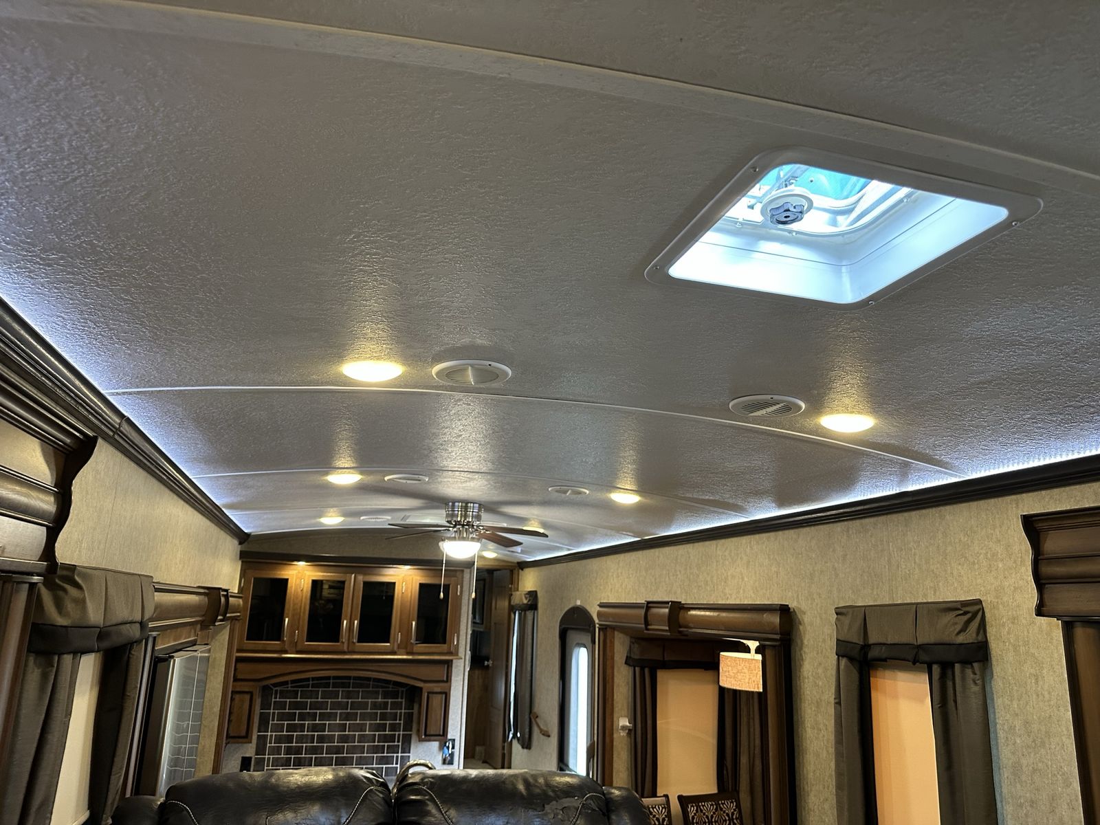 Features: •Air conditioning and heating- 15,000 BTU Central/Ducted, furnace heating •Appliances- Intervac central vacuum system with attachments included, refrigerator 4dr, microwave(convection)/hood combo, water heater 10gal gas/elec, washer and dryer hookups. •Entertainment- 2 flat screen TV’s with travel straps, Radio/CD/DVD player, Dish satellite, satellite with auto seek, exterior stereo speakers, in underbelly compartments there are outlets to plug in for TV or other equipment, satelite and cable hookups in underbelly compartment. •Jacks and leveling system- hydraulic leveling jacks. •Misc. Equipment- Fireplace, ceiling fan, flood light, LED ceiling lighting, backup camera, 1 skylight, 2 power roof vent with rain and wind sensors, 1 manual roof vent, spare tire and carrier, slide out tray full pass through, glass shower enclosure, 2 couch bed pullouts, 2 under bed storage (queen size bed), newly replaced fire alarm, touch screen control panel, incommand control systems, all window blinds come with shade and black out curtains, exterior lighting in front, tires in great condition, mirrored sliding barn doors in bedroom for closet, heated flooring in bathroom, pull down stainless steal kitchen faucet, CO2 detector. •10-11.5' awning •Cabinet upgrade DELUXE •Aluminum wheels •Solar panel •Power slide outs- 1 bedroom, 2 kitchen, 2 living room. Newly replaced slide out gear box for living room. •Also included- fifth wheel hitch attachment, dining table covers, couch covers, spice rack installed on wall in kitchen, 4 dining chairs (2 are collapsable), expandable dining table, water hose, power adapter, two large propane tanks, sewer hose, all manuals and remotes, cup holders on walls next to couches.