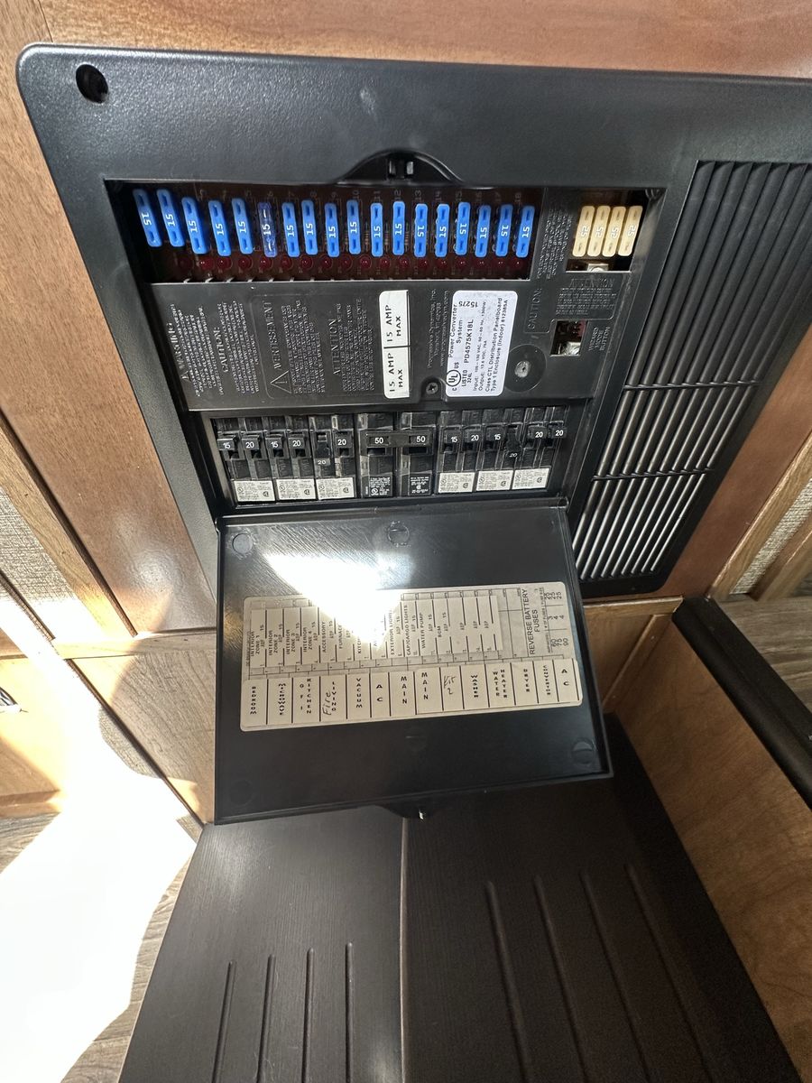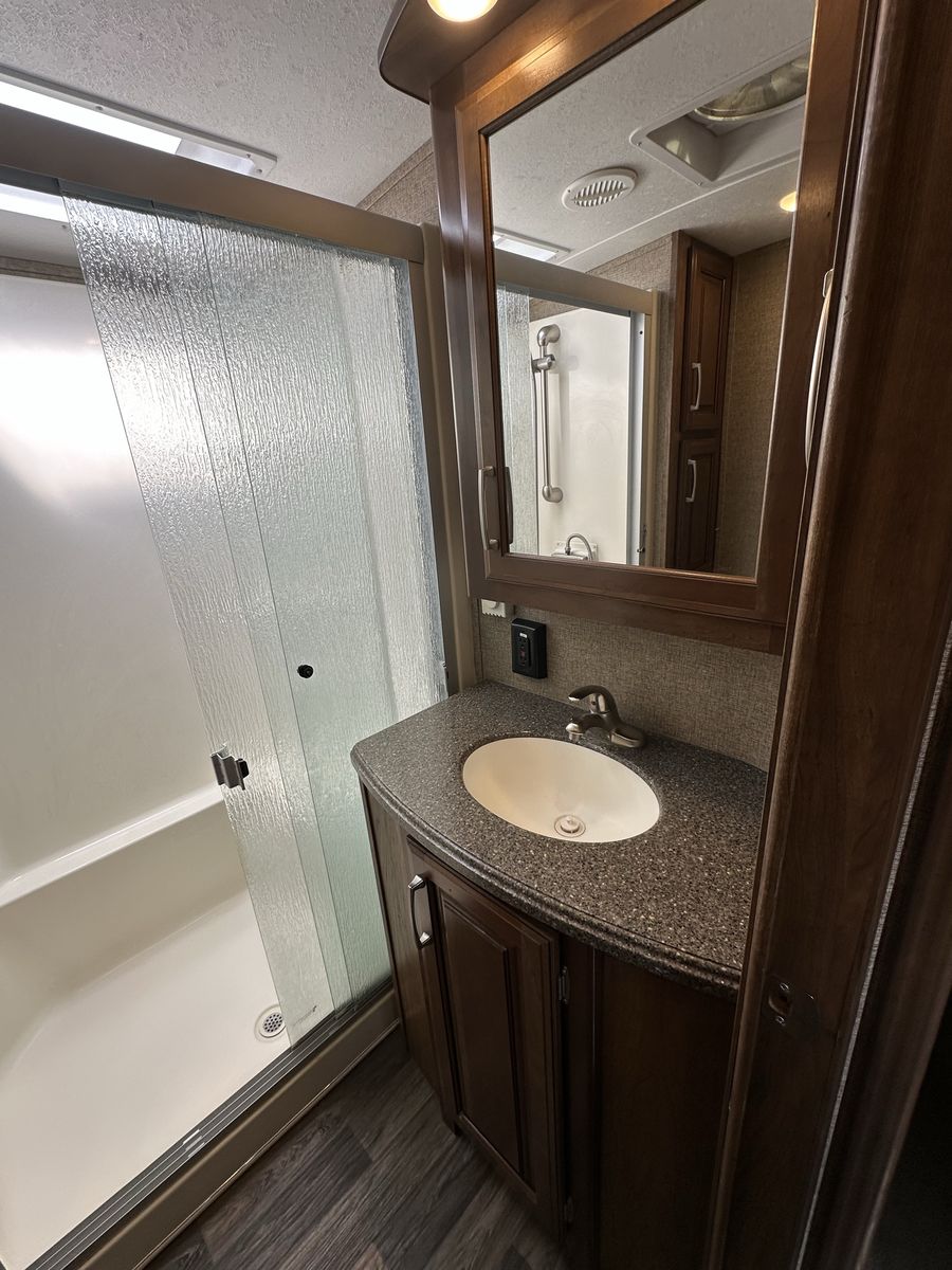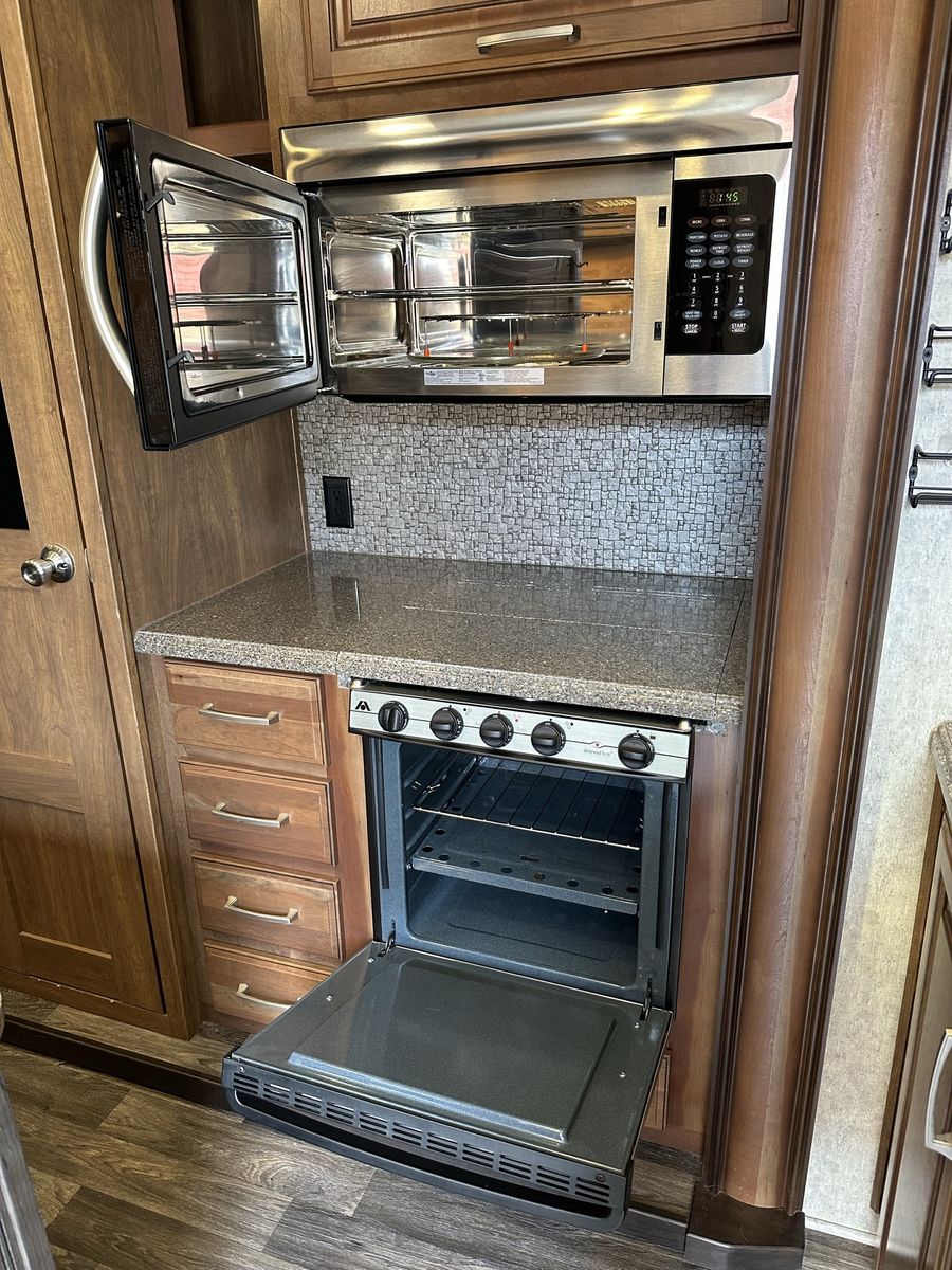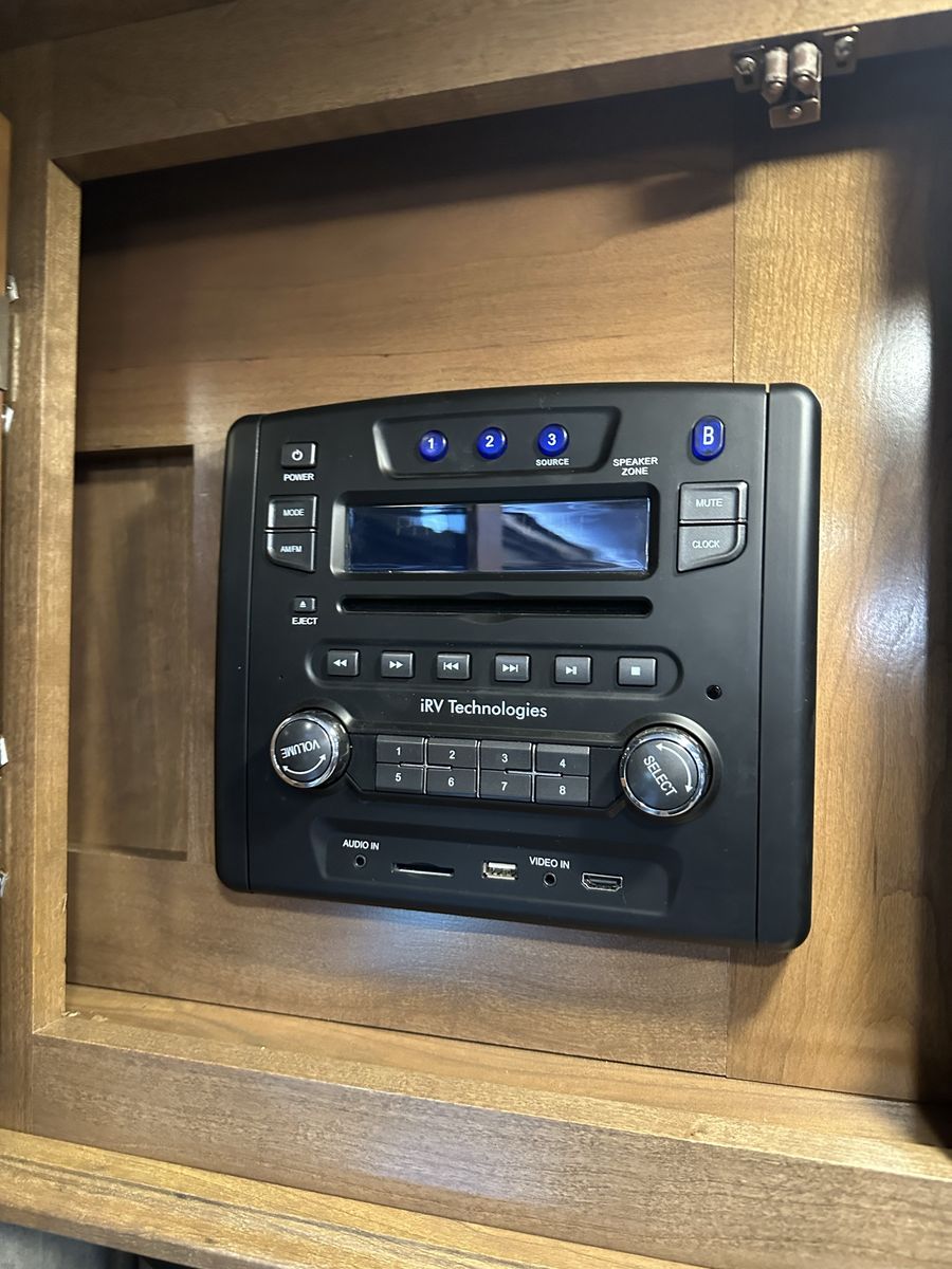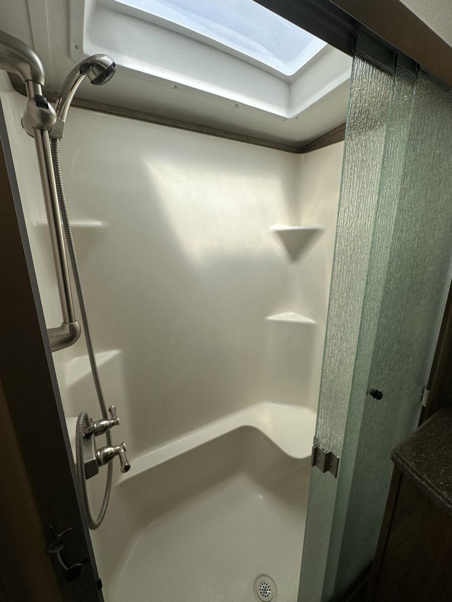 Features: •Air conditioning and heating- 15,000 BTU Central/Ducted, furnace heating •Appliances- Intervac central vacuum system with attachments included, refrigerator 4dr, microwave(convection)/hood combo, water heater 10gal gas/elec, washer and dryer hookups. •Entertainment- 2 flat screen TV’s with travel straps, Radio/CD/DVD player, Dish satellite, satellite with auto seek, exterior stereo speakers, in underbelly compartments there are outlets to plug in for TV or other equipment, satelite and cable hookups in underbelly compartment. •Jacks and leveling system- hydraulic leveling jacks. •Misc. Equipment- Fireplace, ceiling fan, flood light, LED ceiling lighting, backup camera, 1 skylight, 2 power roof vent with rain and wind sensors, 1 manual roof vent, spare tire and carrier, slide out tray full pass through, glass shower enclosure, 2 couch bed pullouts, 2 under bed storage (queen size bed), newly replaced fire alarm, touch screen control panel, incommand control systems, all window blinds come with shade and black out curtains, exterior lighting in front, tires in great condition, mirrored sliding barn doors in bedroom for closet, heated flooring in bathroom, pull down stainless steal kitchen faucet, CO2 detector. •10-11.5' awning •Cabinet upgrade DELUXE •Aluminum wheels •Solar panel •Power slide outs- 1 bedroom, 2 kitchen, 2 living room. Newly replaced slide out gear box for living room. •Also included- fifth wheel hitch attachment, dining table covers, couch covers, spice rack installed on wall in kitchen, 4 dining chairs (2 are collapsable), expandable dining table, water hose, power adapter, two large propane tanks, sewer hose, all manuals and remotes, cup holders on walls next to couches.