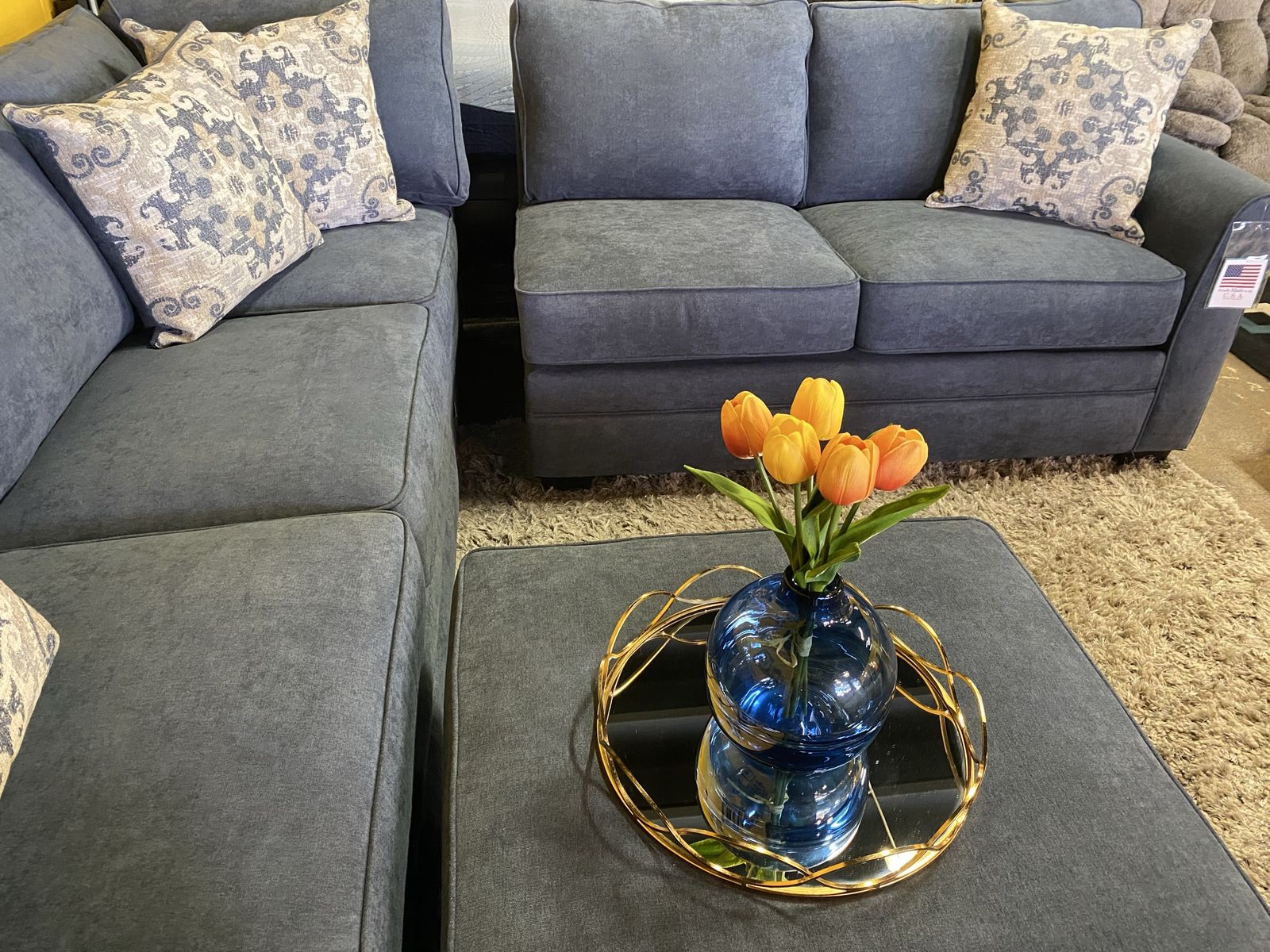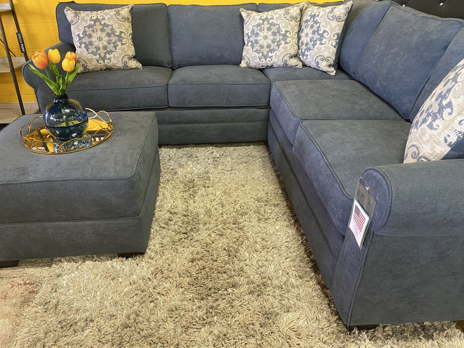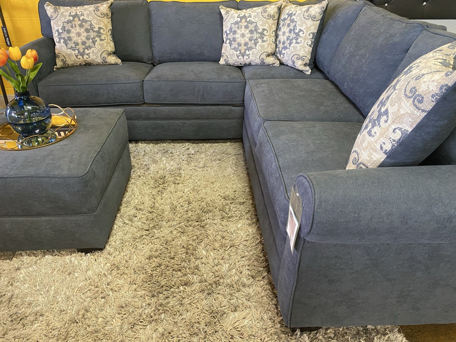 Brand new fabric sectional two pieces plus matching ottoman Reversible Cushions and Pillows. Color: Slate Dimensions (L101" × L101"x H38" X D37"). Delivery for extra fee Cash or card !!
