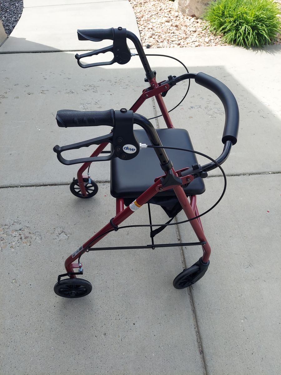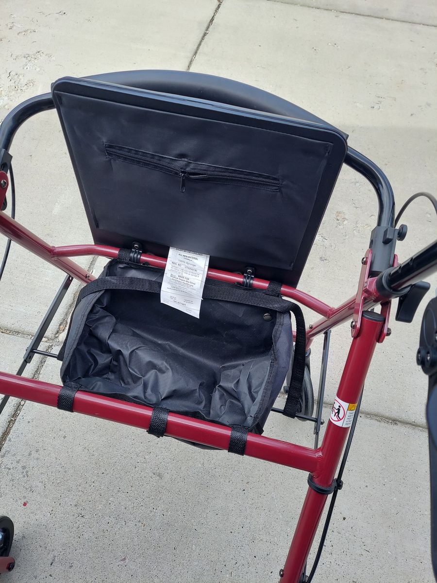 Walker with wheels, brakes, seat, and under seat pocket.