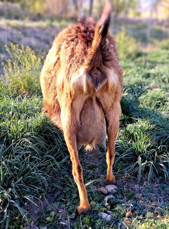 This sweet nanny had twins January '26 and has kept up with them well. She is an Oberhasli goat. She is very tame and well mannered to milk, she is currently still producing. The twins took a lot of her supply but now that they are weaned shecould give some good milk. $100