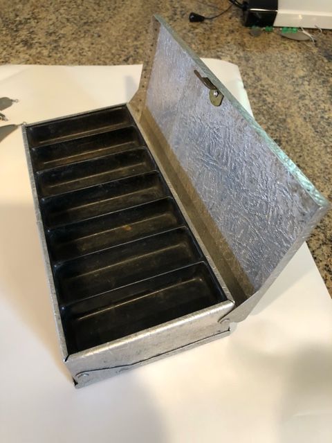 VenmoVintage (1950's) tackle box with 50 same-era brass and nickel spinners. I researched the tackle box company and placed it as a 1953-55 vintage. I found this among my fathers fishing gear in his attic. The box is in excellent shape and contains a variety of size 0-3 spinners many of which are stamped Swiss Swings. Selling it as one lot. Make offer if interested.