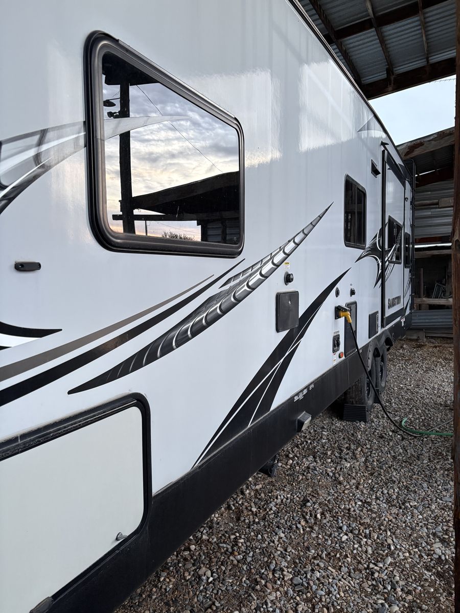 Bought it brand new. On board generator. Sleeps roughly 8. Fuel station. Automatic awning. slide out in the couch area. Lot of storage. Looking to get a fifth wheel. Has been parked under a barn.