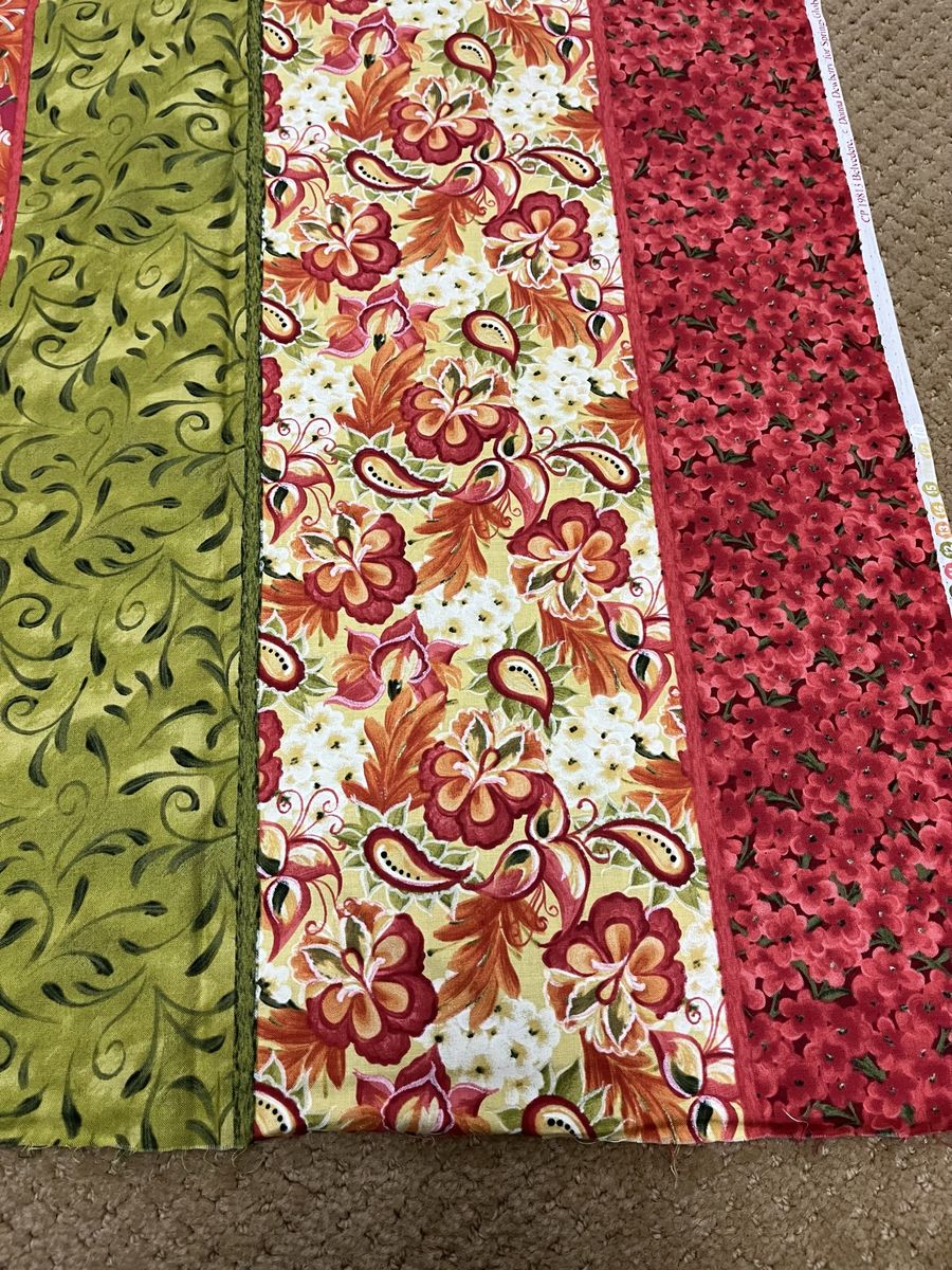 VenmoThis material is stunning! My pictures do not show how vibrant the colors are. They are deeper and brighter than the pictures show. There are three pieces. The large print yellow piece is three yards. The other two striped type pieces are matching. One is two yards and 20 inches and the other is two yards two inches. This is by Donna Dewberry. The colors are yellows, greens, orange, pink, red, and a creamy white. These are a quality quilting materail. Must see! Price is firm.