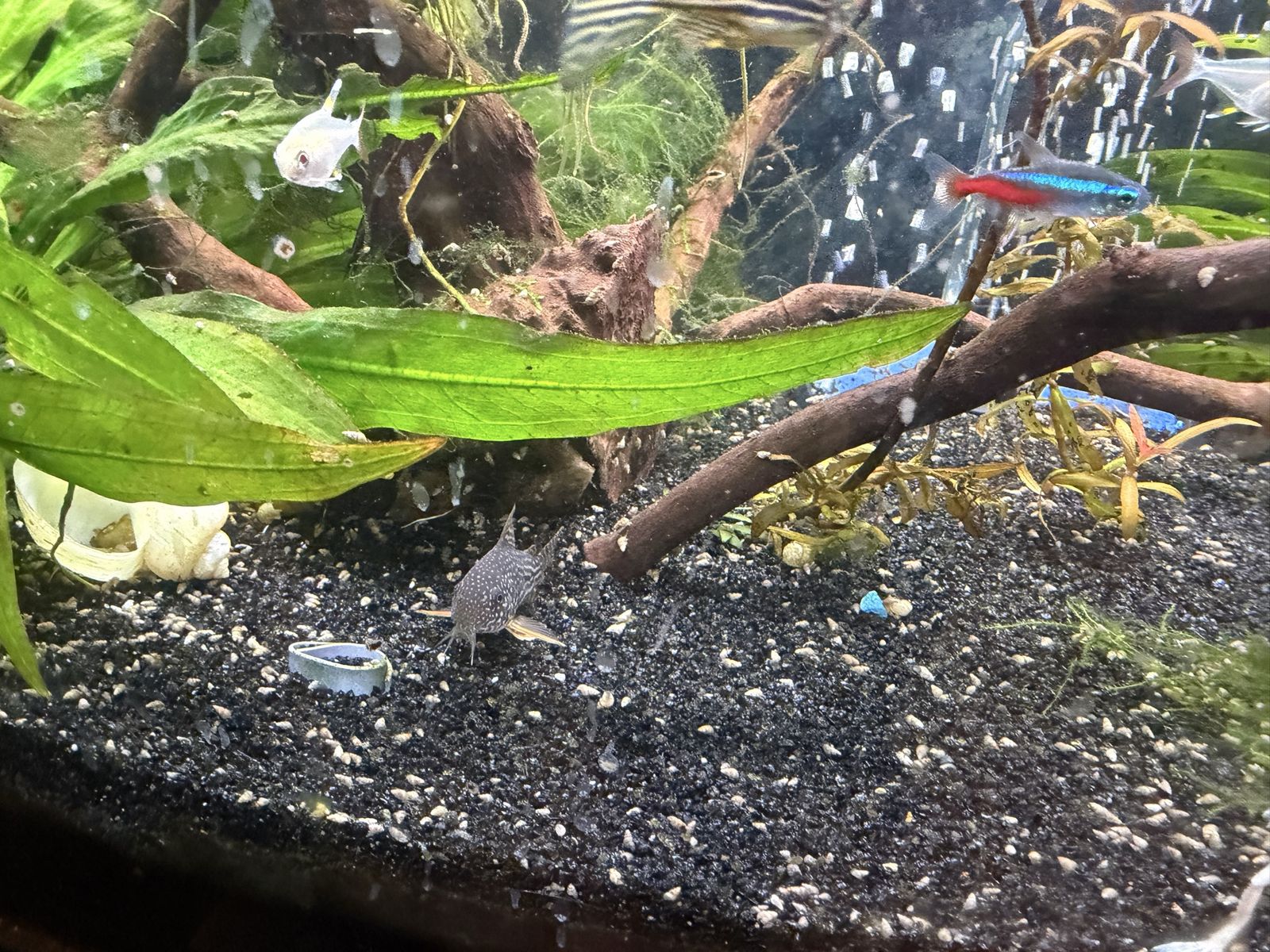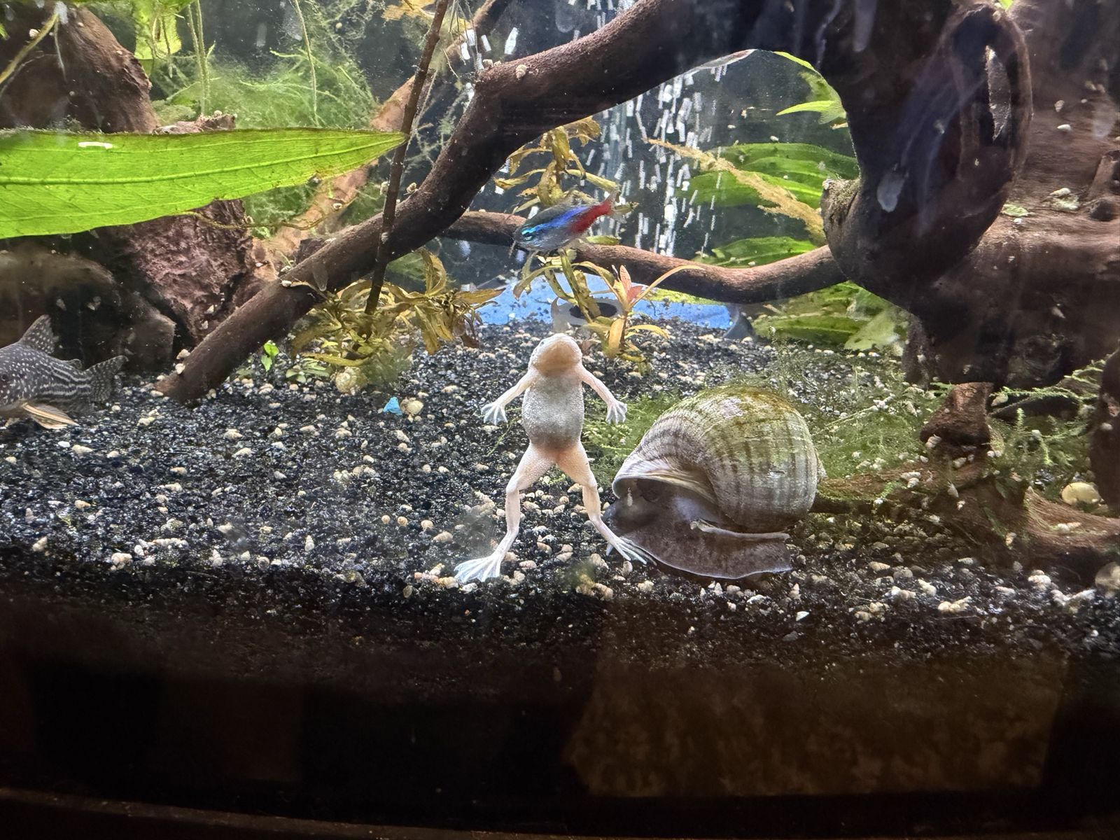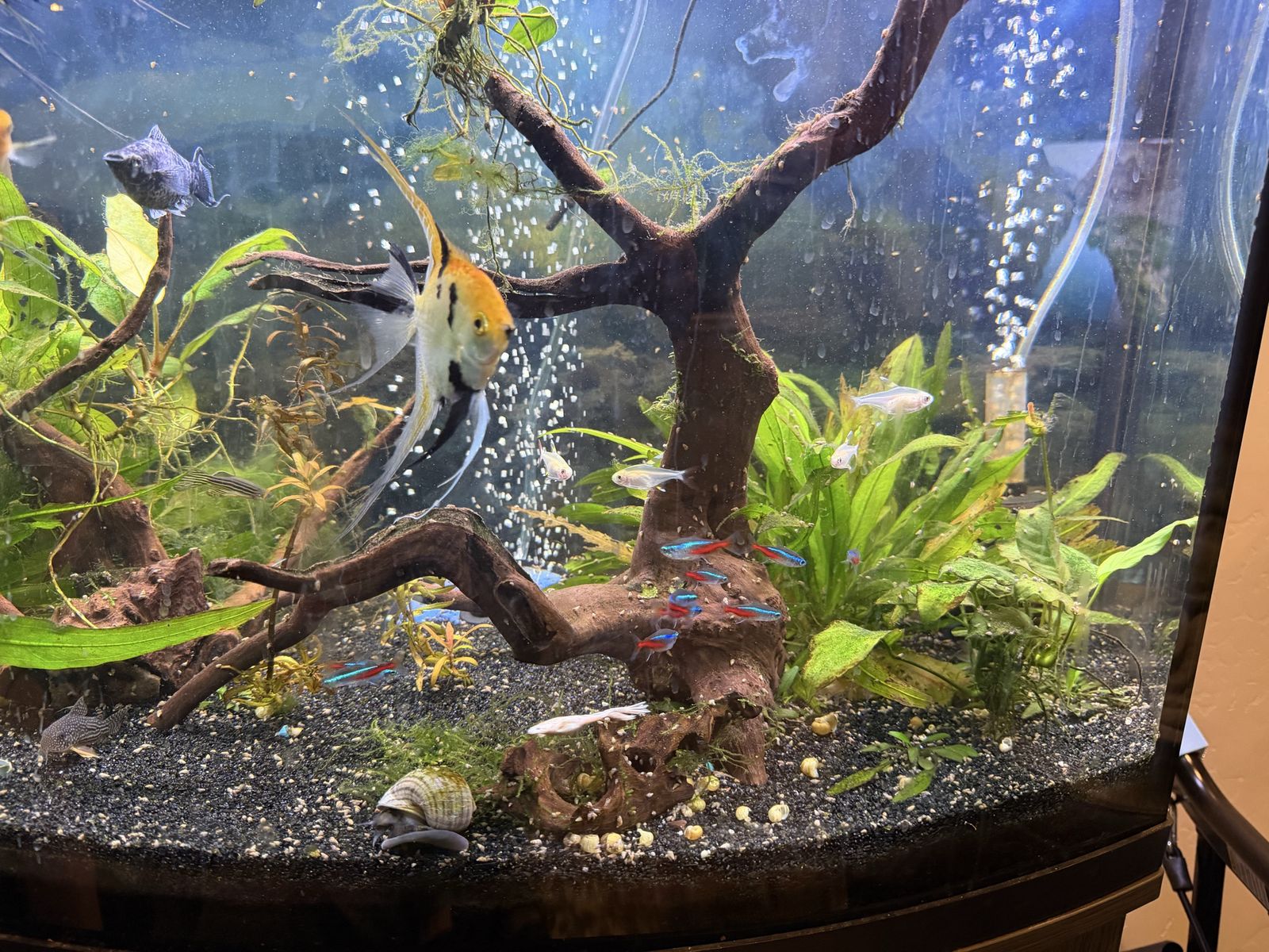 Venmo36 gallon bowfront tank. Comes with filters (canister Oase filter that has the heater in it and a sponge filter inside the tank), light and air pump. Has 2 angelfish, a male and a female, 2 mollies, 2 vampire shrimp, 2 eels, 3 African dwarf frogs (so cute to watch!), some neon tetras, Priscilla tetras, 2 zebra danios and a couple of guppies. We’d like to sell everything together.