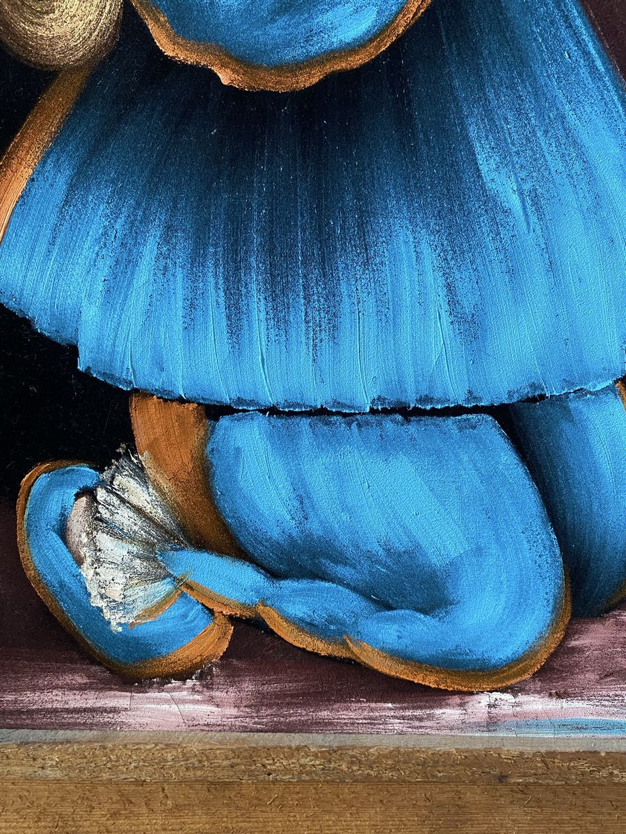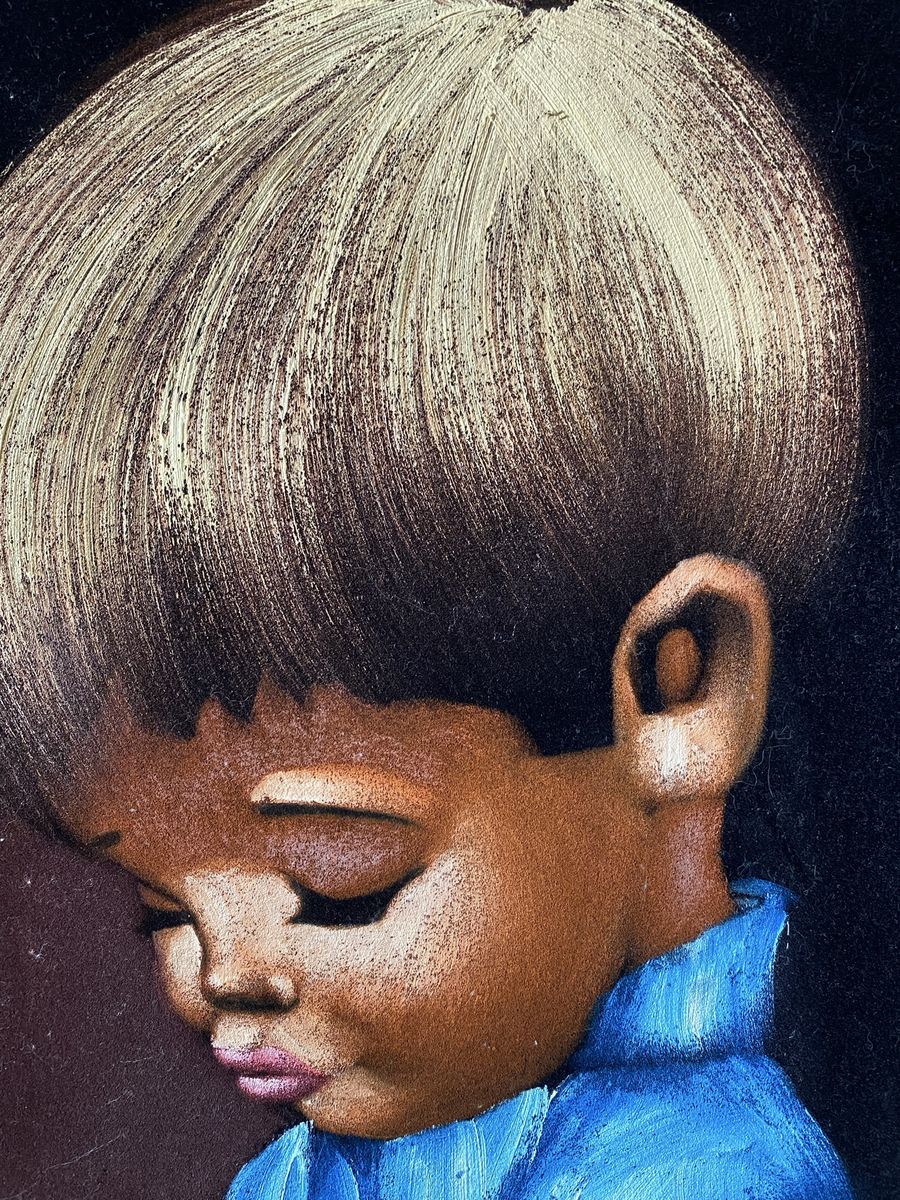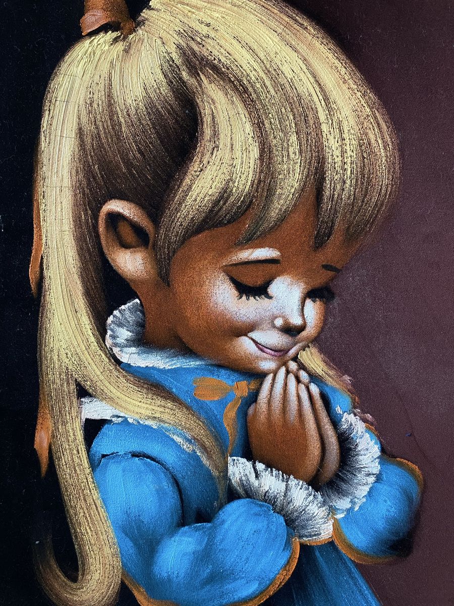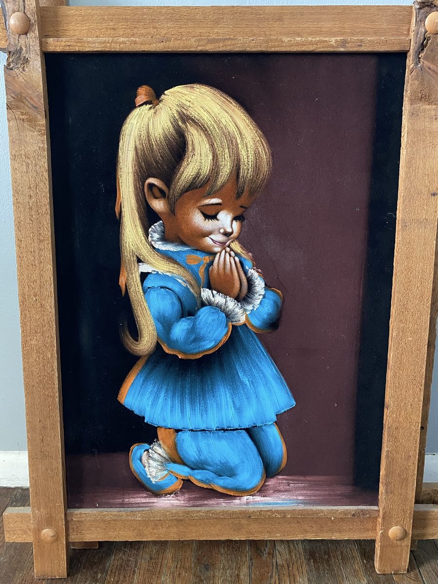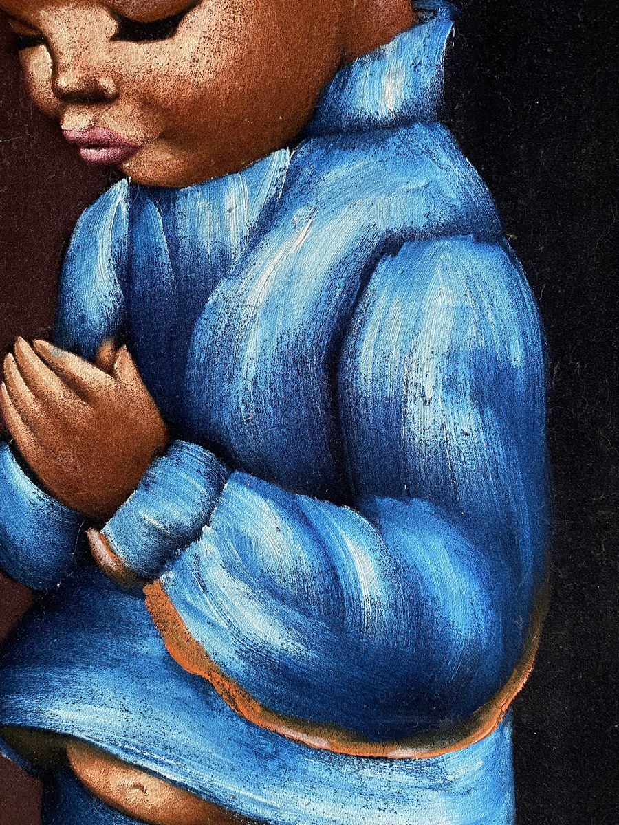 VenmoVintage pair (set of two) large black velvet paintings featuring two children praying in blue matching outfits. This set is framed in wood and Mexico is written on the back. Both paintings have a wire to hang and are ready to be displayed! See measurements in photos for exact size. Framed size is roughly 30W by 39H