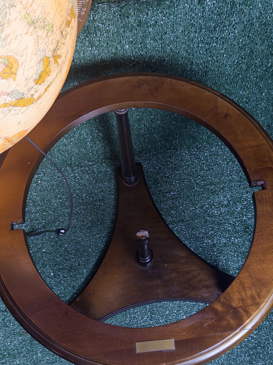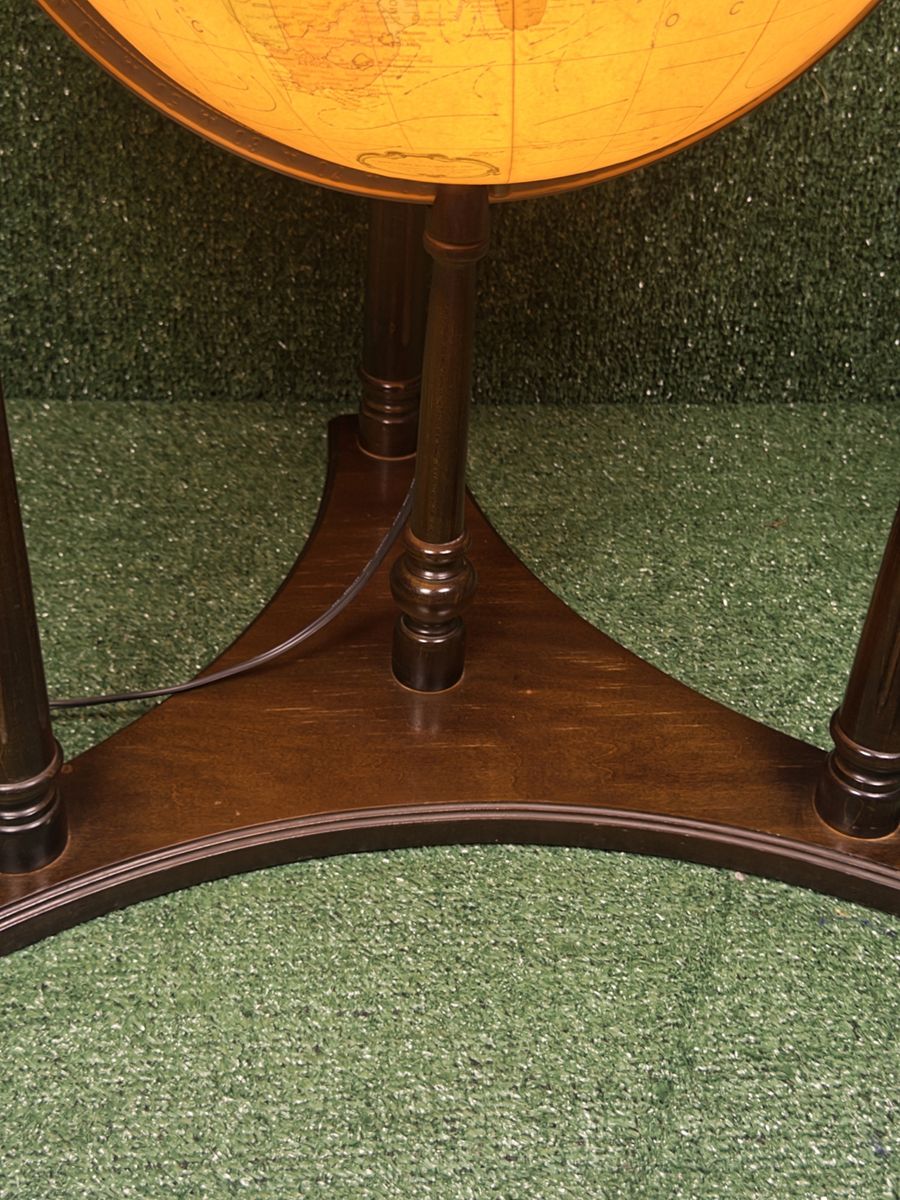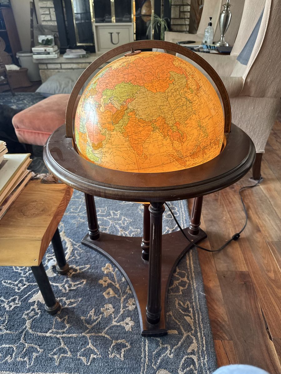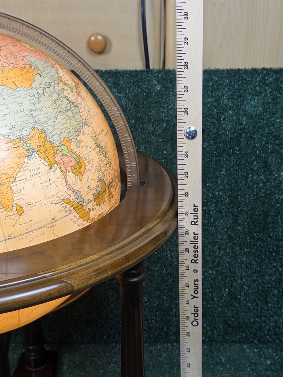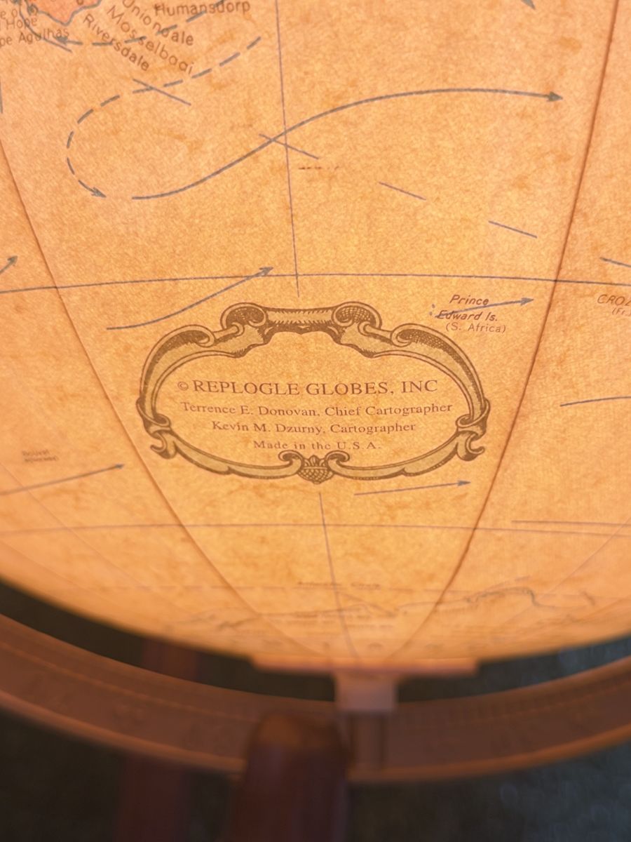 ZelleReplogle Heirloom Collection 16” illuminated floor globe on a wooden tripod-column stand. Antique ocean political map, made in USA. Likely produced between 2006–2011 based on the political boundaries shown (Serbia is present, South Sudan is not). Light works, globe spins freely. Roughly 36” tall — nice statement piece for an office or library. Condition: Very good. A couple of small dings on the wooden ring at the base of the cradle (minor, pictured). Globe sphere itself is in amazing shape — clean, no tears, colors still vibrant.