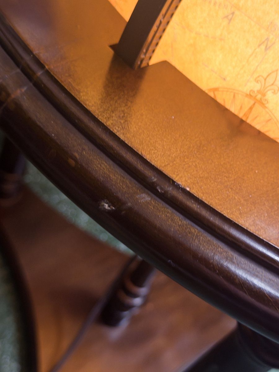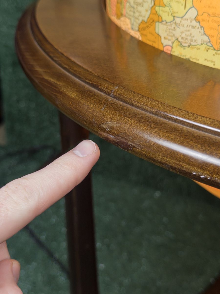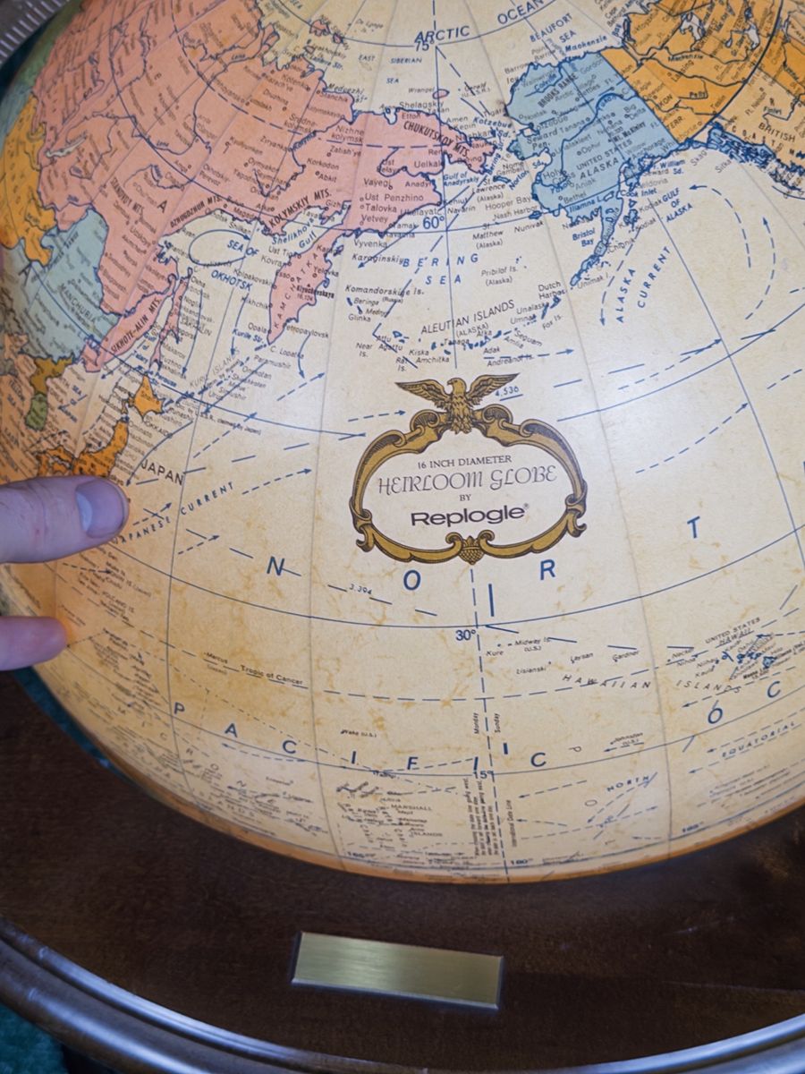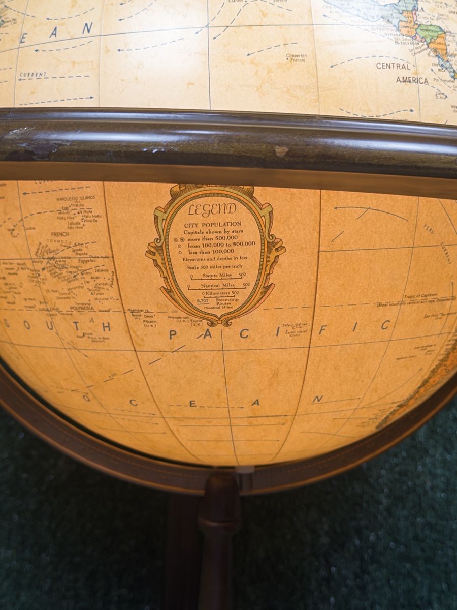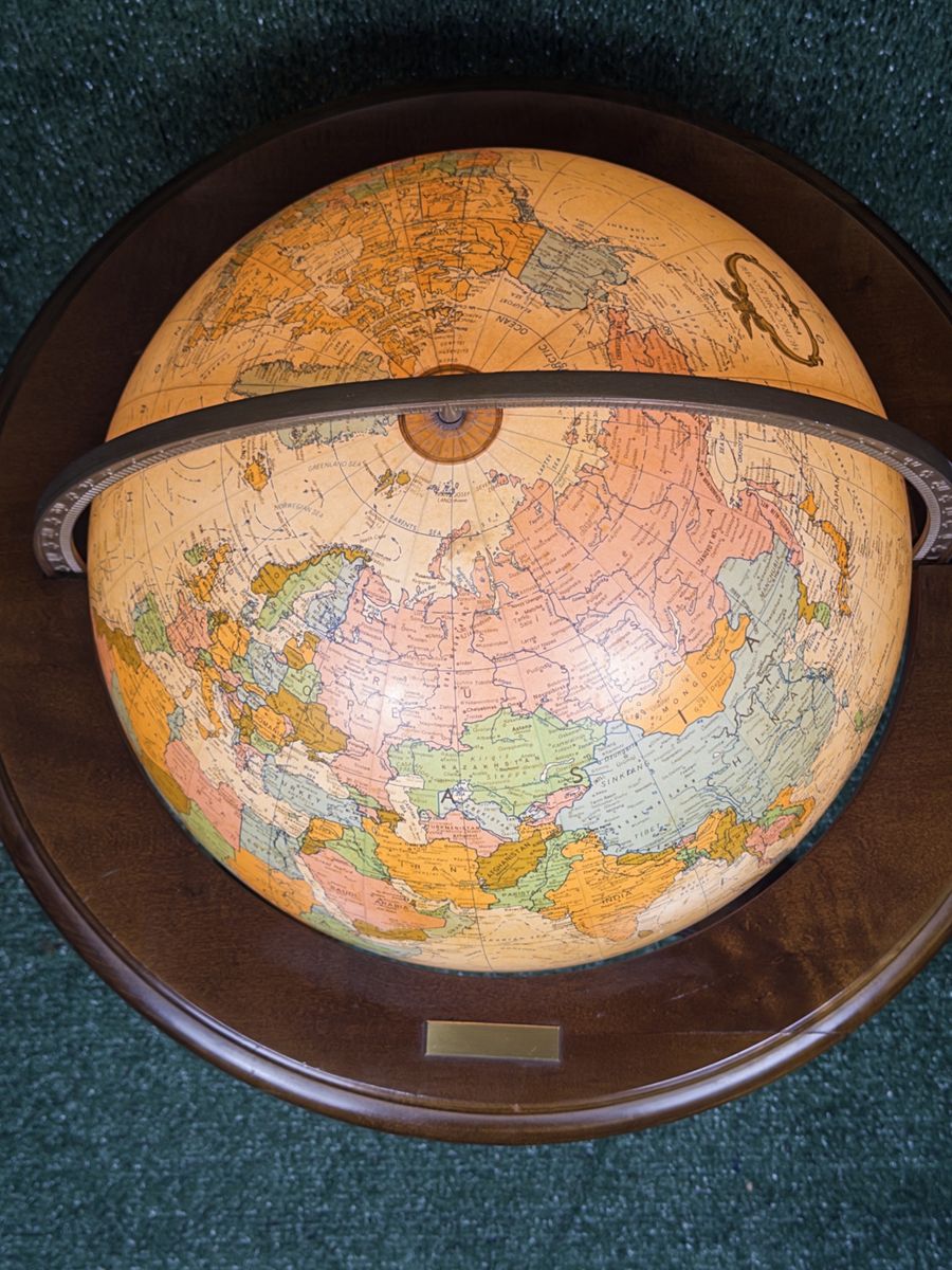 ZelleReplogle Heirloom Collection 16” illuminated floor globe on a wooden tripod-column stand. Antique ocean political map, made in USA. Likely produced between 2006–2011 based on the political boundaries shown (Serbia is present, South Sudan is not). Light works, globe spins freely. Roughly 36” tall — nice statement piece for an office or library. Condition: Very good. A couple of small dings on the wooden ring at the base of the cradle (minor, pictured). Globe sphere itself is in amazing shape — clean, no tears, colors still vibrant.