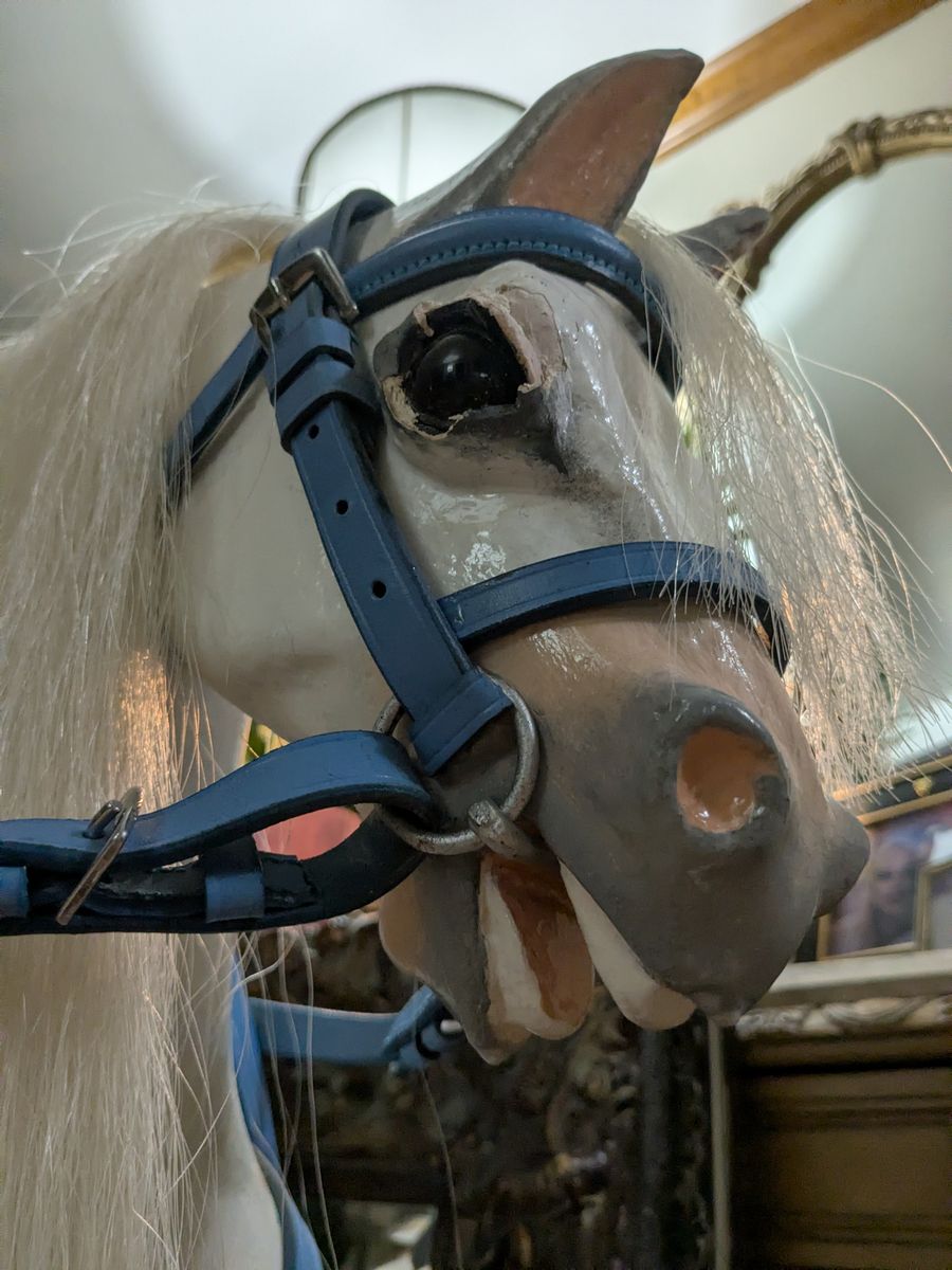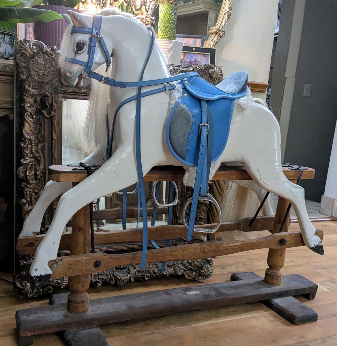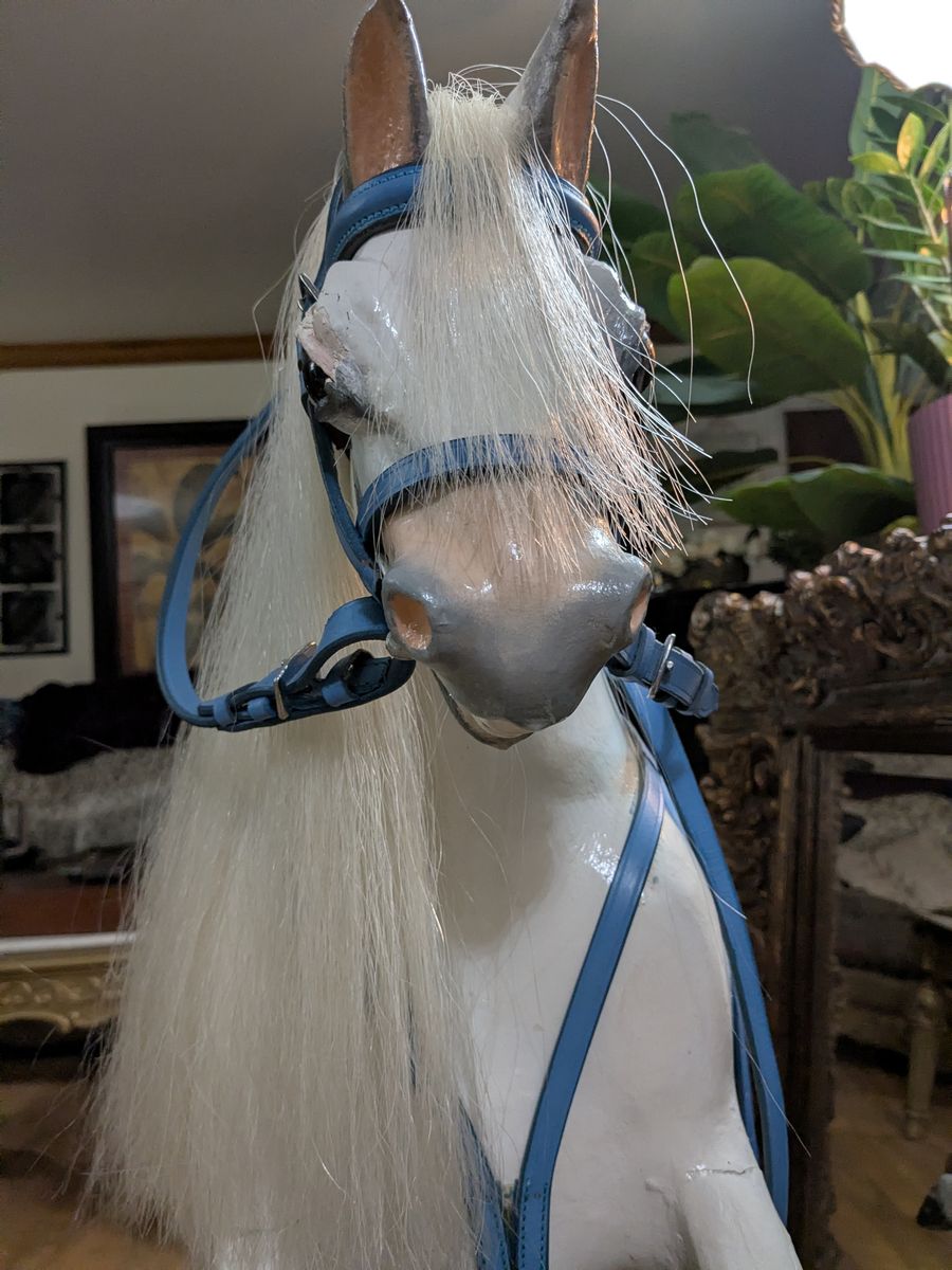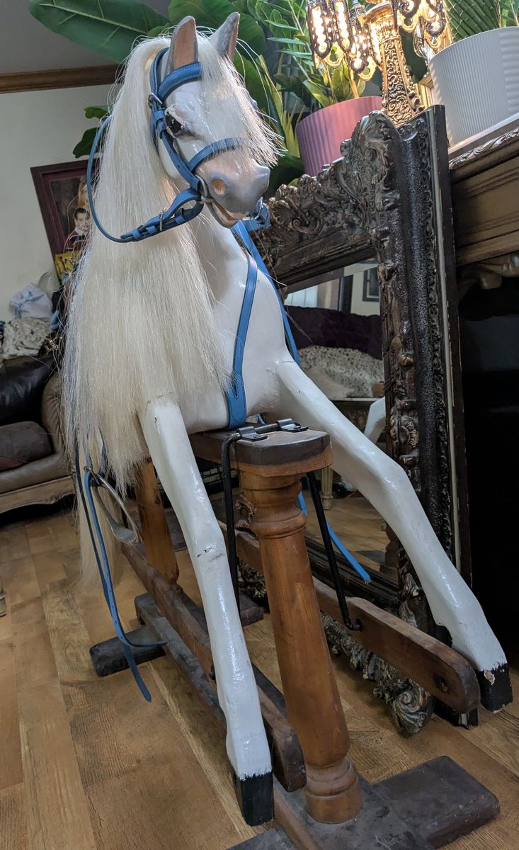 F.H. Ayers Style English Imported Antique Wood Hand Carved Rocking Horse. Horse was imported from England and restored here. Painted white with new saddle and bridle.Excellent condition. Sturdy and rideable.43x49