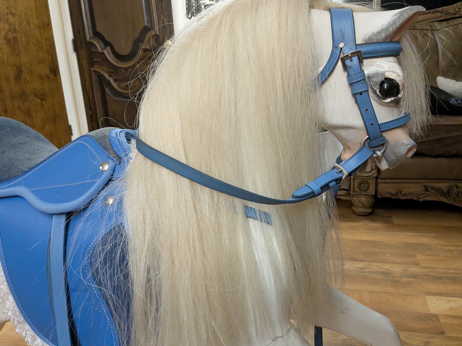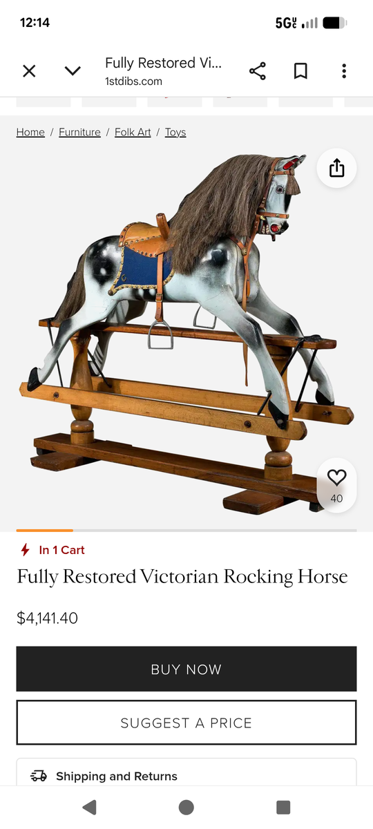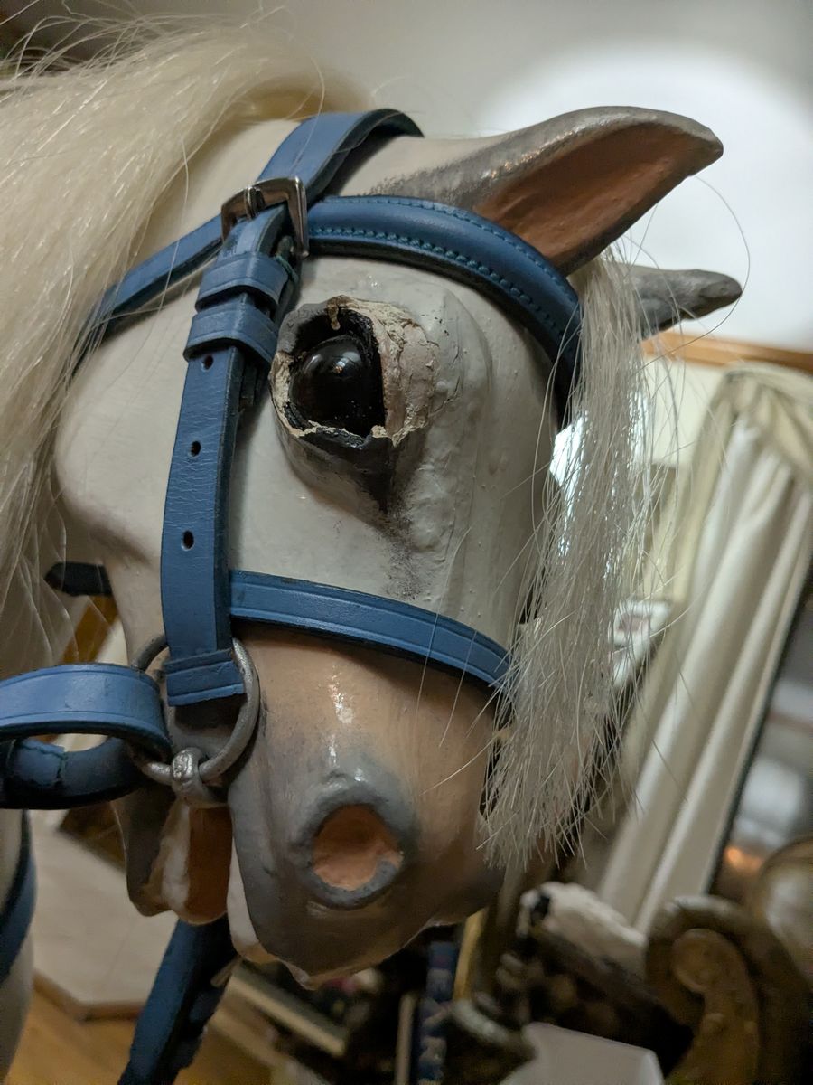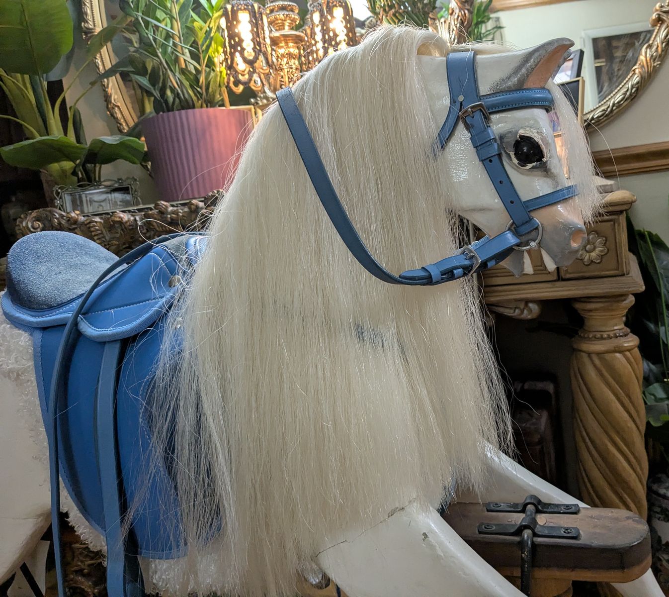 F.H. Ayers Style English Imported Antique Wood Hand Carved Rocking Horse. Horse was imported from England and restored here. Painted white with new saddle and bridle.Excellent condition. Sturdy and rideable.43x49