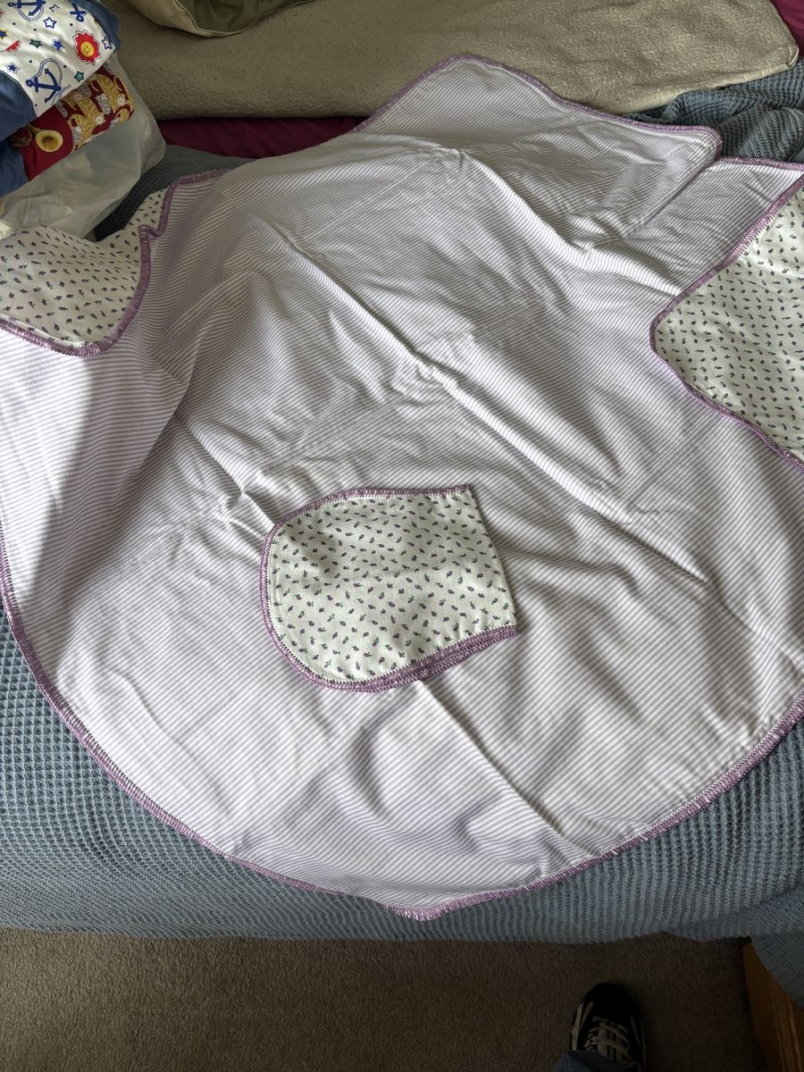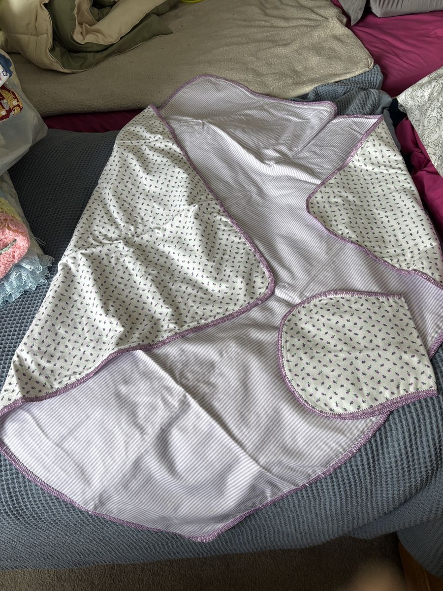 VenmoReceiving blanket 45”x45” with matching burp cloth. Purple edging with small purple flowers and back has purple stripes.