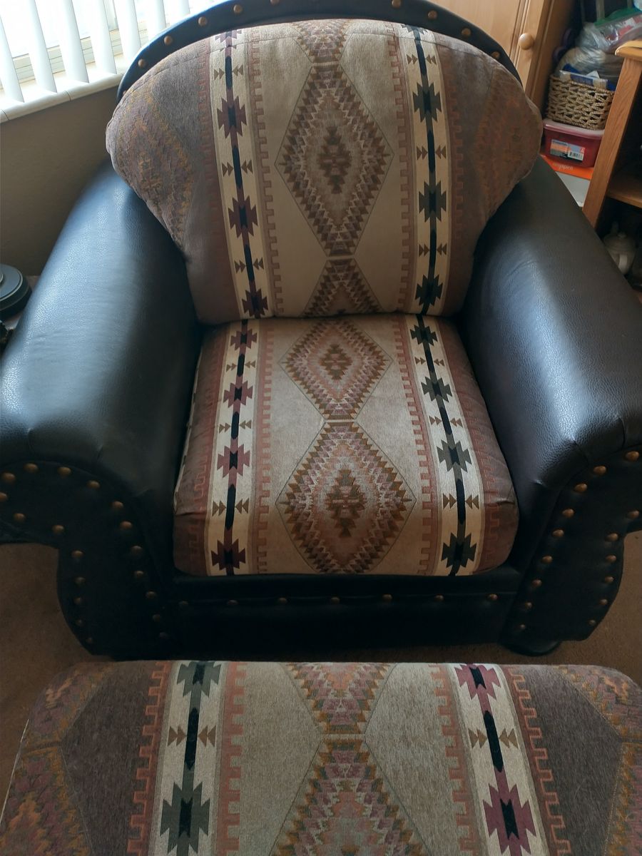 Made by INTERMOUNTAIN FURNITURE COMPANY. CHAIR IS 44"W x 42"D OTTOMAN IS 24" x 32". Most comfortable chair to sit in. The set new was $1400 will sell for $875. CASH ONLY. NO EMAILS 801-792-1933 Text is best or leave a message and I'll call you back. Thanks for looking.