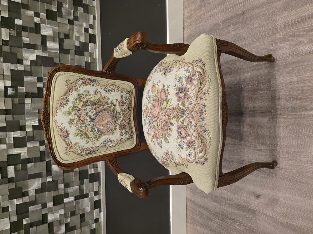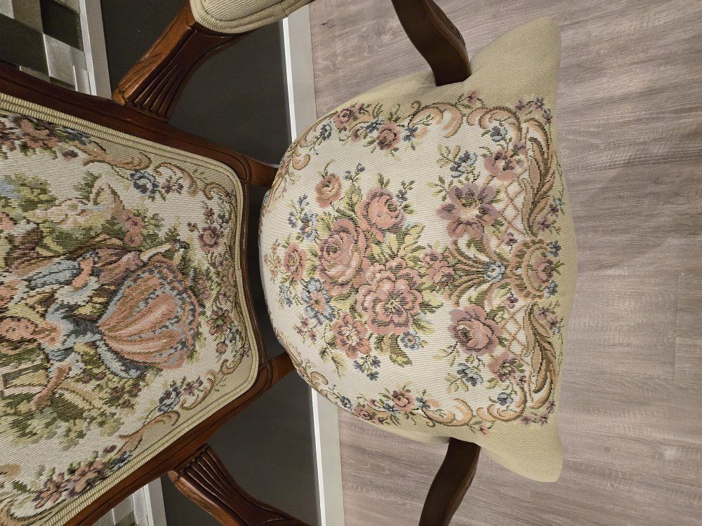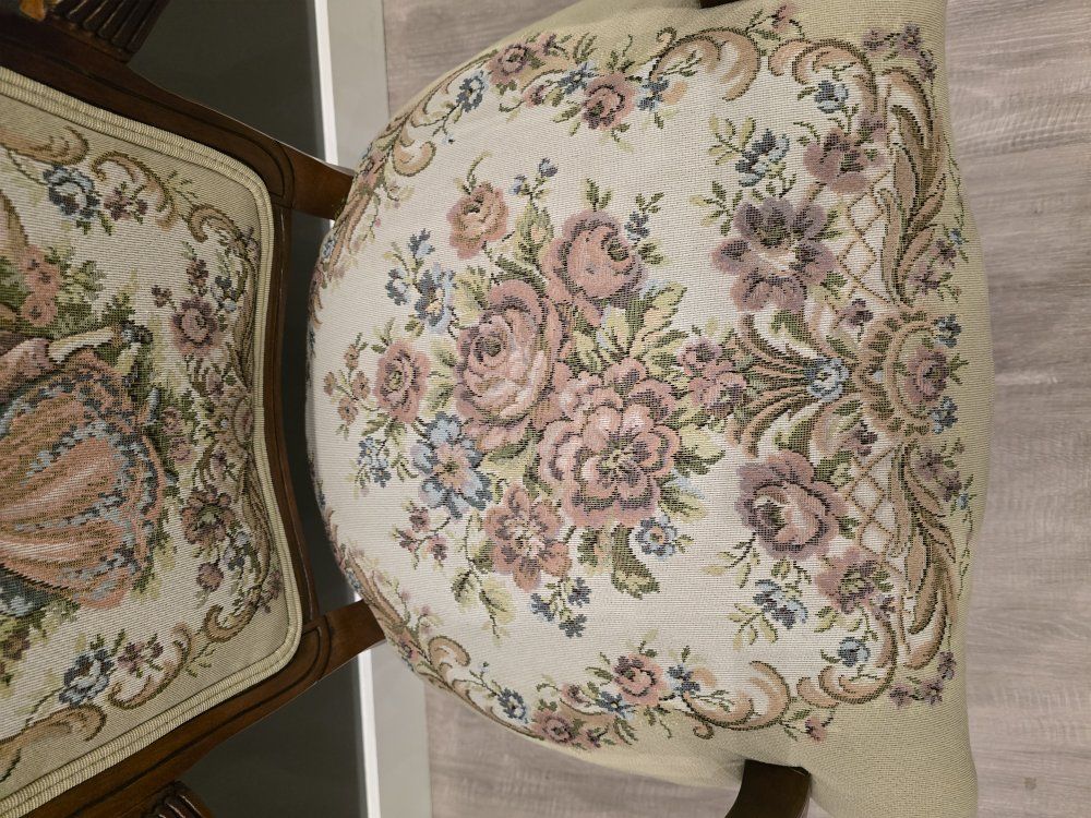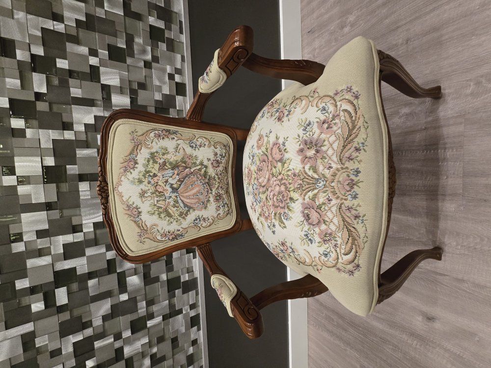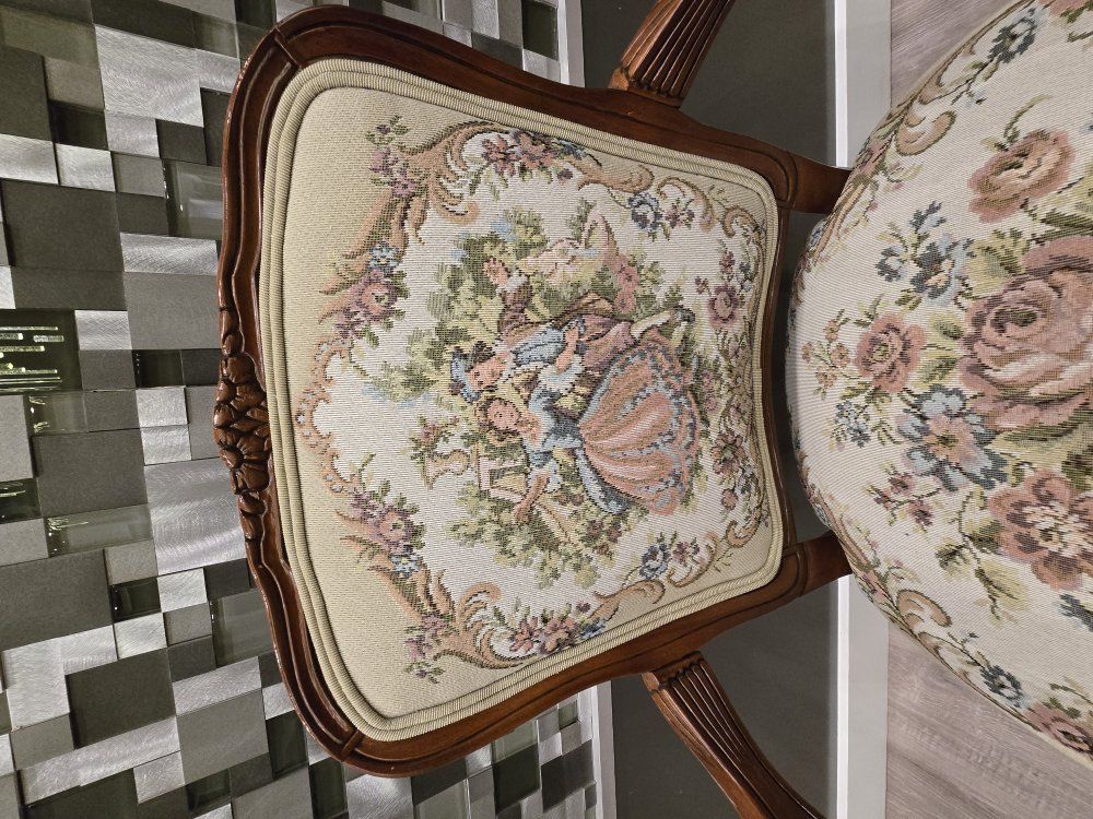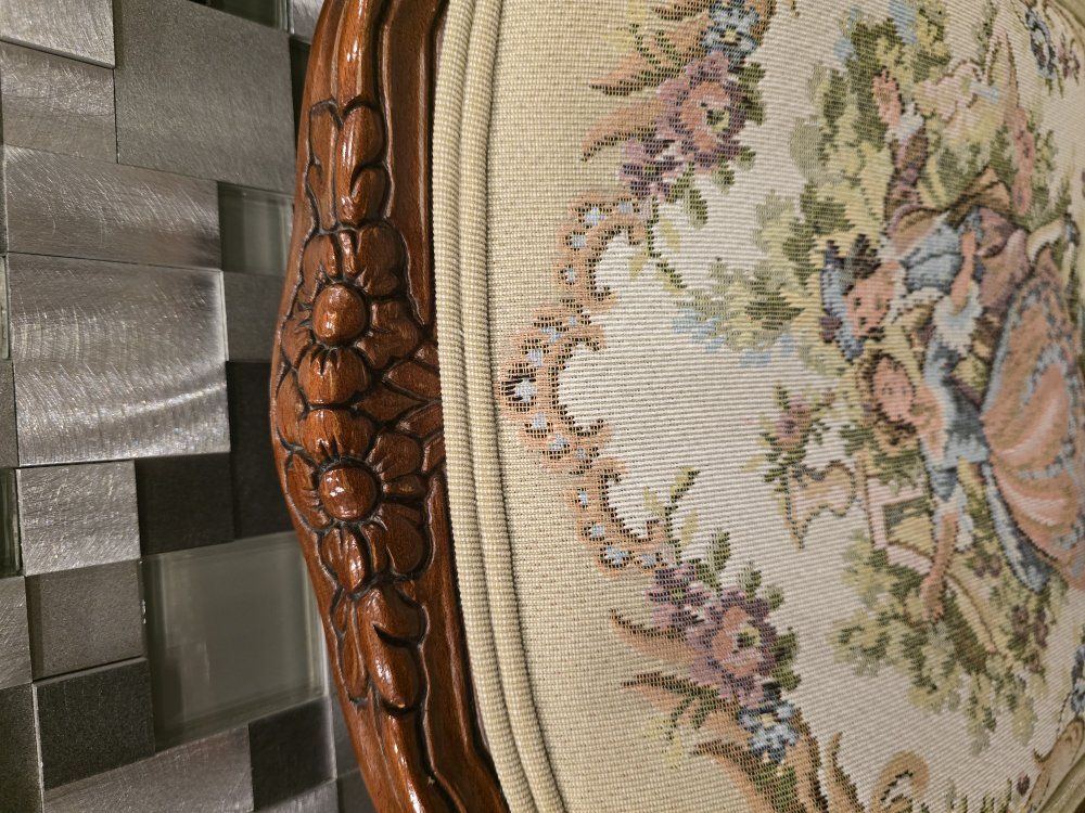 ZelleUp for sale is a stunning matching pair of Louis XV style "Fauteuil" armchairs. These are high-end designer pieces that perfectly blend European craftsmanship with professional American finishing. If you are looking for timeless "French Provincial" or "Grandmillennial" statement pieces, these are in incredible collector-grade condition. The Provenance & Quality: Authentic Italian Frames: The solid wood frames were hand-carved in Italy, featuring elegant Cabriole legs and ornate floral crest carvings. Designer Finished: These were upholstered and finished in the USA in October 2001. Workshop Provenance: Both chairs feature identical handwritten workshop markings on the underside material, confirming they were produced as a coordinated set. One chair still retains the original manufacturer law tags and production stamps. Pastoral Tapestry: The backrests feature a beautifully woven "Fête Galante" scene (classic 18th-century romantic parkland imagery), while the seats feature a matching floral bouquet. This is high-quality woven fabric, not a print. Lightweight & Sturdy: Despite being structurally rock-solid, these frames are relatively lightweight (likely beech or fruitwood), making them easy to rearrange in your home. Condition: Excellent vintage condition. They have been meticulously cared for in a smoke-free environment. The upholstery is clean with no stains, tears, or fading, and the high-density foam seating remains firm and comfortable. Terms: Sold as a matching pair only. $1,150 for the set. These are valued significantly higher in designer showrooms ($1,800+), but I am pricing them for a straightforward local sale. Location: Local pickup in Northern Utah. These will fit easily in an SUV or truck.