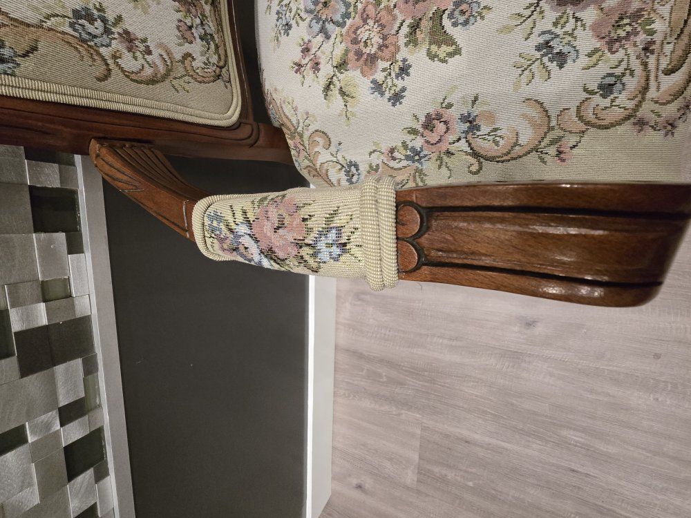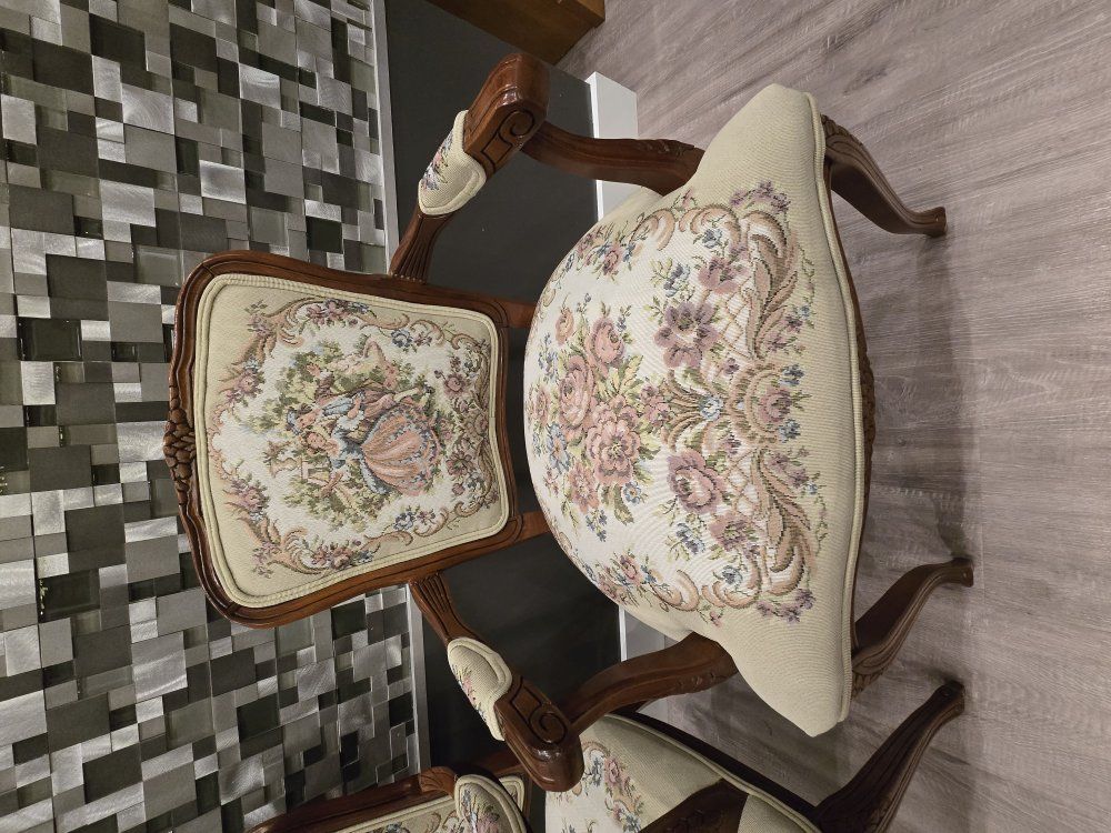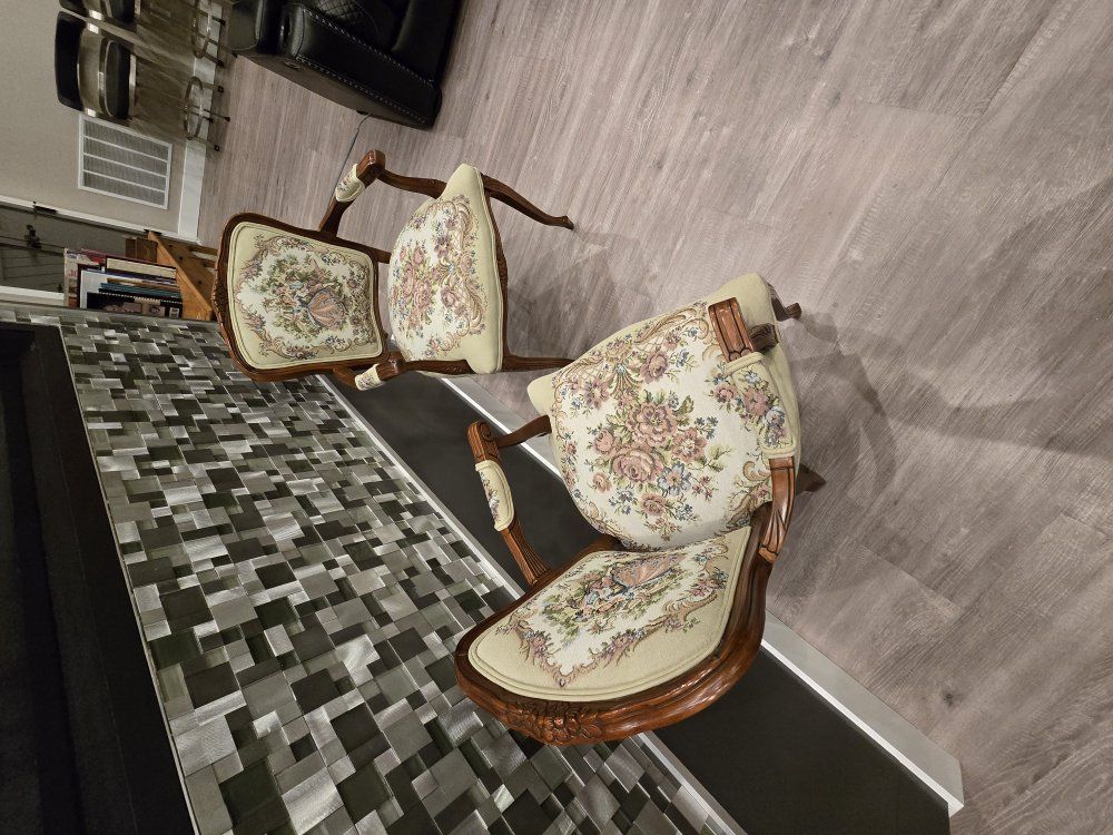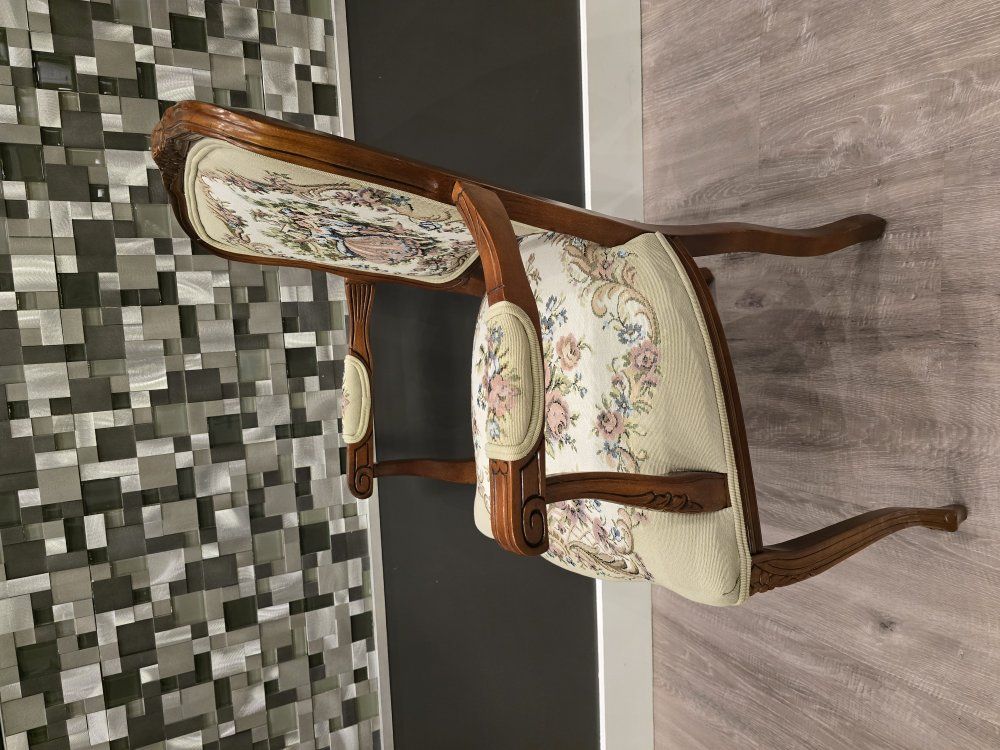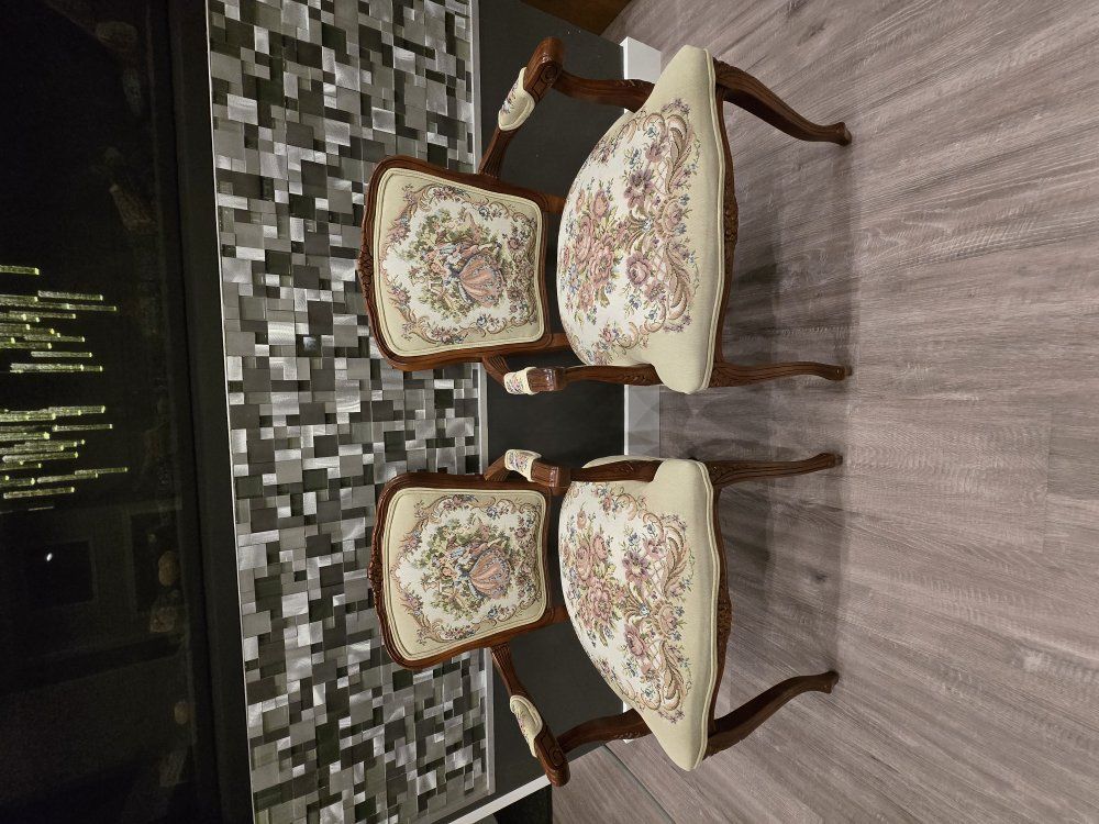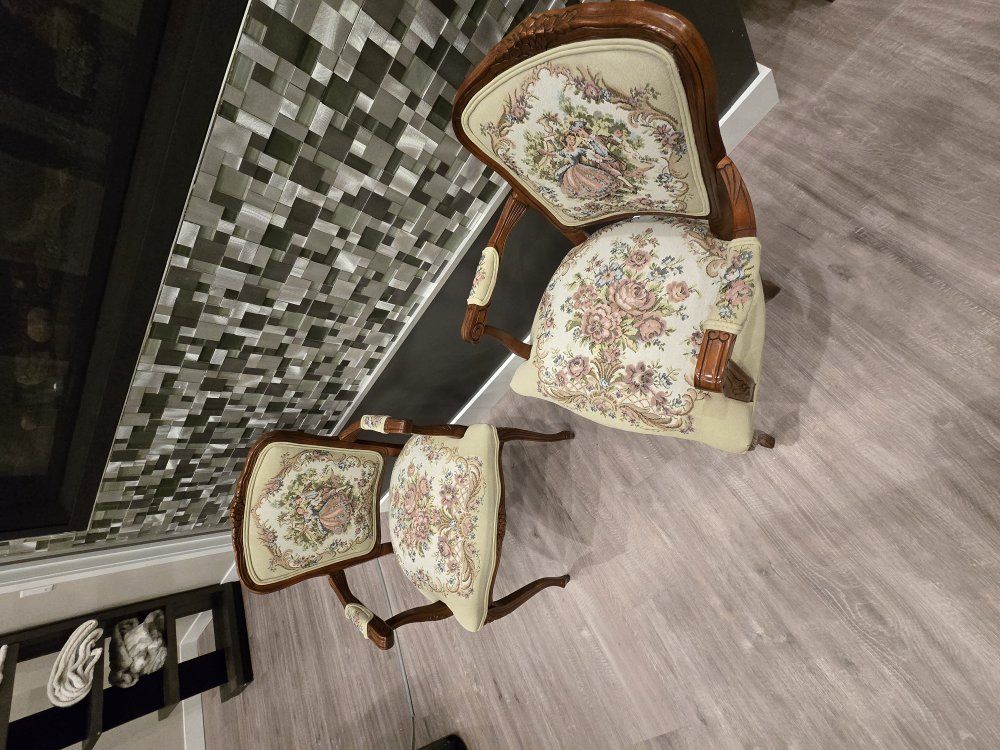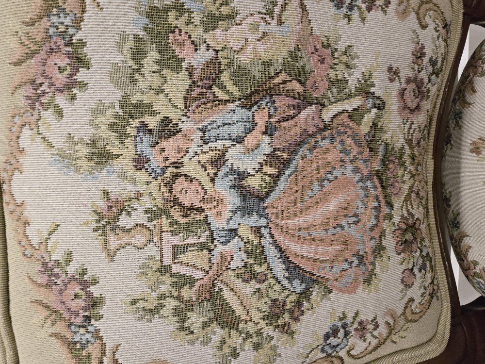 ZelleUp for sale is a stunning matching pair of Louis XV style "Fauteuil" armchairs. These are high-end designer pieces that perfectly blend European craftsmanship with professional American finishing. If you are looking for timeless "French Provincial" or "Grandmillennial" statement pieces, these are in incredible collector-grade condition. The Provenance & Quality: Authentic Italian Frames: The solid wood frames were hand-carved in Italy, featuring elegant Cabriole legs and ornate floral crest carvings. Designer Finished: These were upholstered and finished in the USA in October 2001. Workshop Provenance: Both chairs feature identical handwritten workshop markings on the underside material, confirming they were produced as a coordinated set. One chair still retains the original manufacturer law tags and production stamps. Pastoral Tapestry: The backrests feature a beautifully woven "Fête Galante" scene (classic 18th-century romantic parkland imagery), while the seats feature a matching floral bouquet. This is high-quality woven fabric, not a print. Lightweight & Sturdy: Despite being structurally rock-solid, these frames are relatively lightweight (likely beech or fruitwood), making them easy to rearrange in your home. Condition: Excellent vintage condition. They have been meticulously cared for in a smoke-free environment. The upholstery is clean with no stains, tears, or fading, and the high-density foam seating remains firm and comfortable. Terms: Sold as a matching pair only. $1,150 for the set. These are valued significantly higher in designer showrooms ($1,800+), but I am pricing them for a straightforward local sale. Location: Local pickup in Northern Utah. These will fit easily in an SUV or truck.