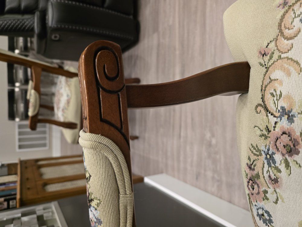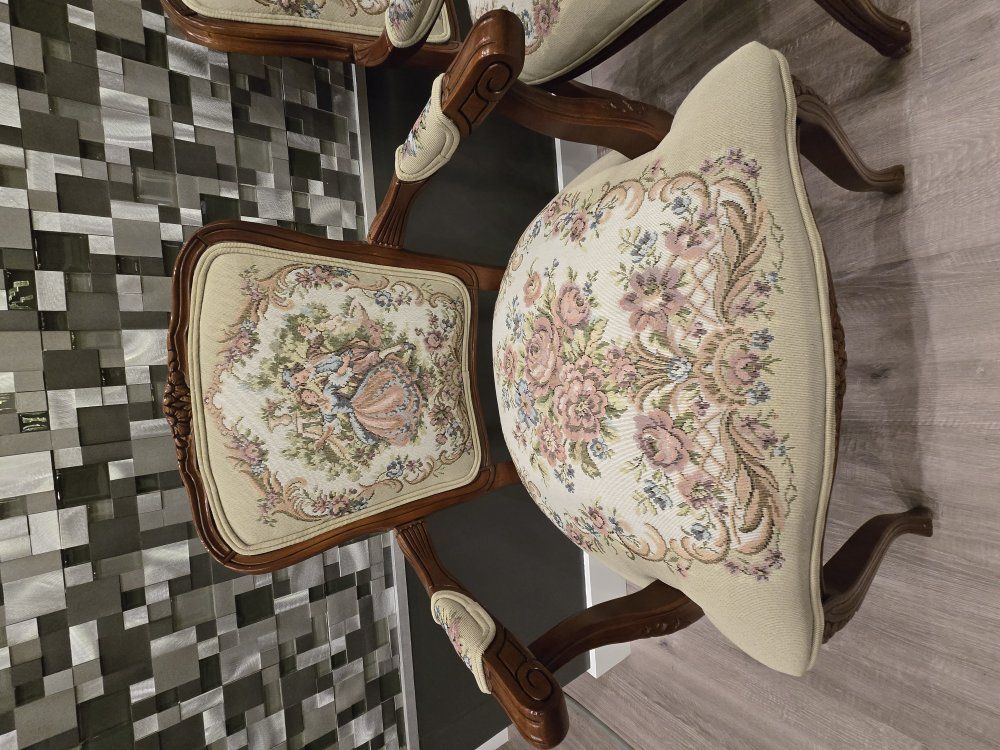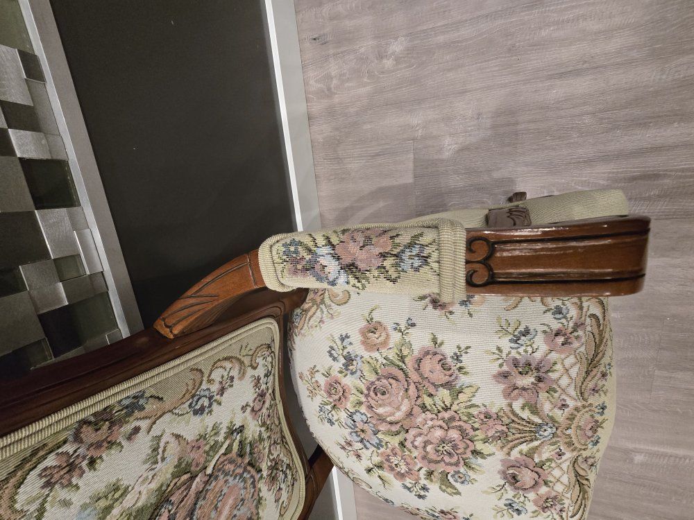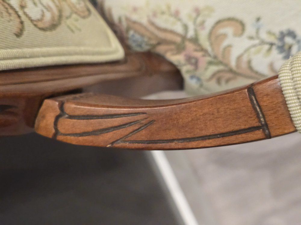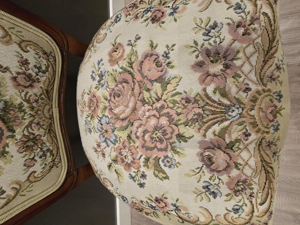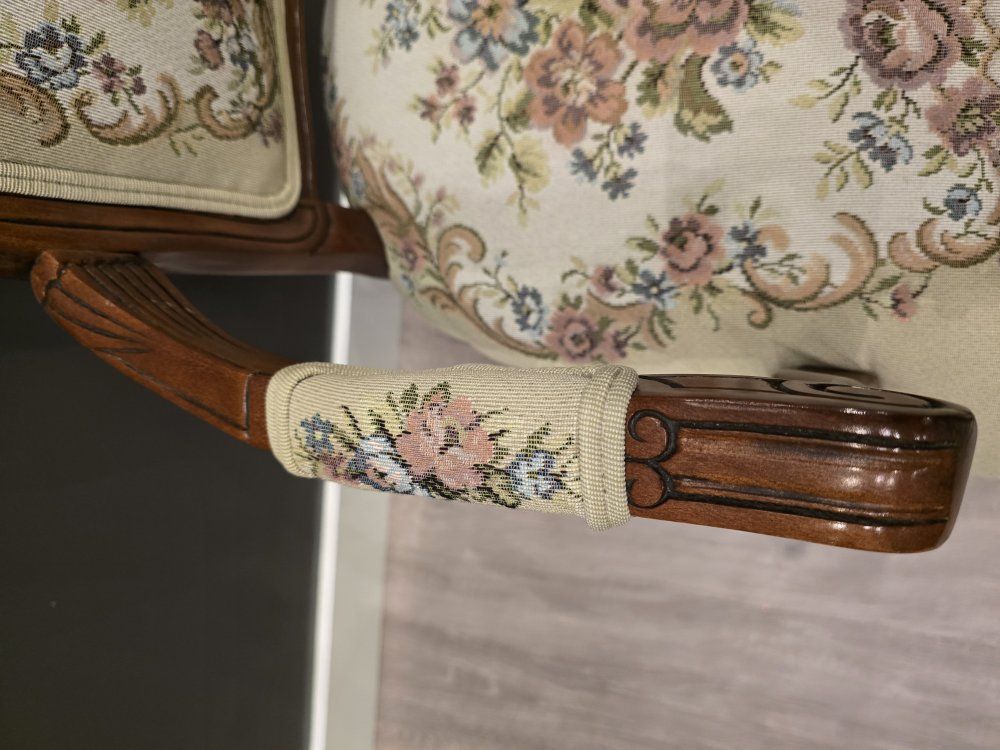 ZelleUp for sale is a stunning matching pair of Louis XV style "Fauteuil" armchairs. These are high-end designer pieces that perfectly blend European craftsmanship with professional American finishing. If you are looking for timeless "French Provincial" or "Grandmillennial" statement pieces, these are in incredible collector-grade condition. The Provenance & Quality: Authentic Italian Frames: The solid wood frames were hand-carved in Italy, featuring elegant Cabriole legs and ornate floral crest carvings. Designer Finished: These were upholstered and finished in the USA in October 2001. Workshop Provenance: Both chairs feature identical handwritten workshop markings on the underside material, confirming they were produced as a coordinated set. One chair still retains the original manufacturer law tags and production stamps. Pastoral Tapestry: The backrests feature a beautifully woven "Fête Galante" scene (classic 18th-century romantic parkland imagery), while the seats feature a matching floral bouquet. This is high-quality woven fabric, not a print. Lightweight & Sturdy: Despite being structurally rock-solid, these frames are relatively lightweight (likely beech or fruitwood), making them easy to rearrange in your home. Condition: Excellent vintage condition. They have been meticulously cared for in a smoke-free environment. The upholstery is clean with no stains, tears, or fading, and the high-density foam seating remains firm and comfortable. Terms: Sold as a matching pair only. $1,150 for the set. These are valued significantly higher in designer showrooms ($1,800+), but I am pricing them for a straightforward local sale. Location: Local pickup in Northern Utah. These will fit easily in an SUV or truck.