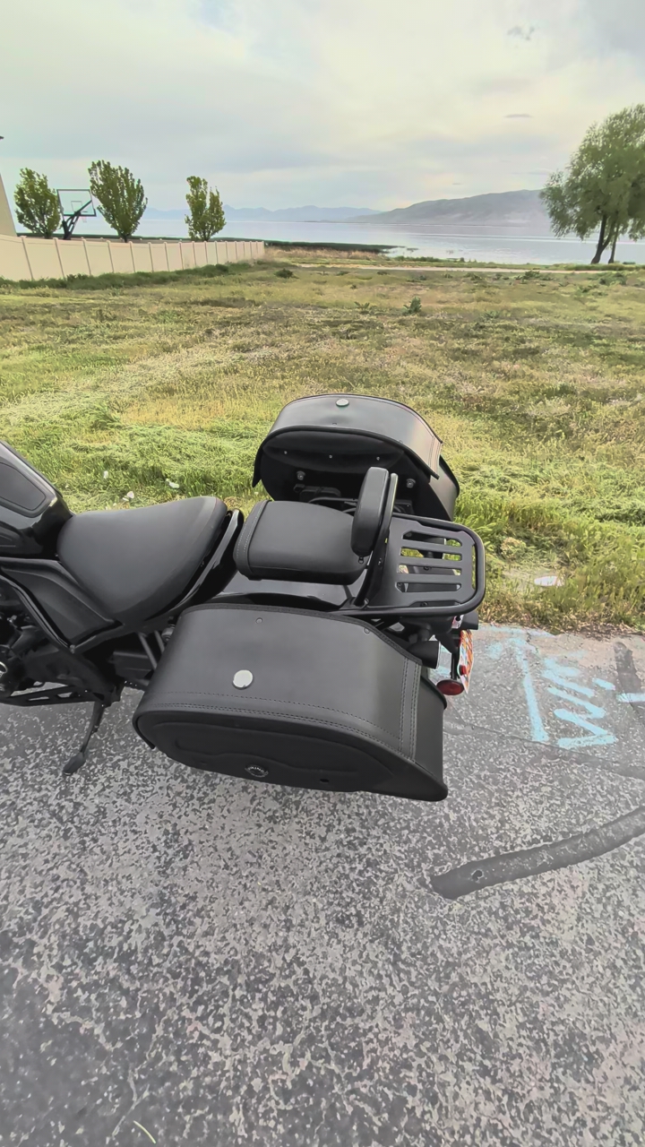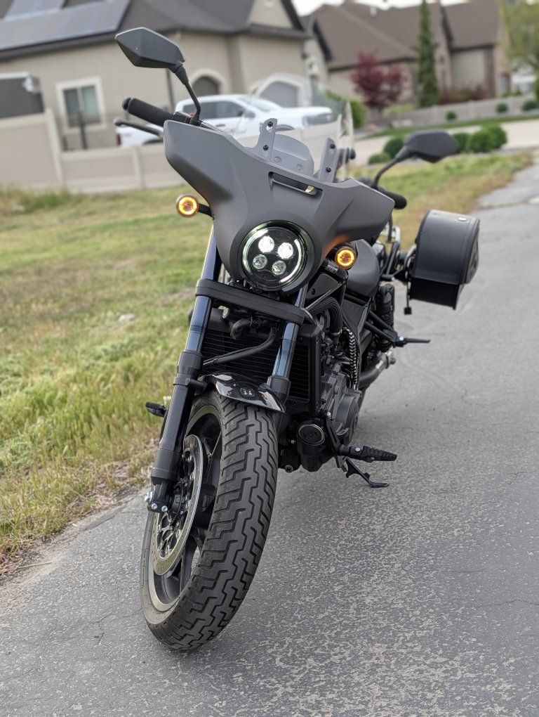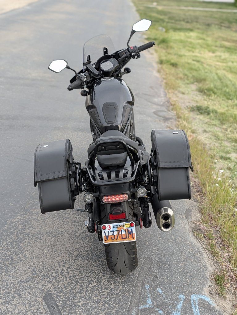 -De Pretto Moto forward controls with oversize foot pegs (much better leg room and cruiser feel) -Viking Bags Warrior quick-detach leather saddlebags (look great and super easy to take on and off) -Rear carrier, extra passenger seat, passenger footpegs, and backrest (ready for two-up rides anytime) -Batwing front fairing with windscreen (way better wind protection on the highway) -Anti-fatigue hand grips (less vibration on longer rides)