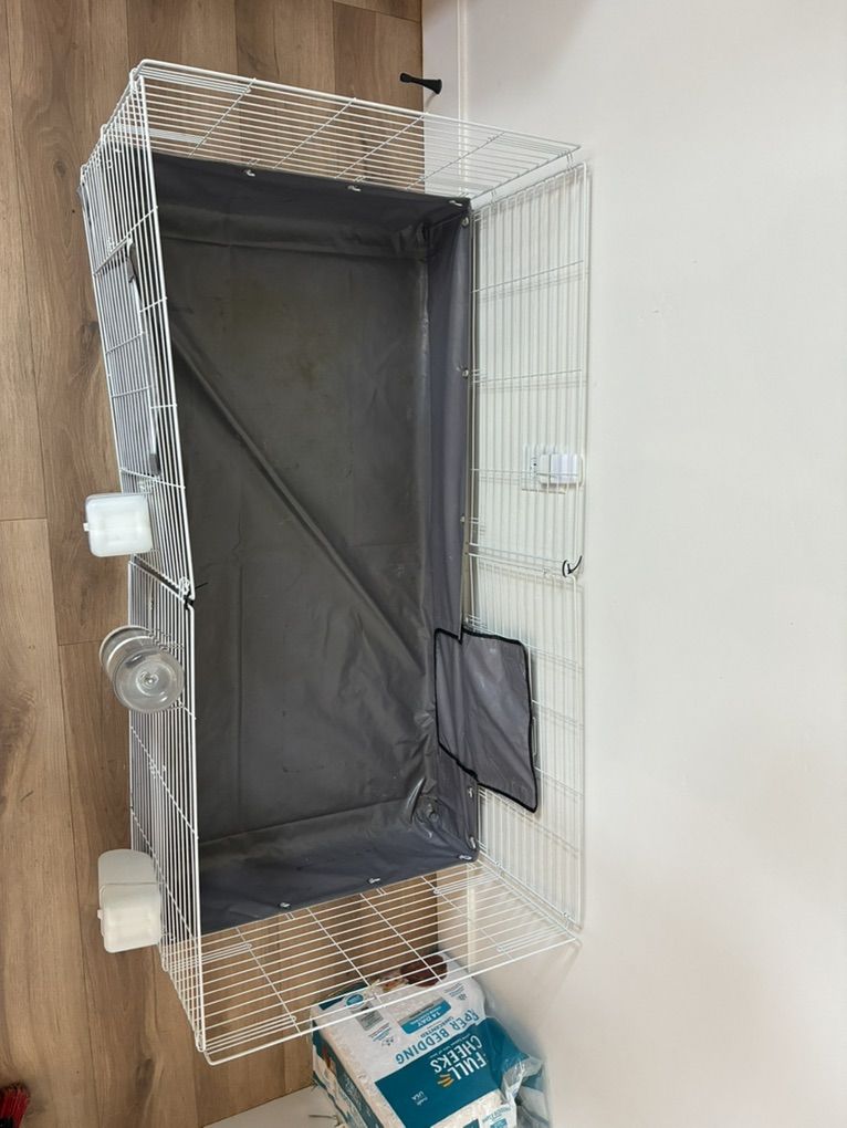 This is a fully set up guinea pig habitat with all essentials included, clean and ready to go: • Spacious cage • 3 hay feeders • 3 water bottles • Timothy hay (partial bag) • Bedding (partial bag) • Large igloo hide • Small pet playpen for exercise time • A copy of our exotic pet Vet- provided diet/vegetable guide for proper nutrition.