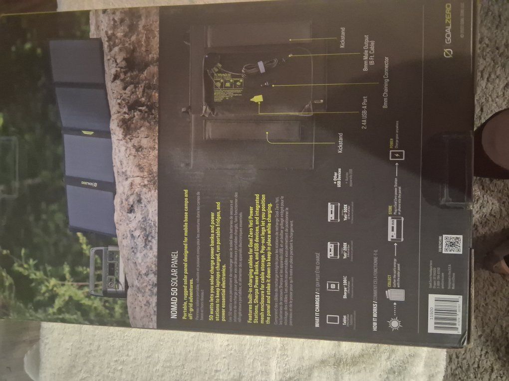 VenmoThe device in your image is a Goal Zero Nomad 50, a 50-watt portable, foldable solar panel designed for camping and off-grid use Goal Zero Goal Zero +1 . It features four monocrystalline panels that fold into a compact, weather-resistant case Goal Zero Goal Zero +1 . Key Specifications Power Output: 50 Watts Goal Zero Goal Zero +1 . Weight: Approximately 6.85 lbs (3.1 kg) Goal Zero Goal Zero +1 . Dimensions: Unfolded: 17 x 53 x 1.5 in (43.2 x 134.6 x 3.8 cm) Goal Zero Goal Zero +1 . Folded: 17 x 11.25 x 2.5 in (43.2 x 28.6 x 6.4 cm) Goal Zero Goal Zero +1 . Ports: Includes a USB-A port (5V, up to 2.4A) for direct device charging and an 8mm solar port (14-22V, up to 3.3A) for power stations Goal Zero Goal Zero +1 . Chainable: You can connect up to three panels for a total of 150W output YouTube YouTube +1 . Performance & Compatibility This panel is ideal for charging small electronics directly via USB or pairing with portable power stations like the Goal Zero Yeti or Sherpa Power Banks Goal Zero Goal Zero +1 . Typical Charge Times: A Yeti 200X can be charged in about 4–8 hours, while a Yeti 500X may take 12–24 hours depending on sun conditions . Current Pricing As of April 2026, the Nomad 50 typically retails for $249.95 . You can find it at retailers such as: Goal Zero Official Site ($249.95) Goal Zero Goal Zero