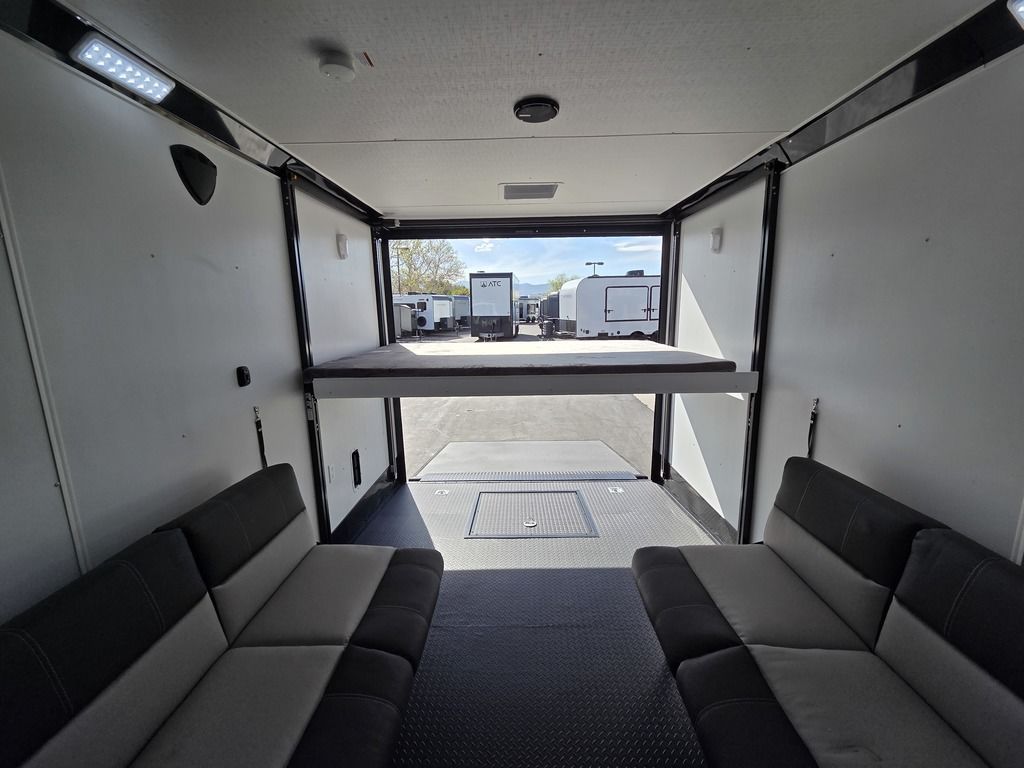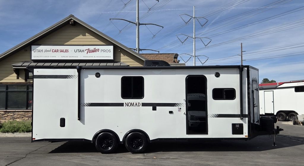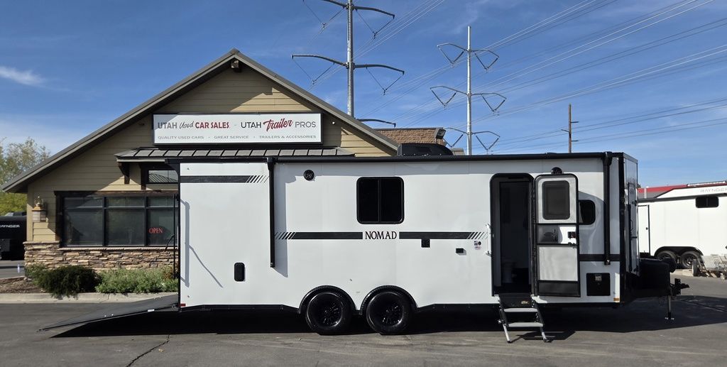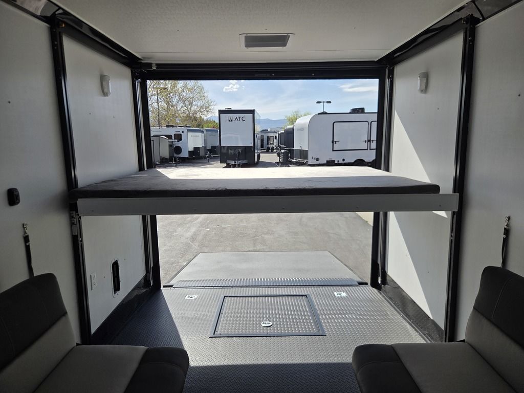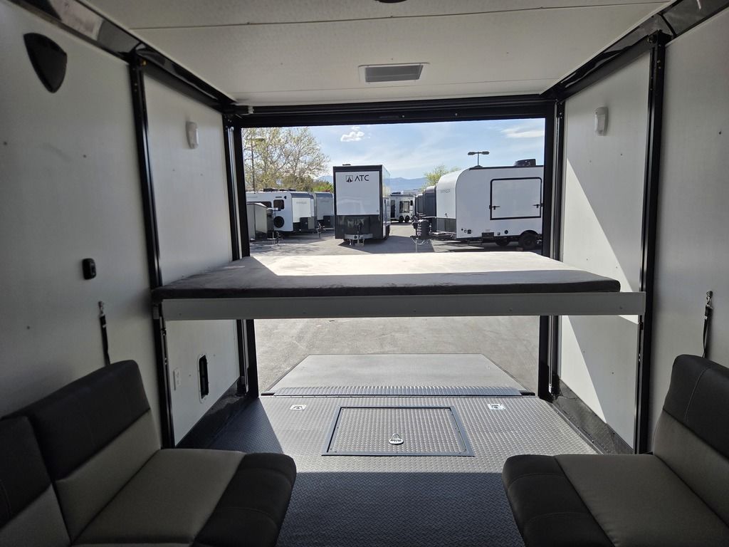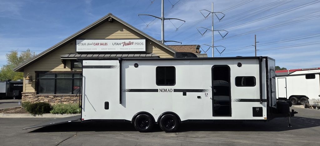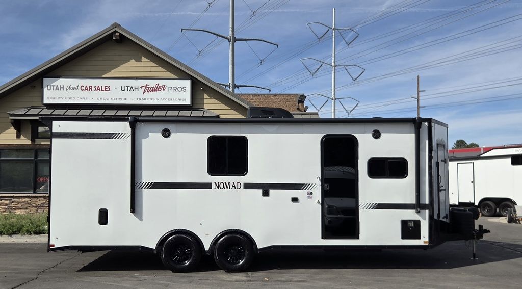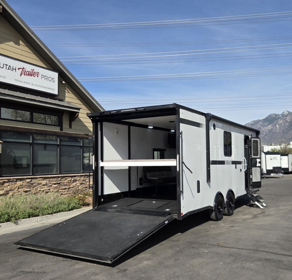 LIMITED TIME $572 A MONTH WITH ZERO DOWN WITH OUR SPECIAL LOCAL CREDIT UNION PARTNER!!! NO PRE-PAYMENT PENALTIES!!! !! NEW NOMAD 24FK MODEL!!! WILL FIT ANY STOCK SIDE BY SIDE UTV!!! 12,000# GVWR/6k AXLES!!! FULLY INSULATED!!! HEATING AND A/C!!! STEREO!!! 7FT-6" Interior Height/ 36" Wedge Front 2x6 Tube Steel Main Rails 16" O/C Floor Tube Crossmembers 16" O/C Steel Tube Wall Studs 24" O/C Tube Steel Roof Bows 18" Extended Triple Tube A-Frame Lippert Torsion Axles w/32 Deg Down Start Angle 6000# Axles w/ST235/80R16 Tires (TA4) 40" Spread Axles Electric Brakes 2-5/16 Adjustable A-Frame Coupler 5000# Electric A-Frame Tongue Jack 4000# Rear Cableless Ramp Door w/Steel Flap (2) Roof Vent in Living/Garage Area (1) Prep & Wired for A/C - Main A/C only 12V Roof Vent in Bathroom Painted Tongue/Rear Sill Black (1) Pair Rear Stab Jacks Rear Flare w/(2) 12V Loading Lights 48" Beavertail ****PLUMBING****46 Gallon Fresh Water Tank (2) 43 Gallon Waste Holding Tank Sewer Hose Storage Compartment Double 20# LP Bottle w/Cover on A-Frame 6 Gallon DSI LP Gas/Electric Water Heater 12V Water Pump City/Gravity Water Fill Hook Up Outside Shower and RV Toilet Bathroom Mirror & Robe Hooks 24x36 Shower w/Shower Curtain & Surround Drop-In Cook Top Large Single Bowl Kitchen Sink Tank and Battery Monitor Panel ****ELECTRICAL****7-Way Electical Plug LED Strip Taillights/Marker Lights 12V Deluxe LED Lighting 45 Amp RV Power Center w/12V Converter 30 Amp Motorbase Plug Detachable Twistlock Power Cord Battery Box Only (Battery not included) 110V GFI Receptacle in Kitchen Area (2) 110V Receptacles in Garage Area Dual USB Ports in Kitchen 6 Cubic Foot Refrigerator Microwave Oven 35K BTU Furnace 110V Exterior GFI Receptacle TV Prep Package - Includes: Coax Cable Outlets - Interior & Exterior Omnidirectional TV Antenna UHF/VHF 110V 4FT LED Cove Lights in Living/Garage Area Smoke, CO, & LP Detector & Fire Extinguisher *INTERIOR*3/4" Drymax Floor & 3/8" Wht Vinyl Walls Ploystyrene Foam Insulation-Walls & Ceiling ATP Rubber Floor Covering White Vinyl Ceiling Liner w/Black Cove Molding Black Kitchen L-Base Cabinet w/Laminate C-Top Black Kitchen L-Overhead Cabinet (4) 5000# Recessed D-Rings Large Front Storage Area w/Shelf (1) Pair Black Aluminum Directional Vents ****ROOF****Seamless Aluminum Flat Top Roof LED Marker Lights Rear Flare w/(2) 12V Loading Lights ***METAL**.080 Screwless Armor Shield Composite Skin STD Colors:Crystal White, Black, Matte Black Windstar Silver, Victory Red, Pewter, Charcoal 3" Heavy Duty Flat Top Trim 3" Flat Bottom Trim & 6" Barrier Tape All Black Exterior Trim & ATP Fenders 24" Tall Slanted Diamond Plate Stoneguard 24" Tall Diamond Plate along sides at bottom (1) Pair Black Aluminum Directional Vents *DOORS & WINDOWS****26W x 78H Radius Corner Deluxe RV Door w/Window & Screen Aluminum Door Holdback Double Fold Out RV Step 4000# Rear Cableless Ramp Door w/Steel Flap All Black Zinc Coated Door Hardware 24Wx72H Door w/Barlock in Front Storage 30x15 Window in Kitchen Area 30x30 Window in Living/Garage Area 30x22 Egress Window in Living/Garage Area Window Coverings - In Garage Area (Only) ****FINAL*LED Strip Tailights/Marker Lights 12V Deluxe LED Lightning Black Aluminum Wheels w/Radial Tires & Black Center Caps Recessed Spare Tire Compartment Limited 3 Year Structural Warranty 01-OPT1.952 Platinum Package Includes: Deluxe Stereo Package with: AM/FM/CD/DVD/USB/MP3/WMA Capable Stereo, (4) Hi Output Weatherproof Speakers (2) Interior & (2) Exterior 43" TV w/swivel bracket Rear Hide-A-Screen Solar Port HappiJac Bed Lift System: (Includes (1) Queen Mattress Setup) 7SE103718