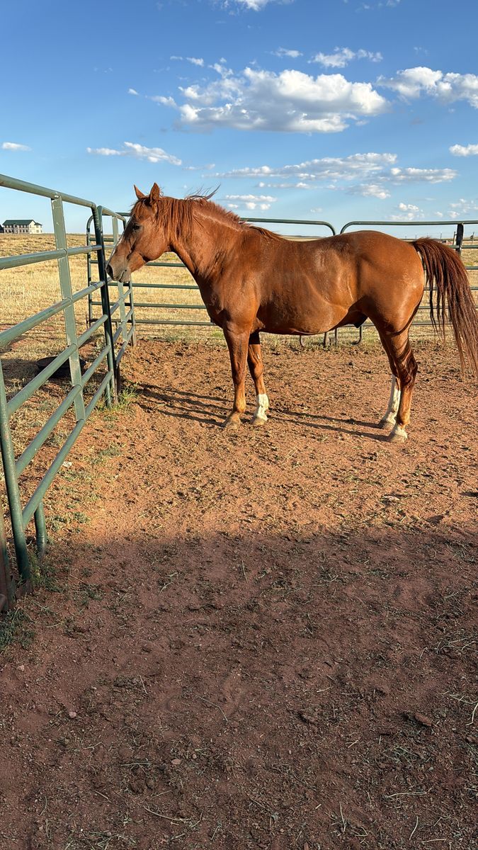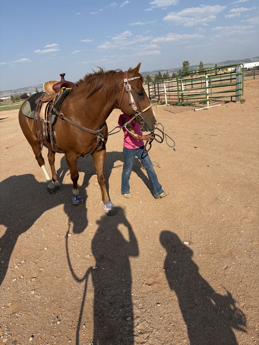 19-year-old grade gelding barrels, poles, and goat tying. He is about 14h. He’s been there, done that, and knows his job. Not for a beginner, would be best suited for a handy 10-15 year old.