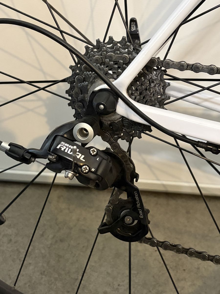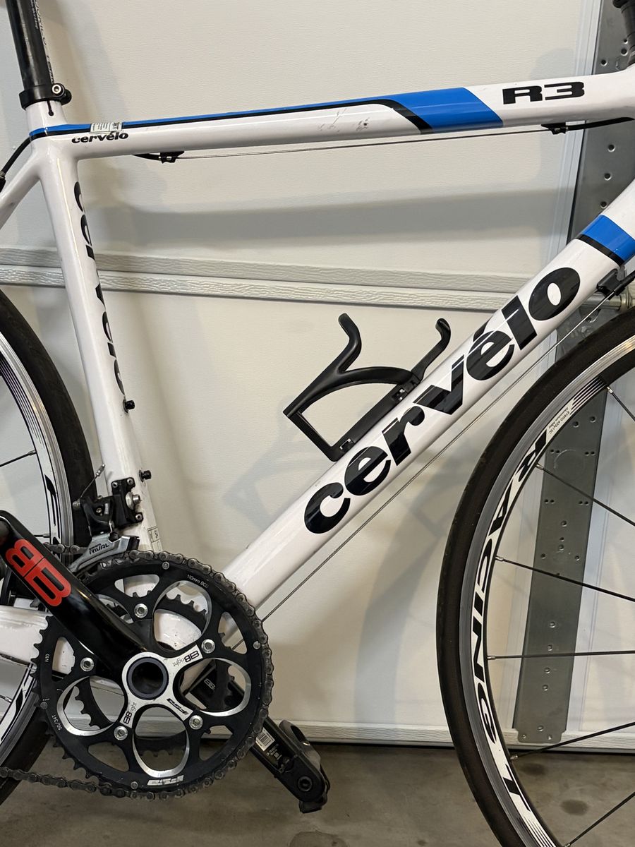 ZelleExcellent condition, lightly used. Carbon tubing, SRAM Rival cassette/shifters/brakeset. Description: Famous for carrying Fabian Cancellara and Stuart O'Grady to victory in the grueling Paris-Roubaix, Cervelo's R3 offers world-class weight savings matched only by its incredible ride quality. Cervelo's rigid Squoval tubes, BBright bottom bracket and Smartwall optimization that adds carbon where it's needed most provide a crisp ride that rockets you forward under even the smallest amount of pedal power. The leaf-spring seatstays and vibration-damping of carbon smooth your ride whether you're gliding over fresh-laid tarmac or hammering over 100-year-old pavevent with the world's fastest rouleurs. Plus, the R3 comes with a tapered carbon fork, 3T seatpost, and 3T aluminum stem and bar, SRAM's admirable Rival group and fast Fulcrum wheels so that you can finish off any race with corner-carving precision and a blazing sprint across the line. Or just a mellow neighborhood cruise!