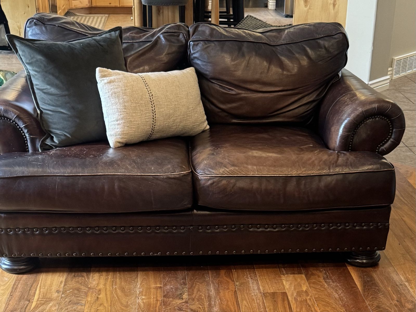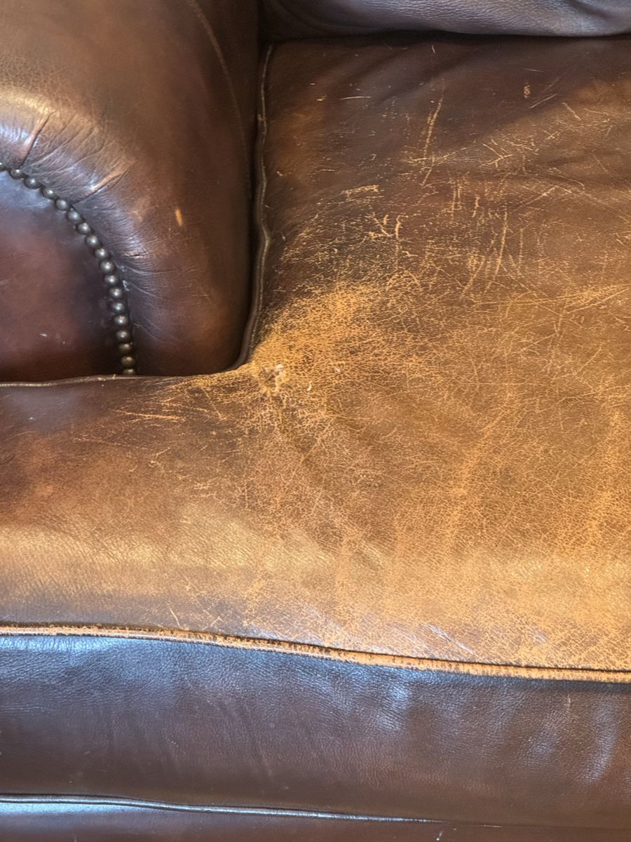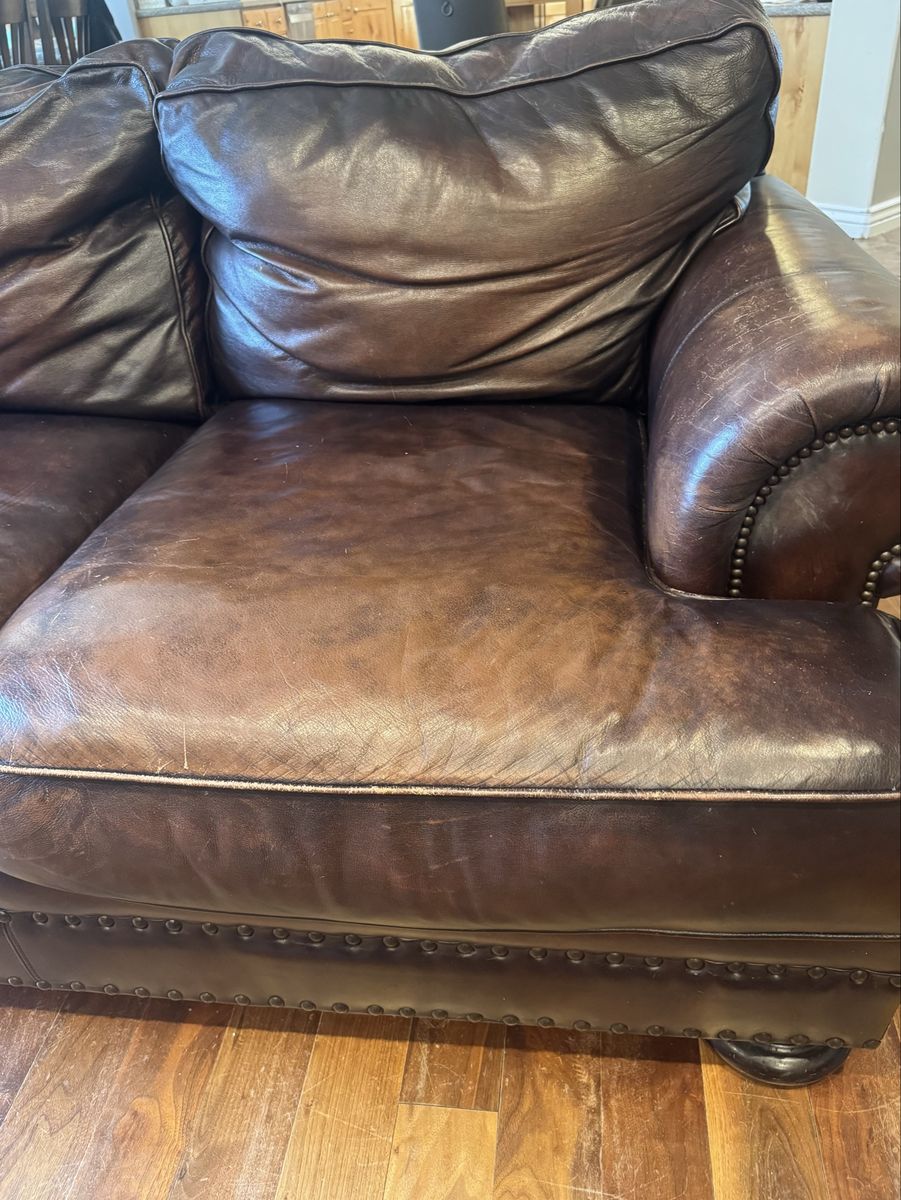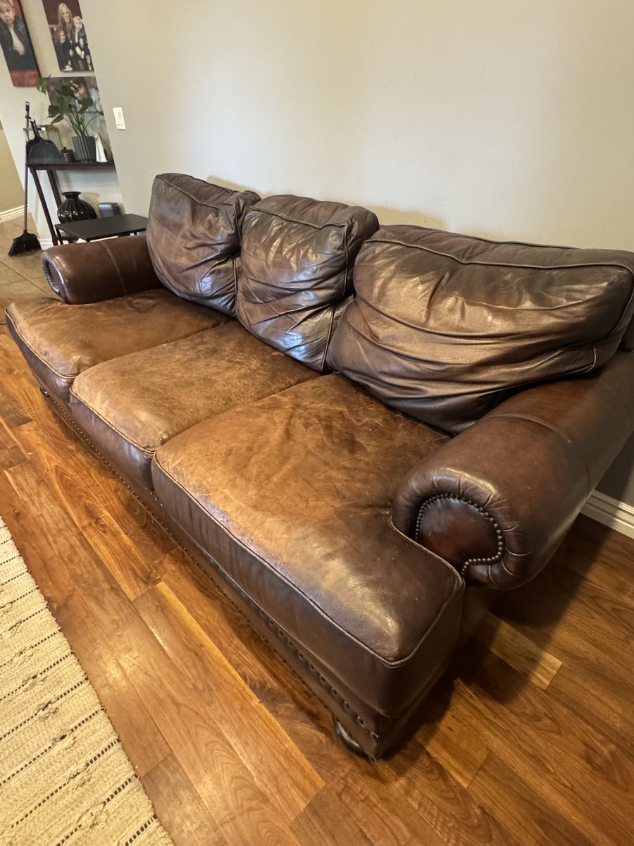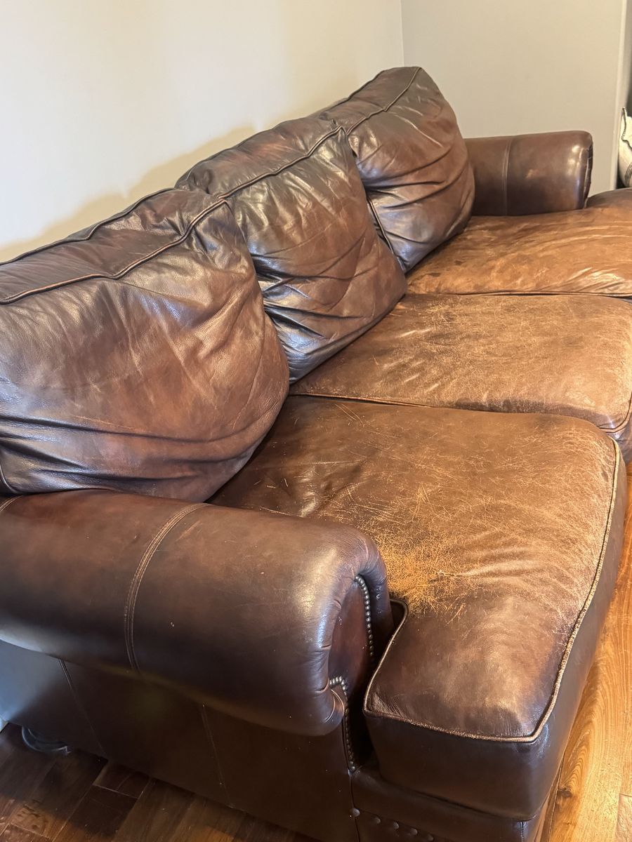 Free leather couch and loveseat. Can not deliver must be able to be picked up. There is a small tear in one cushion that could be patched. Is worn in spots but such a comfy couch if anyone needs it. Thanks