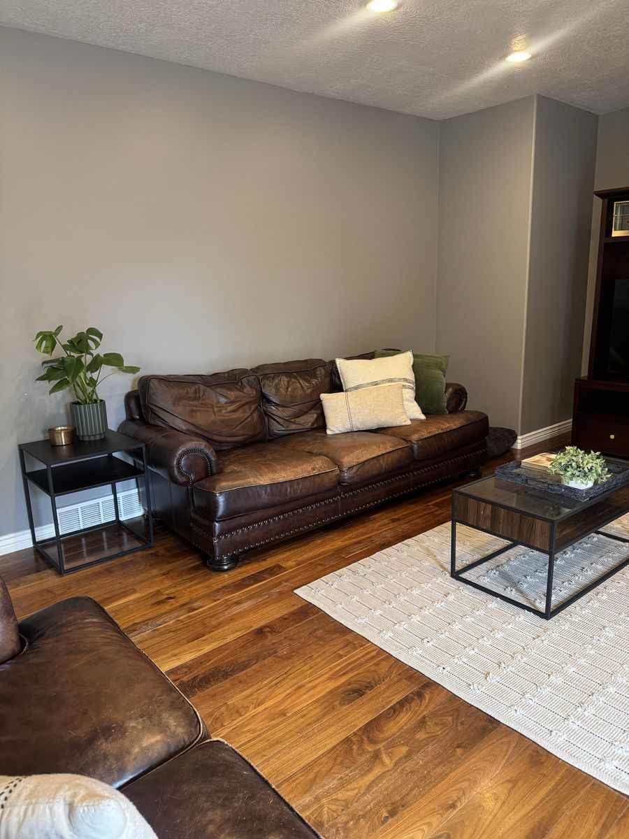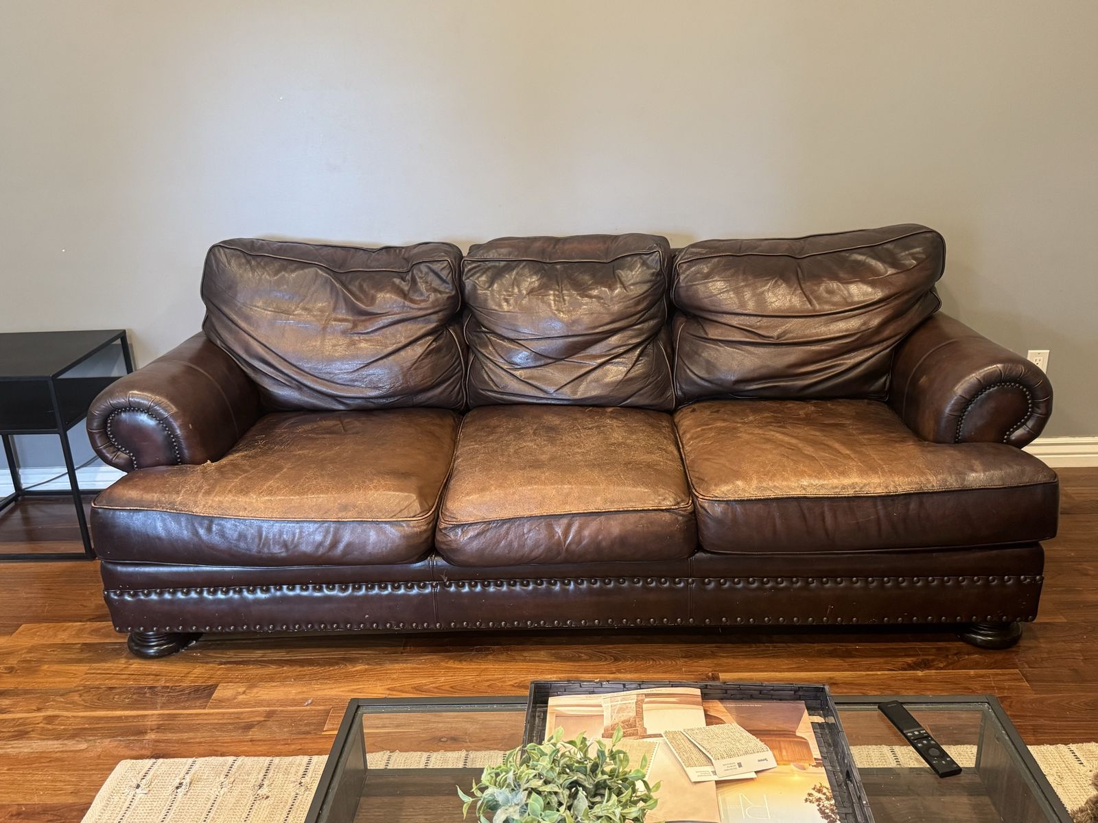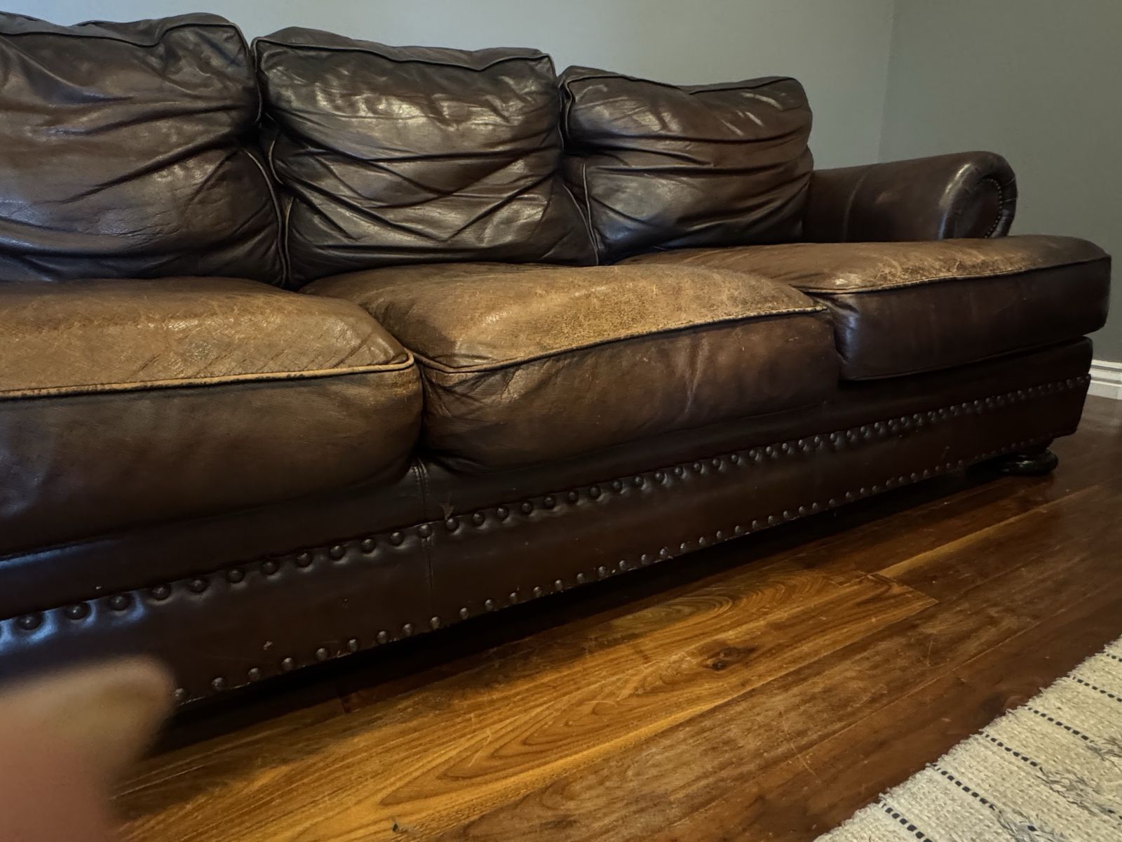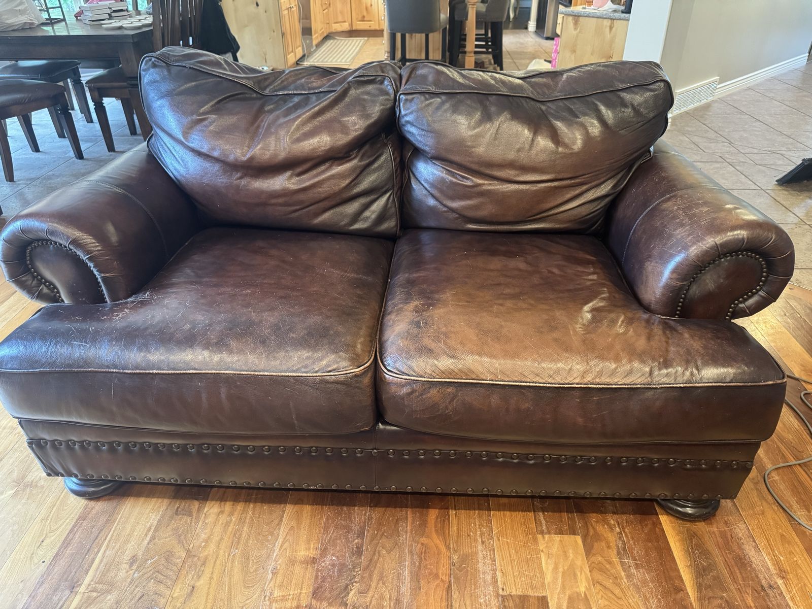 Free leather couch and loveseat. Can not deliver must be able to be picked up. There is a small tear in one cushion that could be patched. Is worn in spots but such a comfy couch if anyone needs it. Thanks