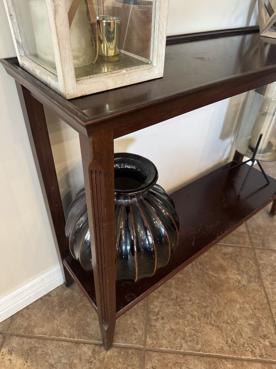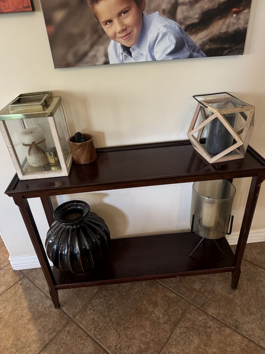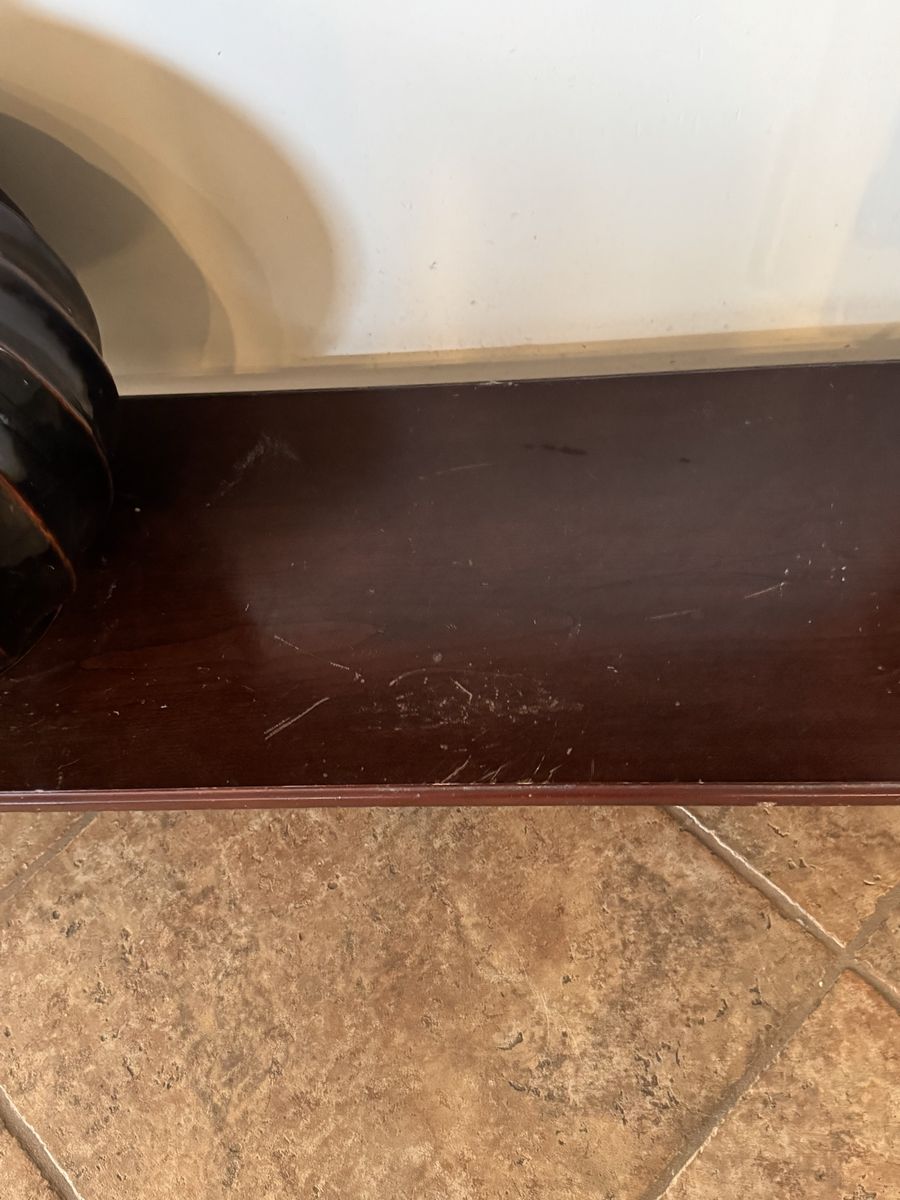 Wood console table. Has some scratches that could be filled in with a touch up pen.