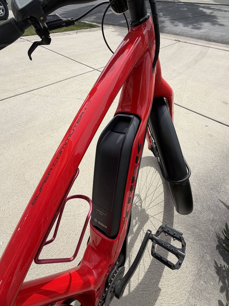 ZelleGently used, class 3 (max 28 mph) pedal assist, dream bike. Nearly new powerful Bosch PowerPack 500 Wh lithium ion battery ($850 paid). Cane Creek Thudbuster suspension seatpost to smooth out bumps, reduce fatigue and back pain by allowing the saddle to move down and back as the bike hits bumps ($175 paid), Description: Super Commuter+ is the electric bicycle that makes getting where you need to go exactly where you want to be. Super Commuter+ pairs our most advanced e-bike technologies with Bosch’s longest lasting battery for a ride that redefines the experience of getting around on two wheels. Key Features - High-performance frame for comfort and control, even at high speed - Bosch Performance Speed motor - Integrated frame-mounted battery for sophisticated looks and ideal balance - Motor Armor to protect your motor in any condition
