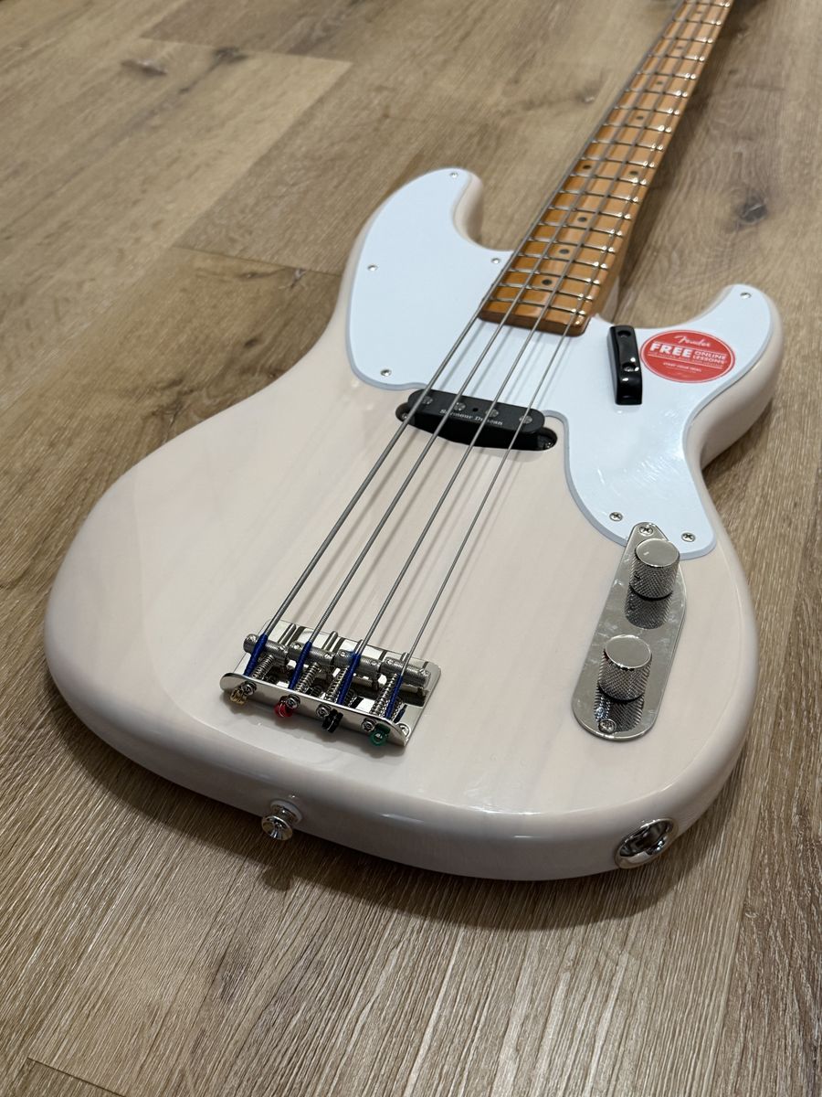A celebration of the birth of the P Bass® in the early 1950s, the Classic Vibe '50s Precision Bass produces massive tone courtesy of its Fender-Designed alnico single-coil pickup. Player-friendly features include a slim, comfortable "C"-shaped neck profile with an easy-playing 9.5"-radius fingerboard and narrow-tall frets as well as a vintage-style bridge with threaded saddles. This throwback Squier model also features 1950s-inspired headstock markings, rich-looking nickel-plated hardware and a slick vintage-tint gloss neck finish for an old-school vibe.