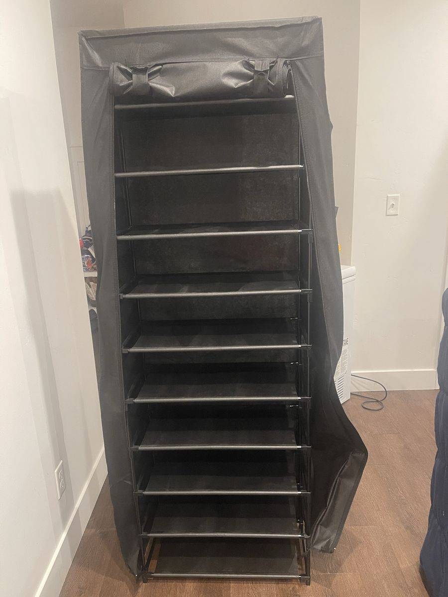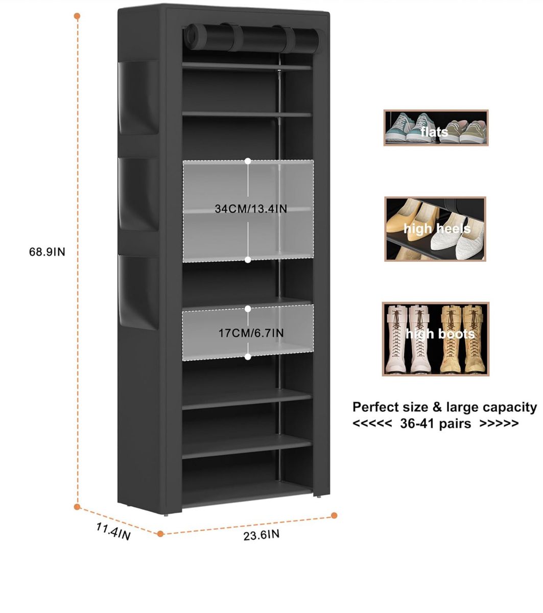 OYREL Large Shoe Rack, Black, 6 Side Pockets, 23.6" Wide x 11.4" Deep x 68.9" Tall, 36-41 Pairs of Shoes. Perfect for the shop or mud room! $25 OBO