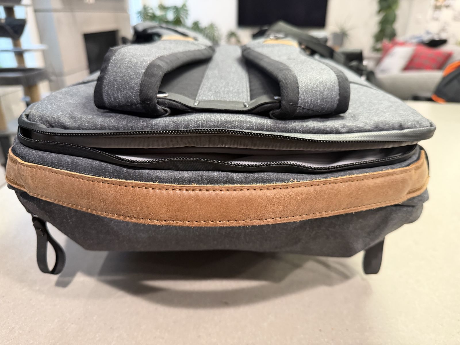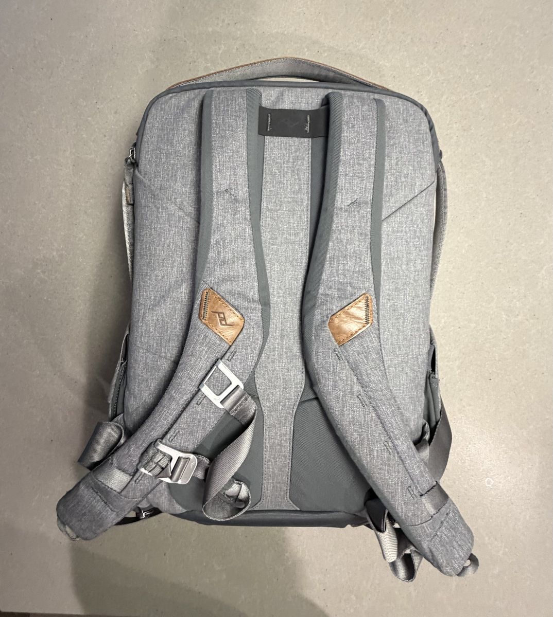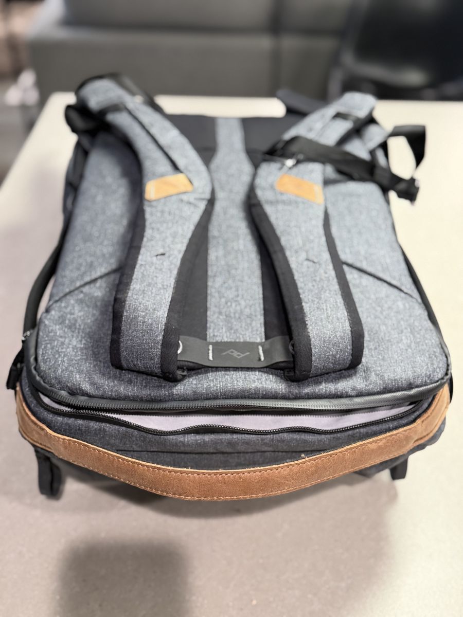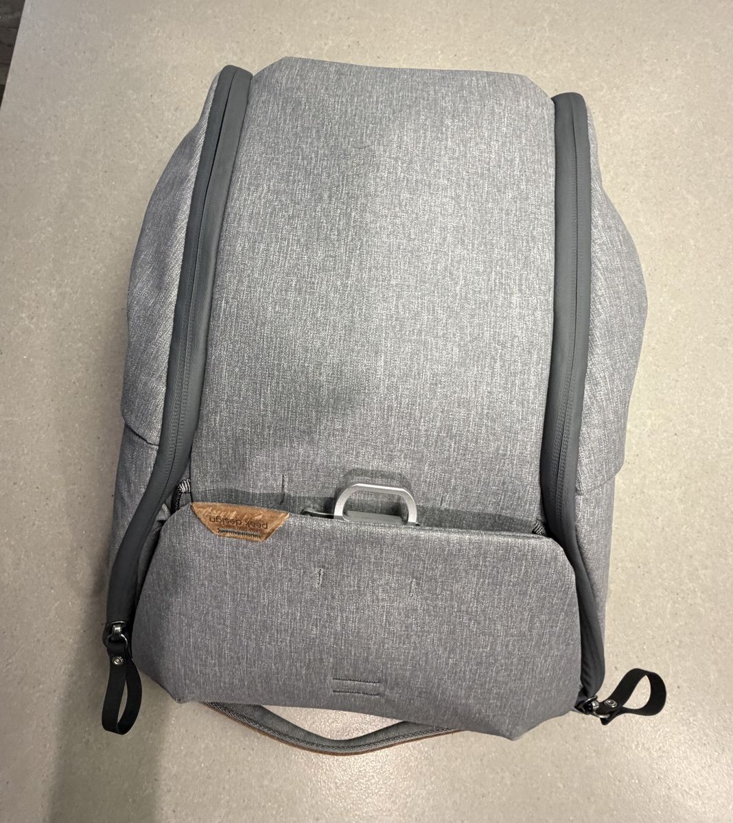 This is the perfect size for a daily carry or a personal item on a flight. It’s super organized and still looks brand new.